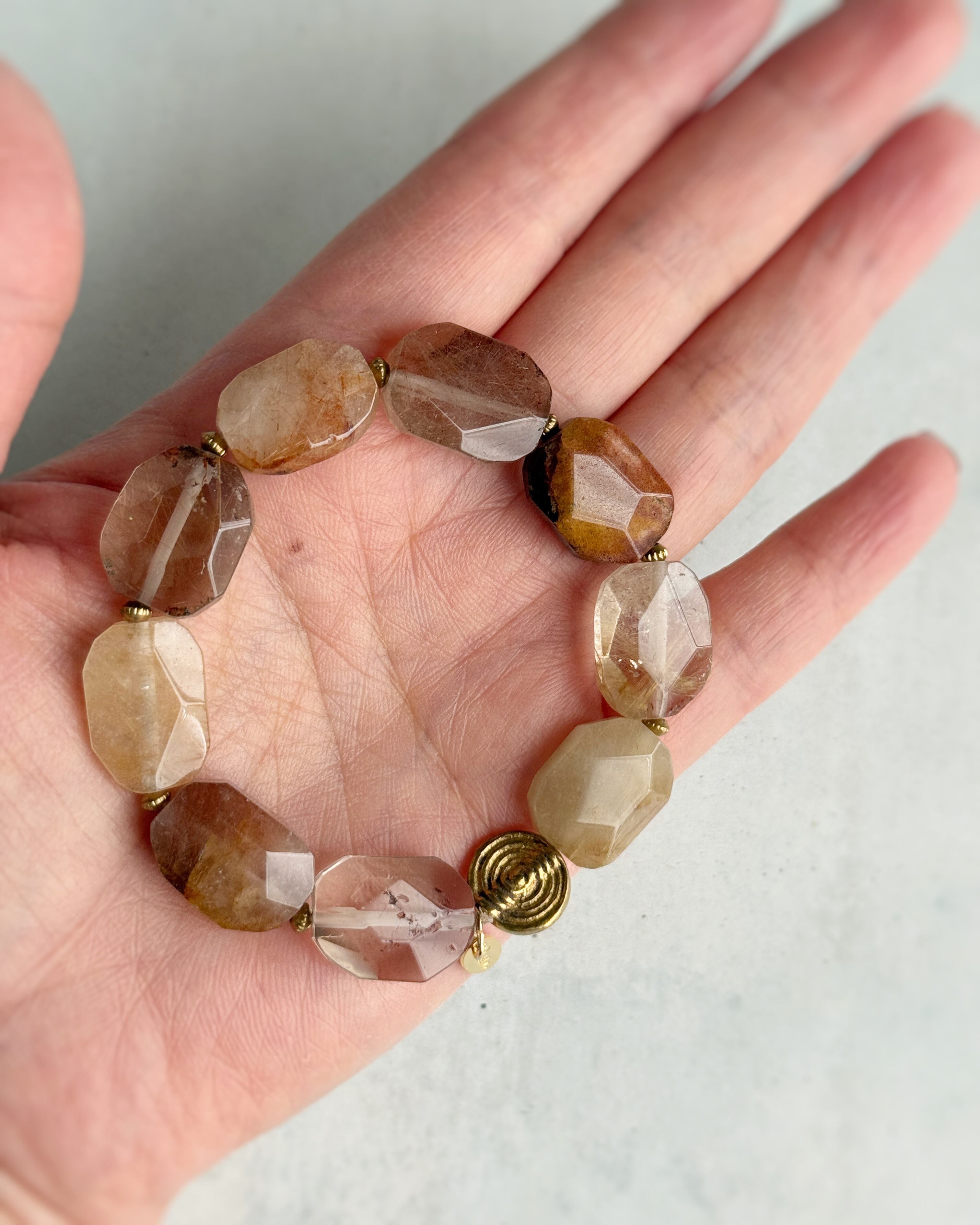 肌に溶け込んでいくような絶妙な透明感と、スモーキーなブラウンが艶っぽいナチュラルクォーツに、シックなゴールドの真鍮ビーズを合わせて。