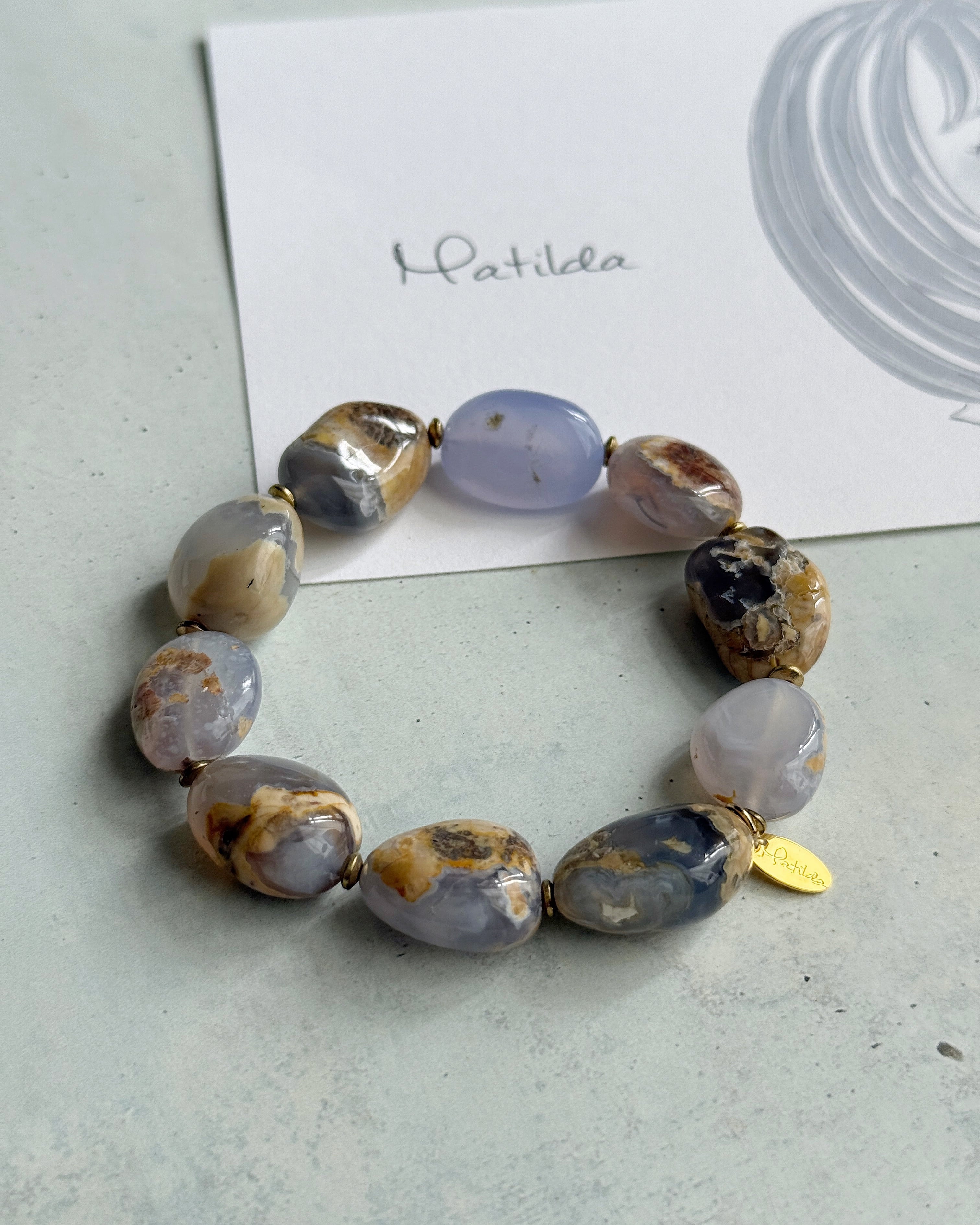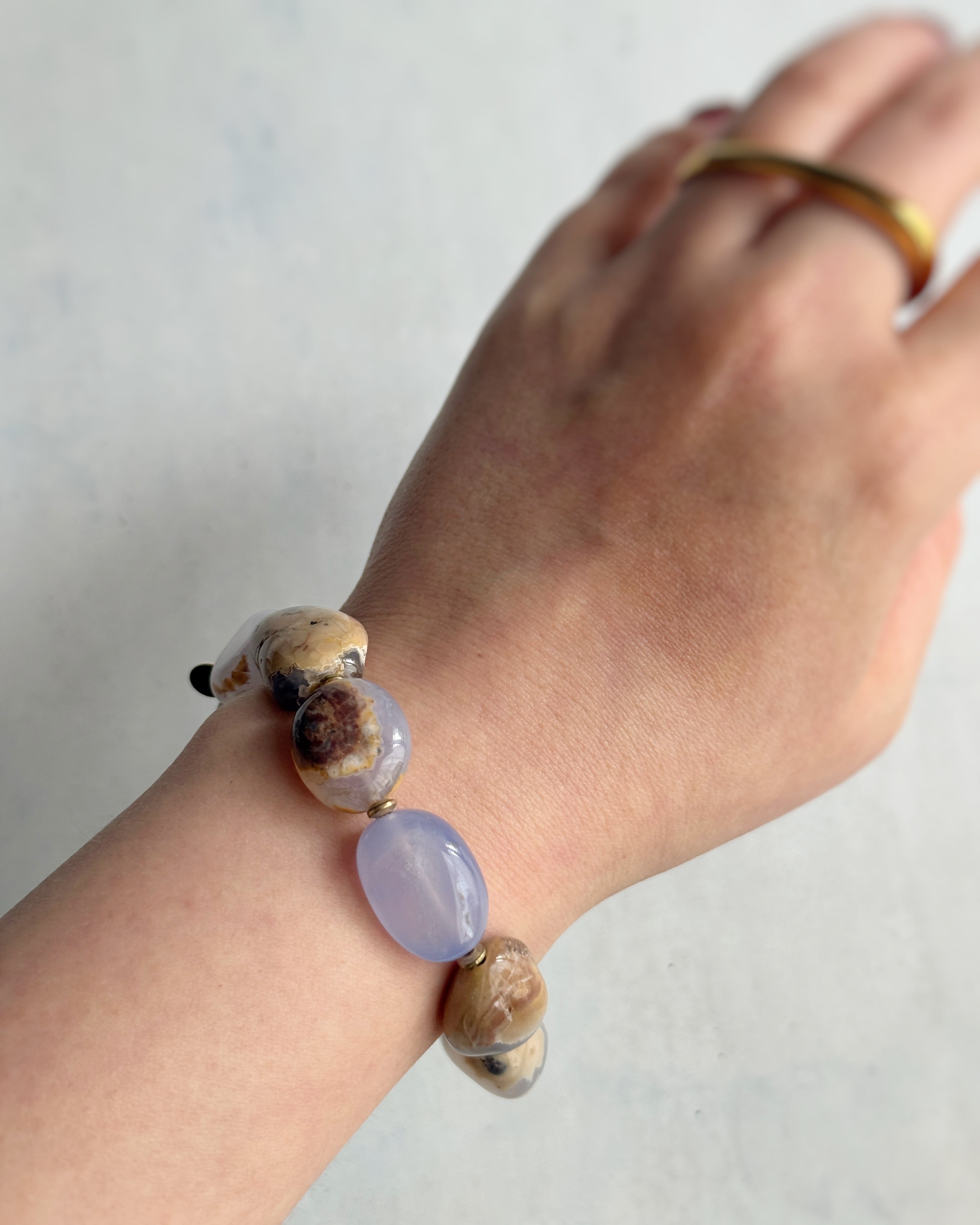 アイシーなスカイテールブルーの透明感と、零れ落ちんばかりのたっぷりとしたみずみずしさが溢れるブルーカルセドニーに、真鍮ビーズのアンティークゴールドを潜ませて。