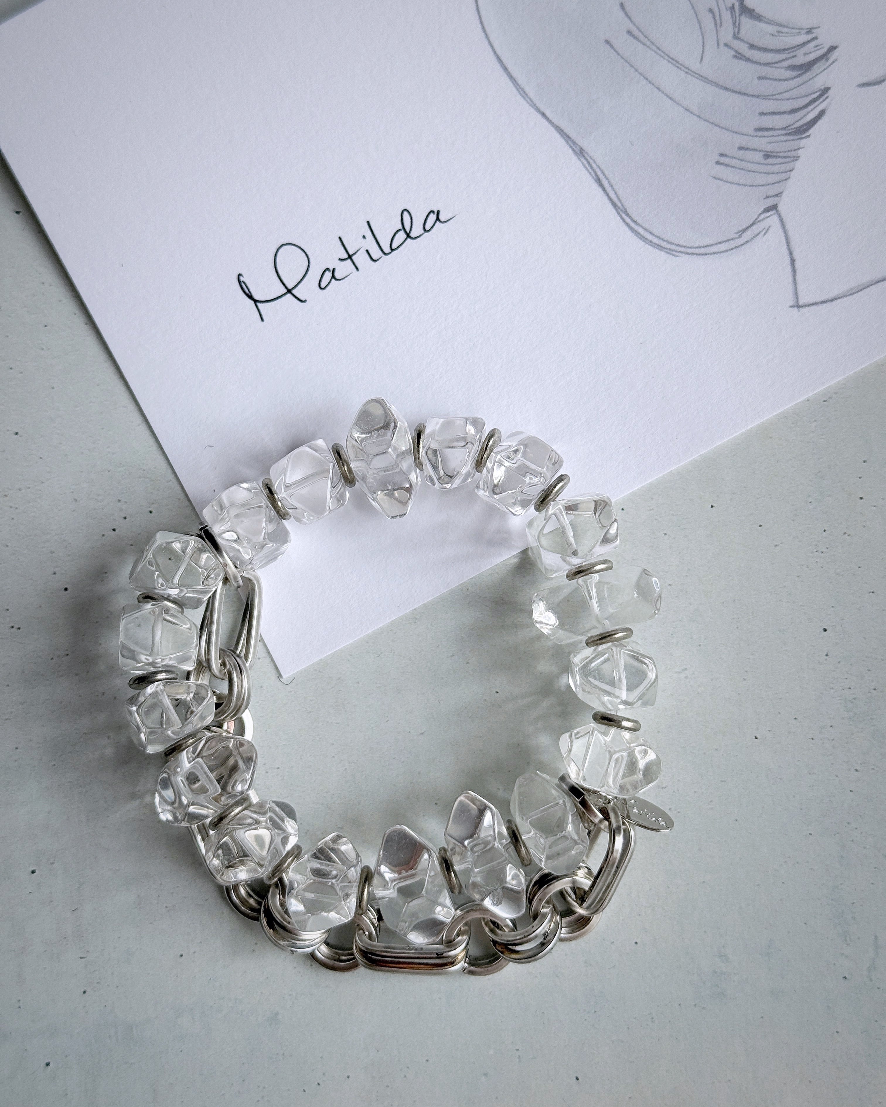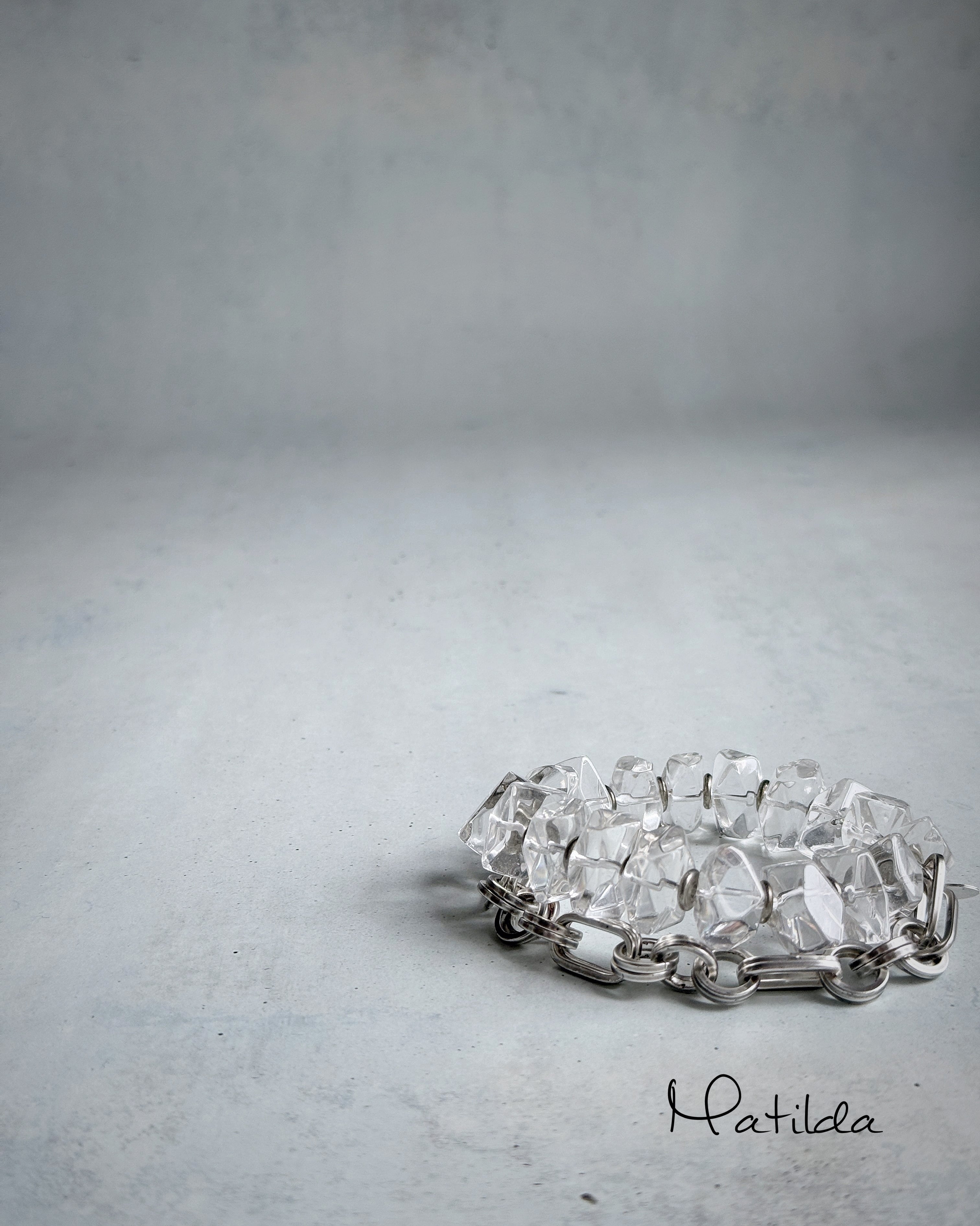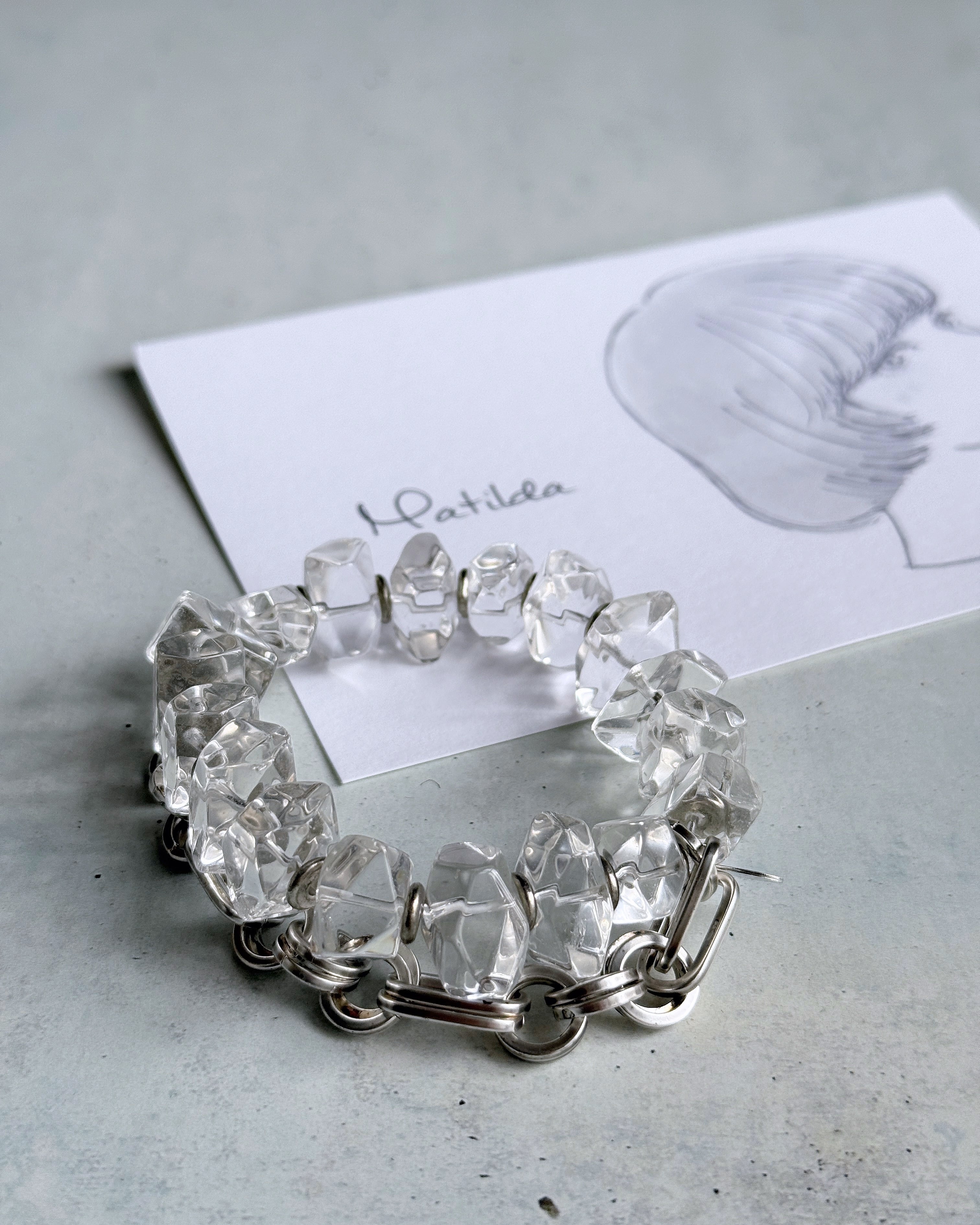 メタルビーズを合わせた透き通るクォーツのラフロックを、2連のパーツが存在感のあるシルバーの真鍮チェーンとペアリング。