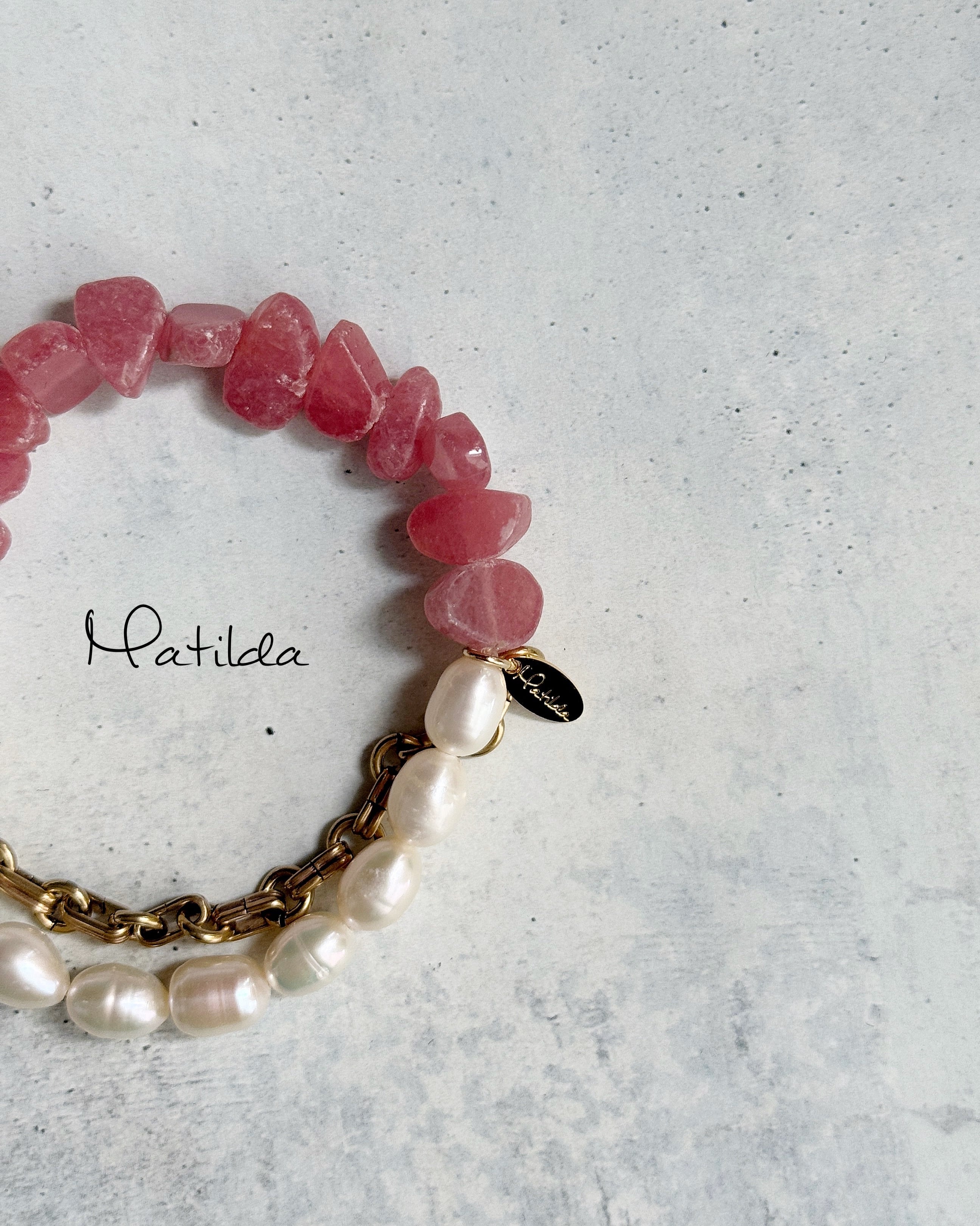 クラシカルなパールと真鍮のゴールドチェーンのレディなペアに、ロードクロサイトのラフロックが抜け感と愛らしい華やぎを添える。