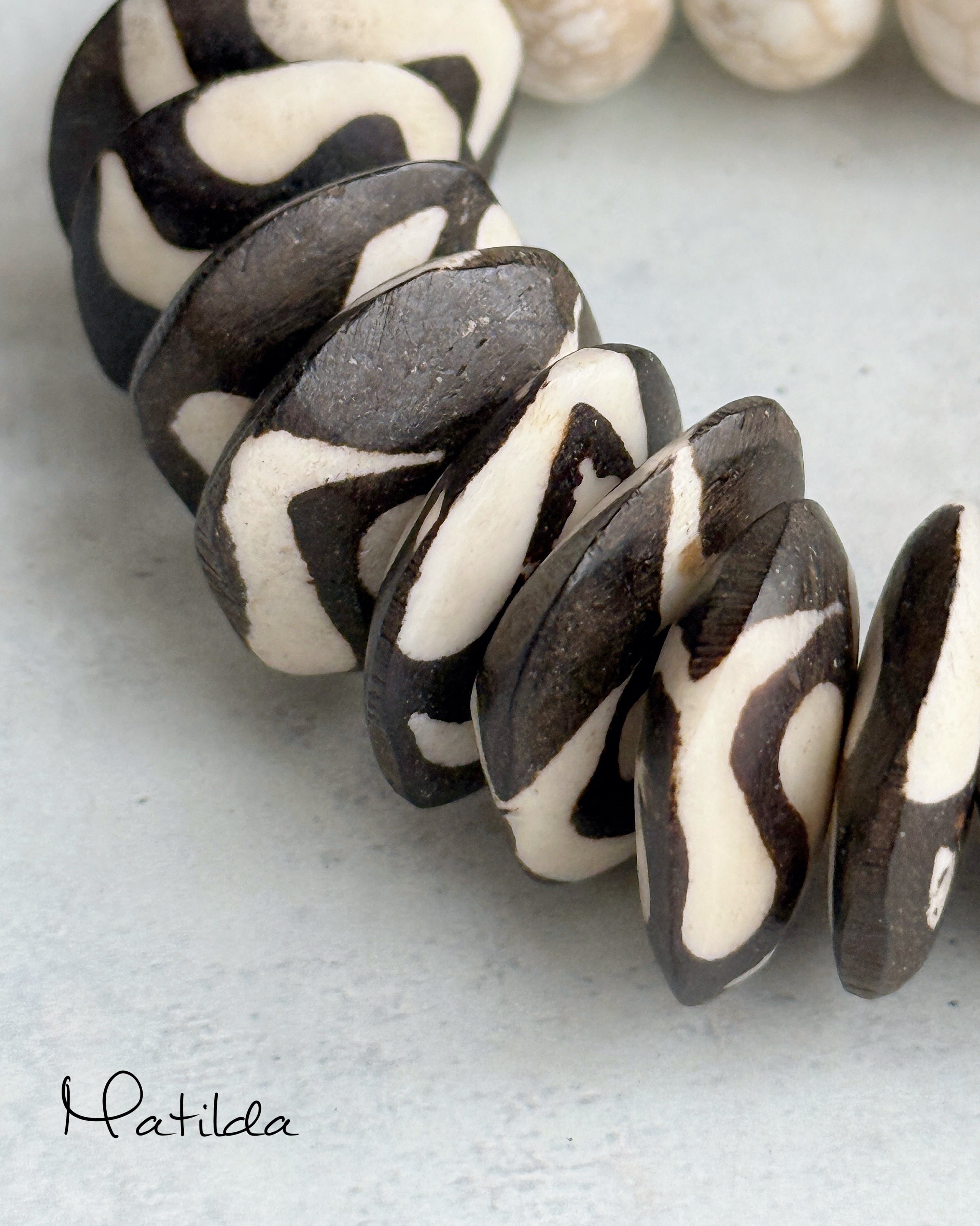 プリミティブな存在感を放つ真鍮ビーズに、絵画のようなブラック×ホワイトのボーンビーズと、ホワイトベージュのマグネサイトを合わせて。