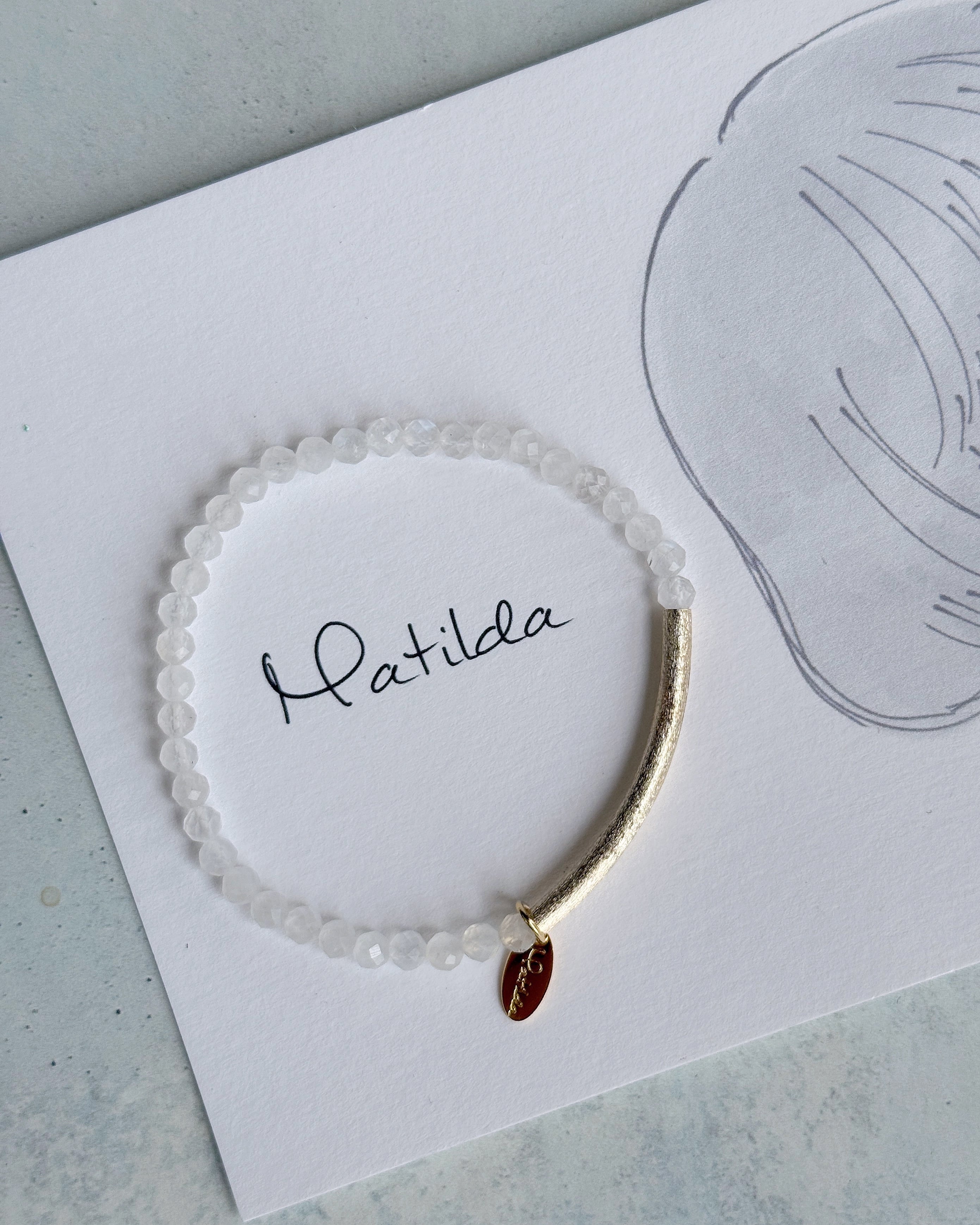 月光を含んだルーセントホワイトに、繊細な多面体カットを施したごく小粒のムーンストーンには、ゴールドの真鍮チューブをペアリング。