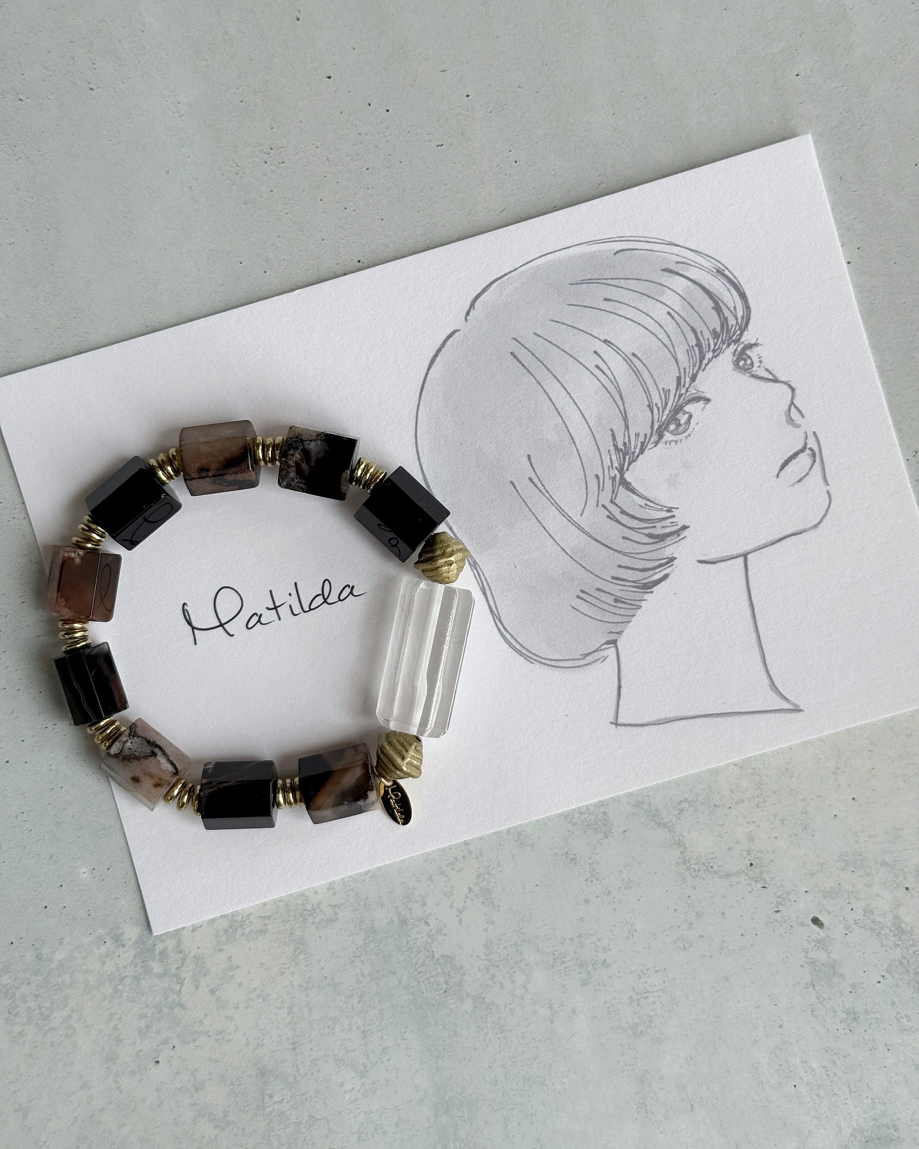 濃密なブラウンブラックに、ホワイトやクリアブラウンのマーブルが揺れるチェリーブロッサムアゲートに、プリミティブなデザインの真鍮ビーズを合わせて、ビッグシェイプのクォーツをひと粒セット。