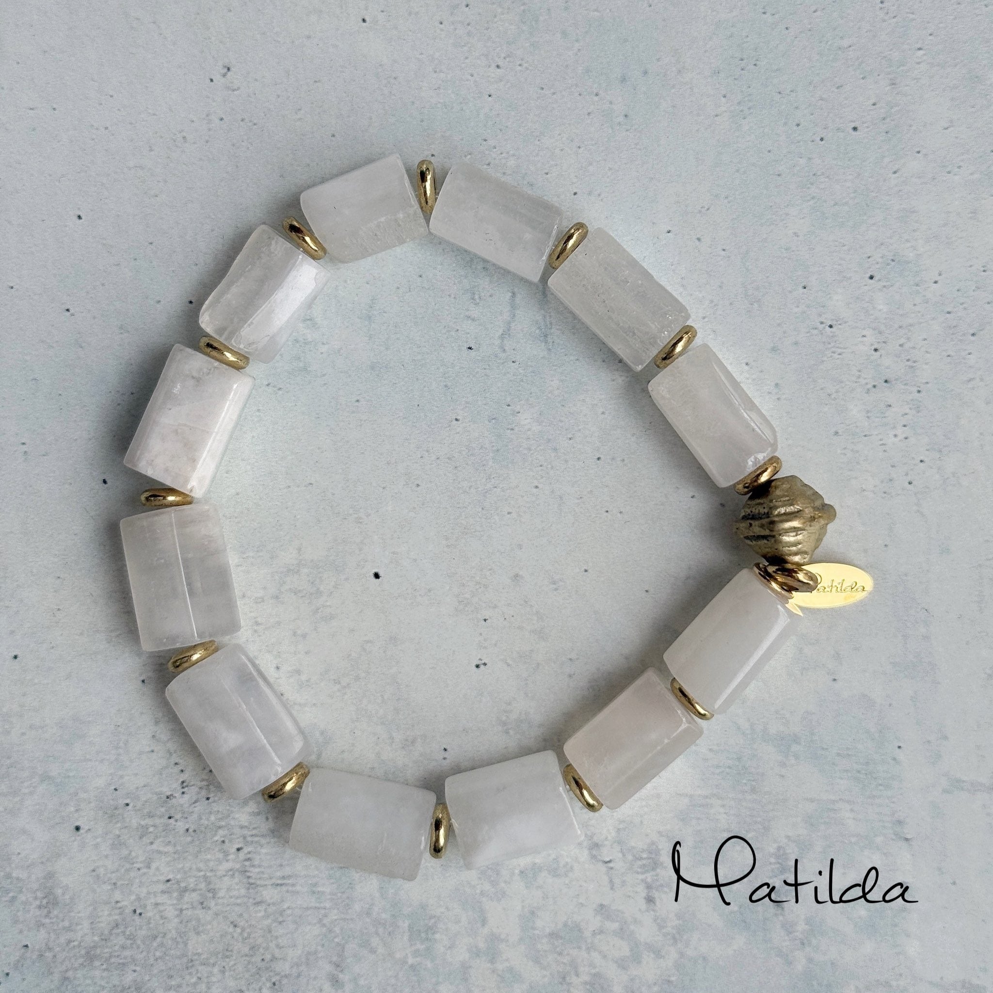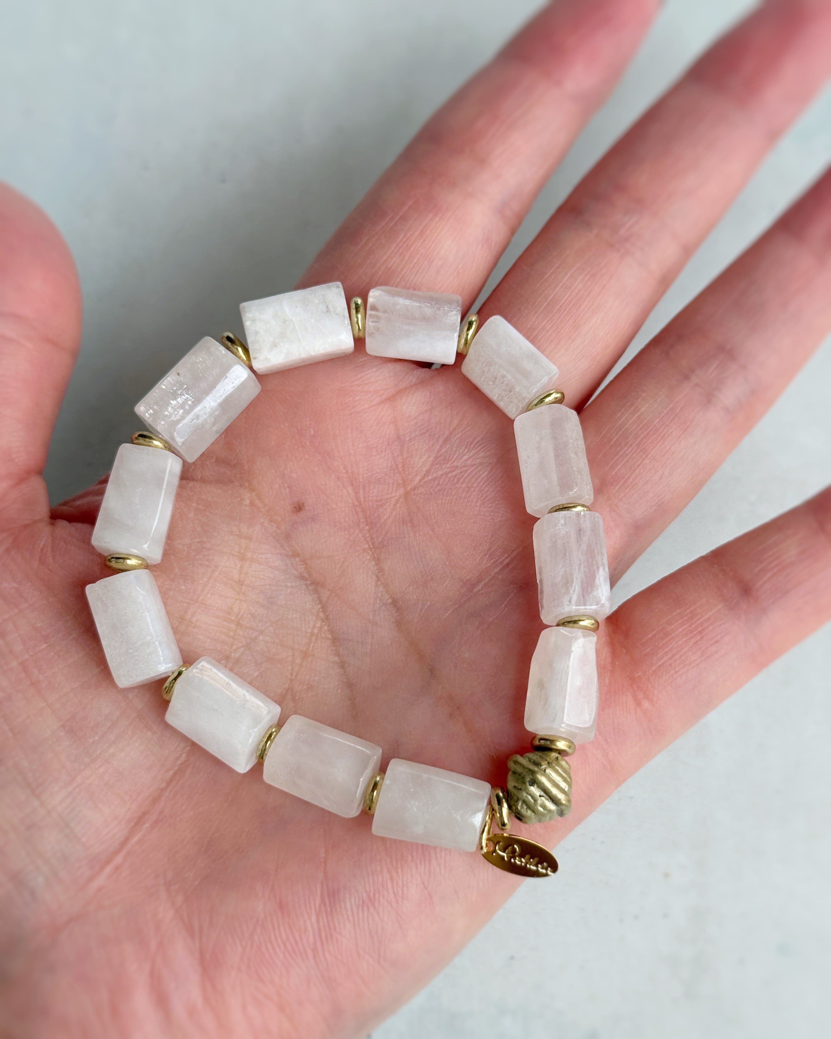たおやかな乳白色に淡いブルーシラーが揺れるレインボームーンストーンに、アンティークのような温もりを感じさせるゴールドカラーの真鍮ビーズを合わせて。