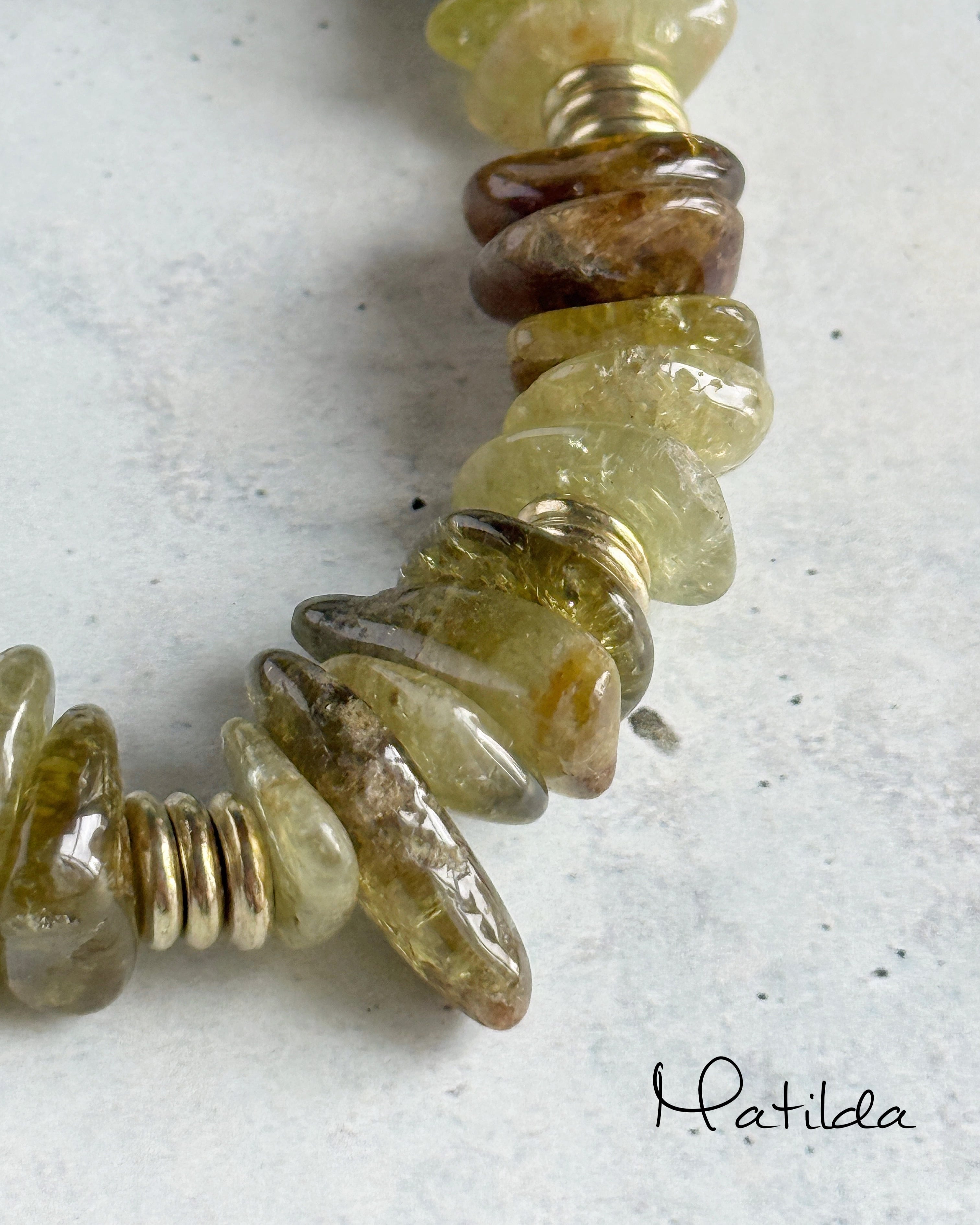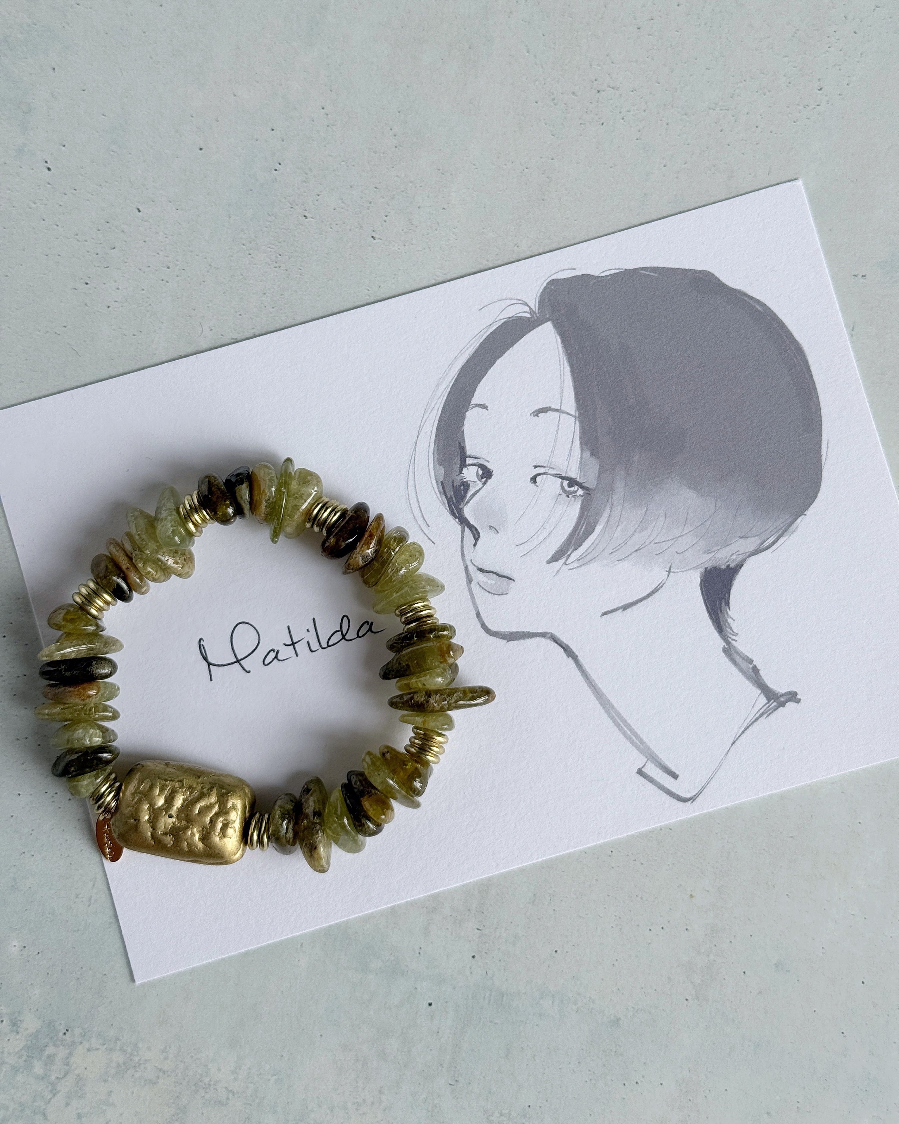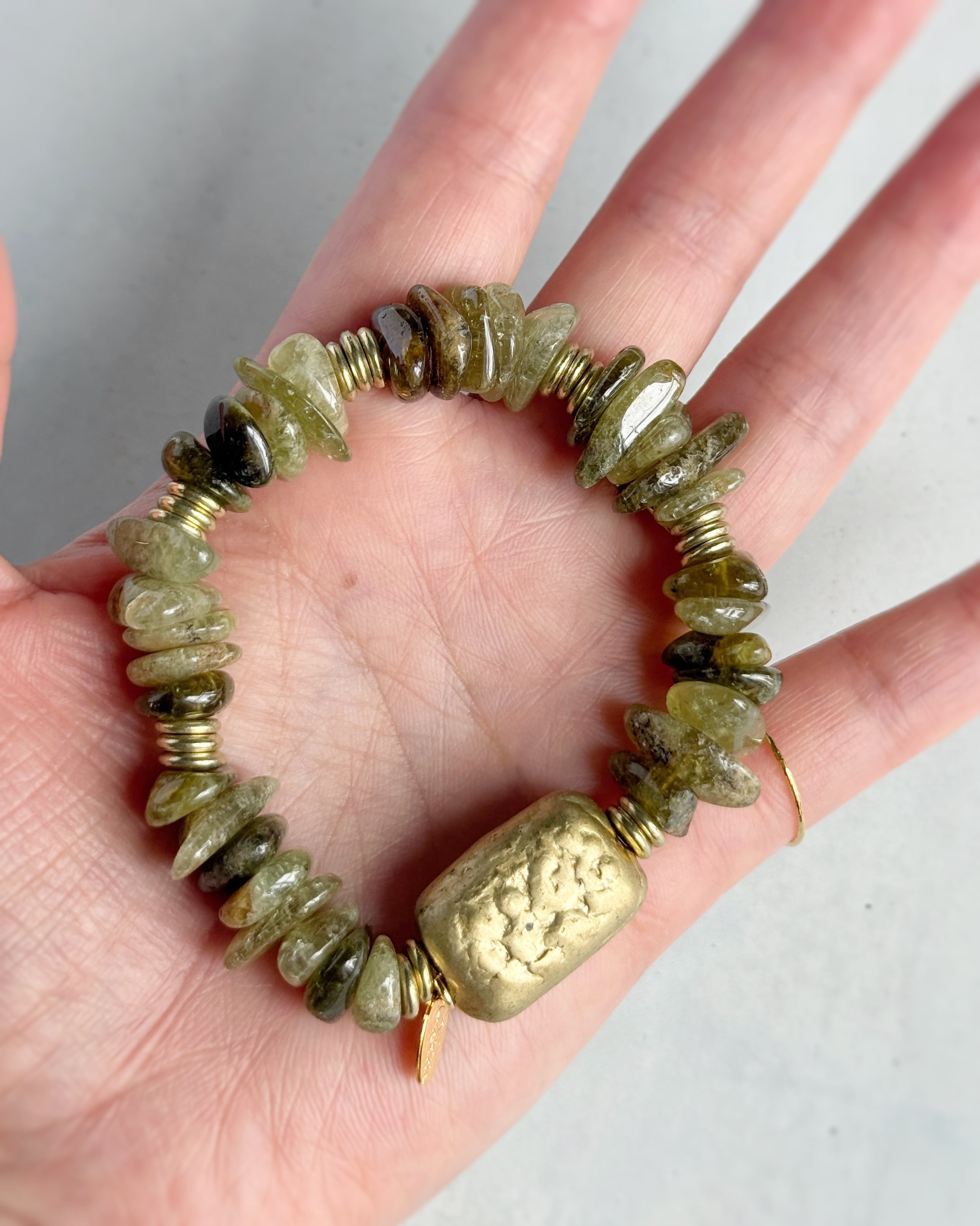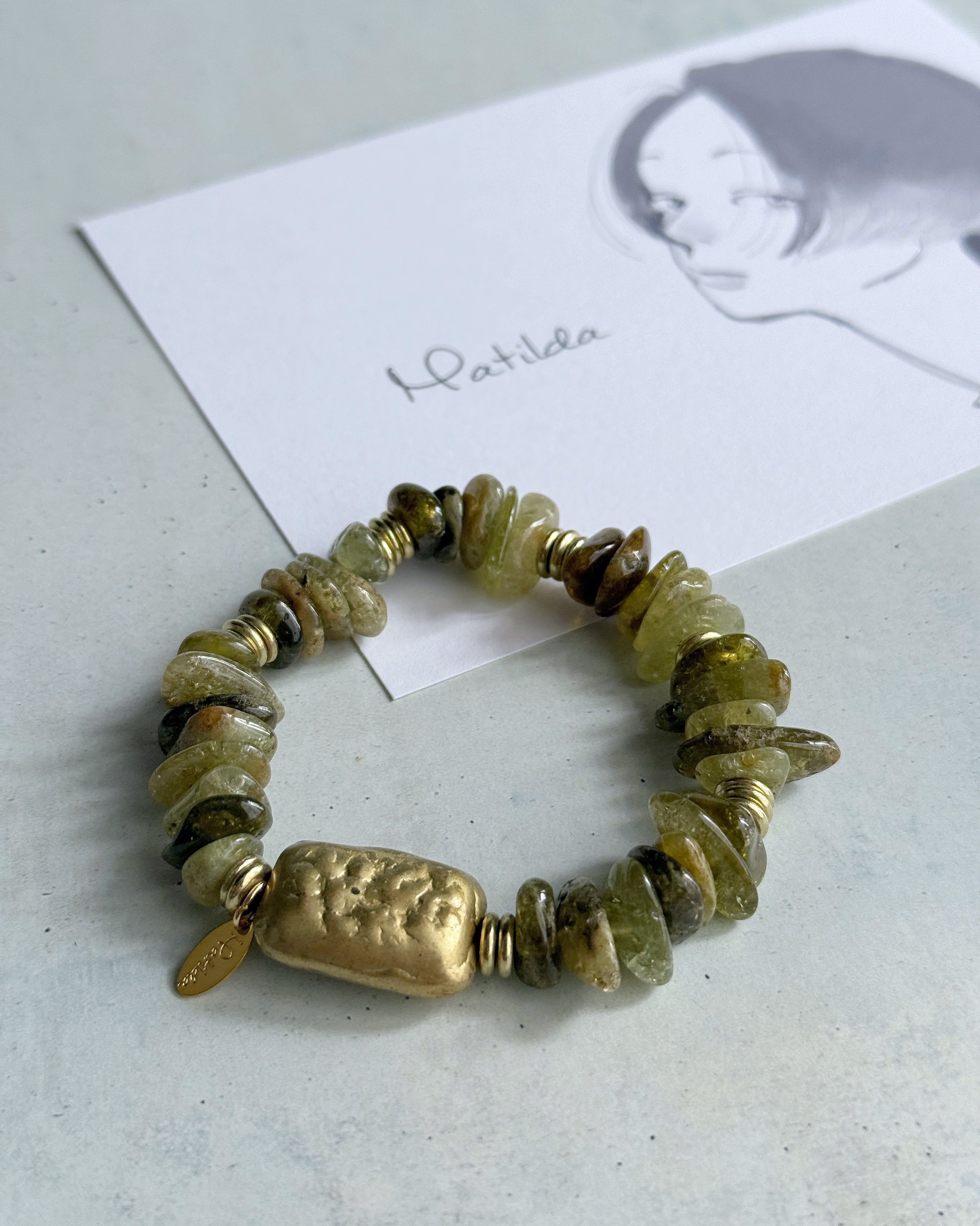 シックなゴールドカラーのメタルビーズと、肌馴染みのよいセージグリーンやチェリーブラウンのガーネットのチップに、テクスチャーがユニークな真鍮ビーズのタブレットを合わせて。