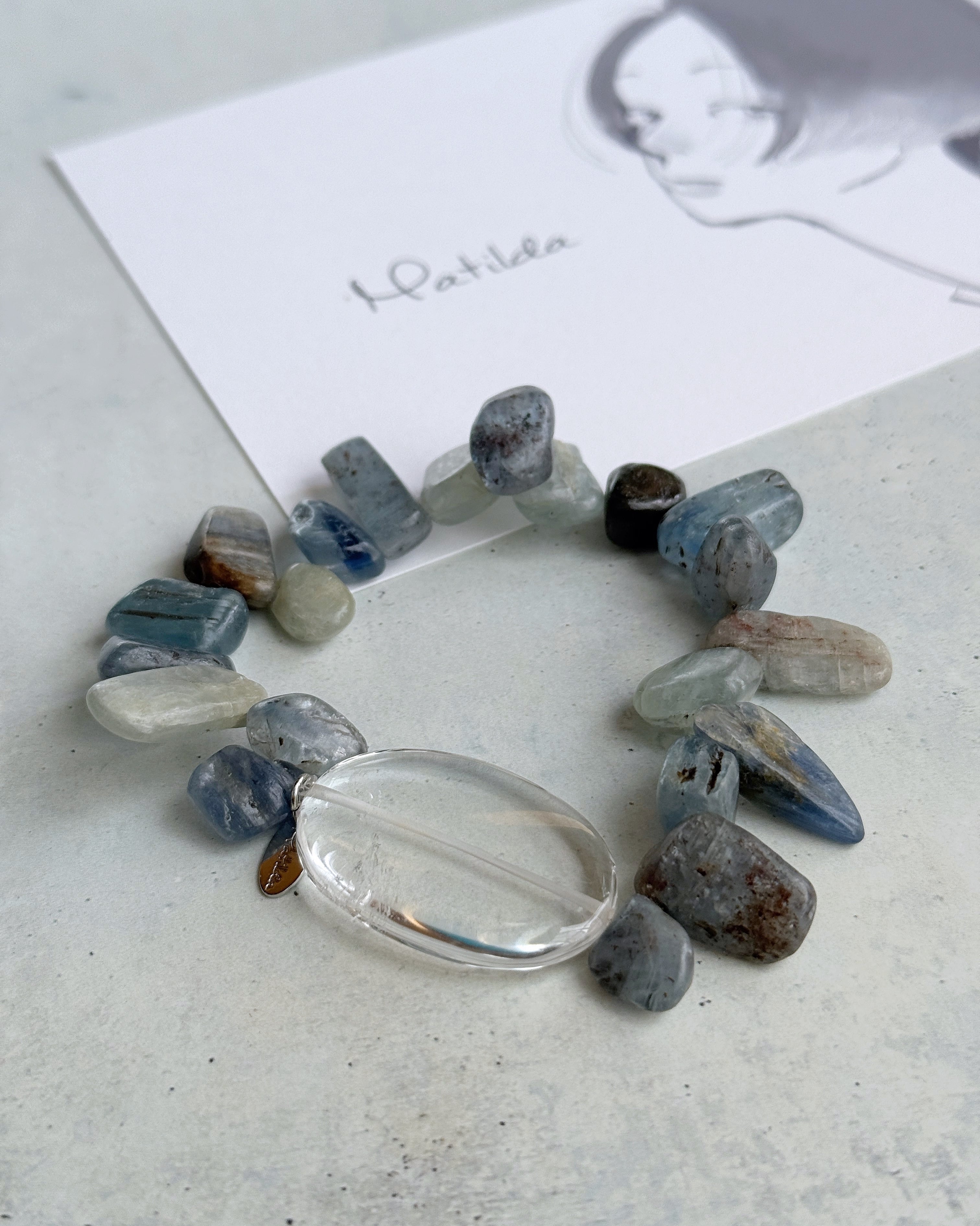 インディゴブルーやブルーグレーのミュートカラーが不規則に跳ねるカイヤナイトのチップを、大粒のクリアクォーツの存在感でシャープにまとめて。