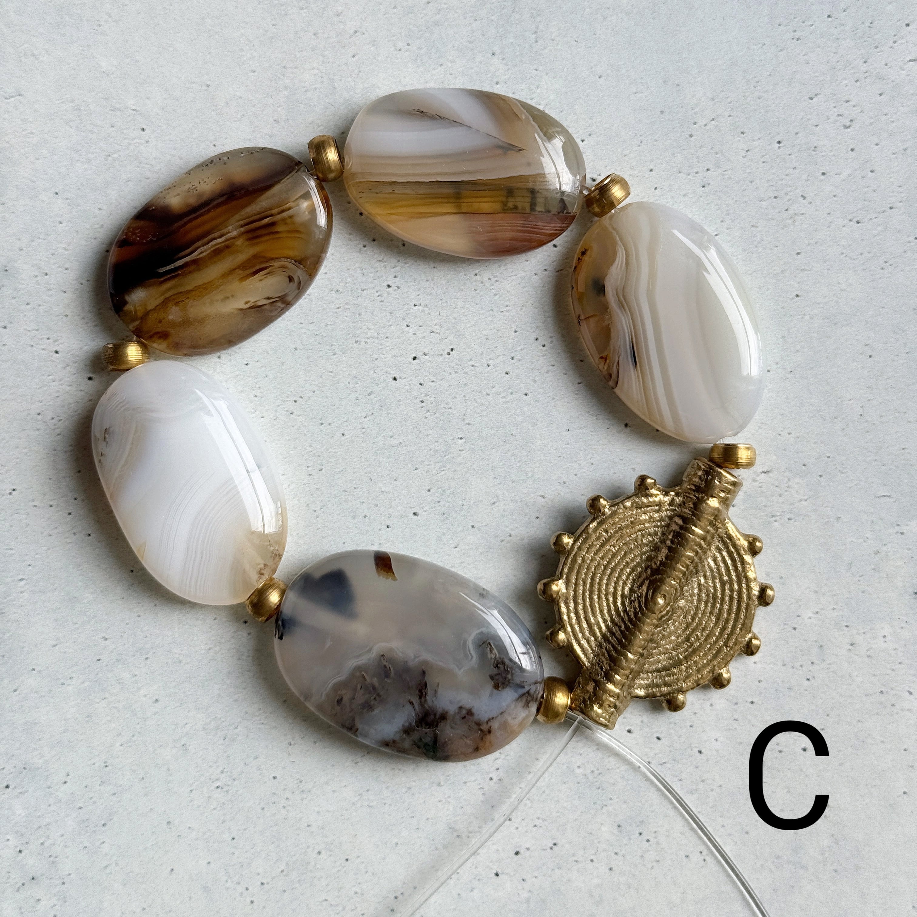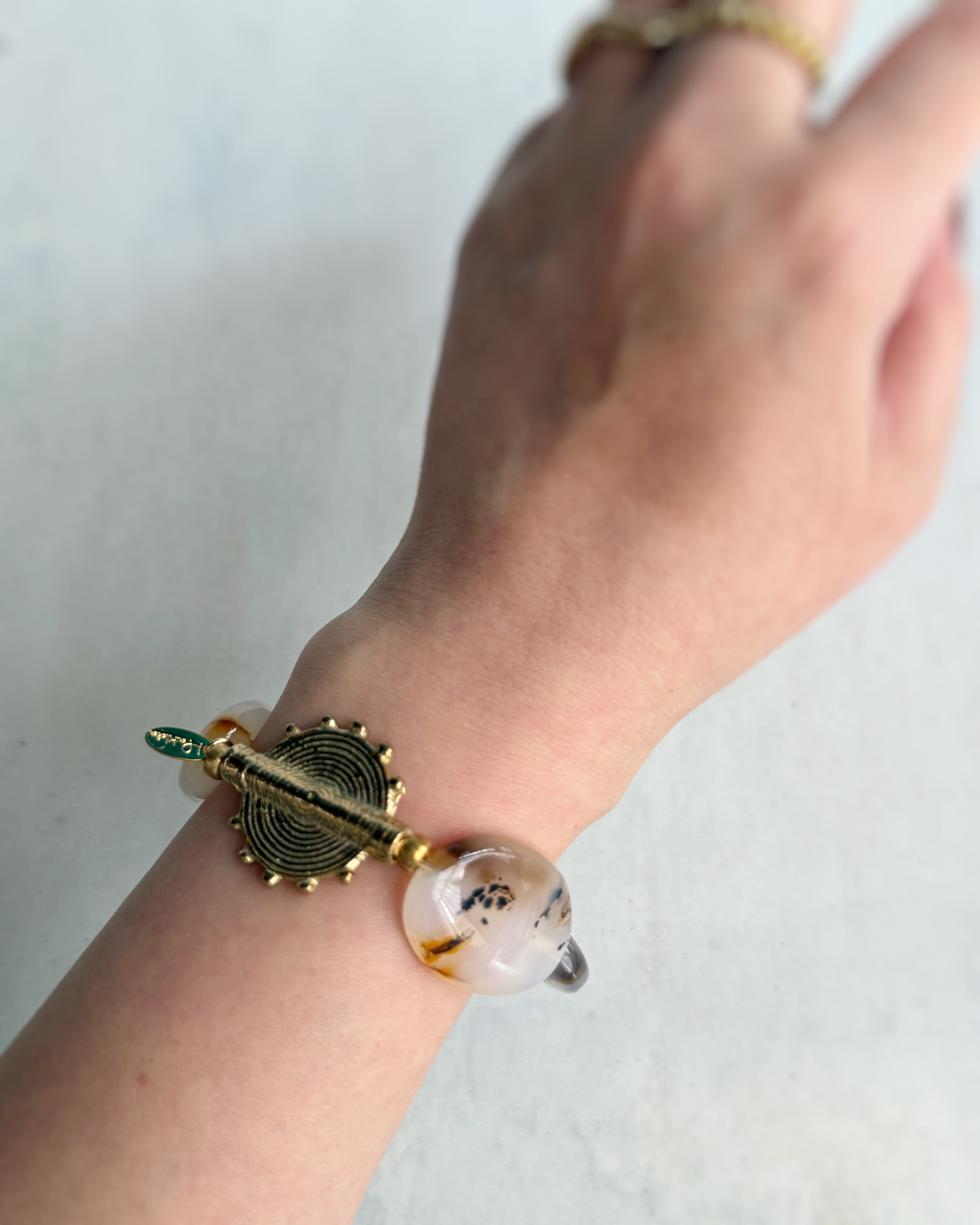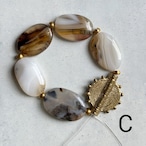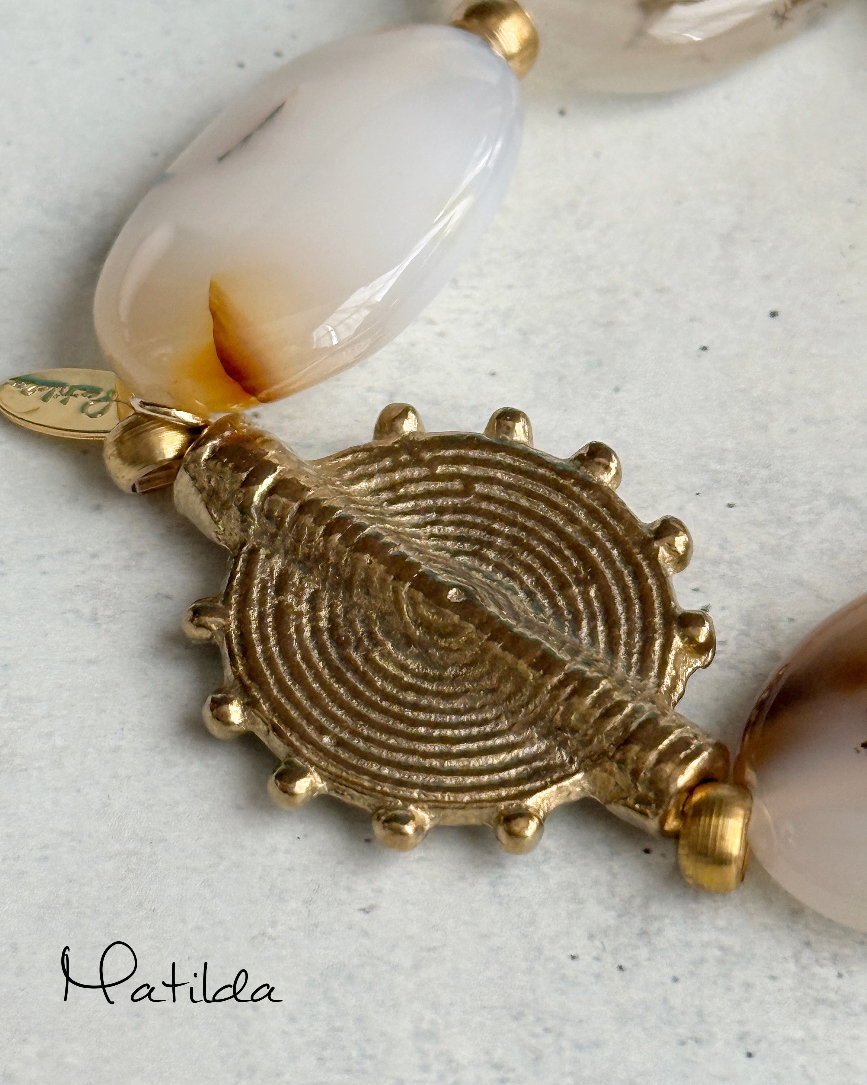 抽象画のようなブラウンの模様と、とろりと溶け出しそうな乳白色や、うっすらと肌色を透かすミルクを溶かしたような透明さに色気を宿すモンタナアゲートに、存在感のある真鍮ビーズのモチーフのシックなゴールドカラーを合わせて。