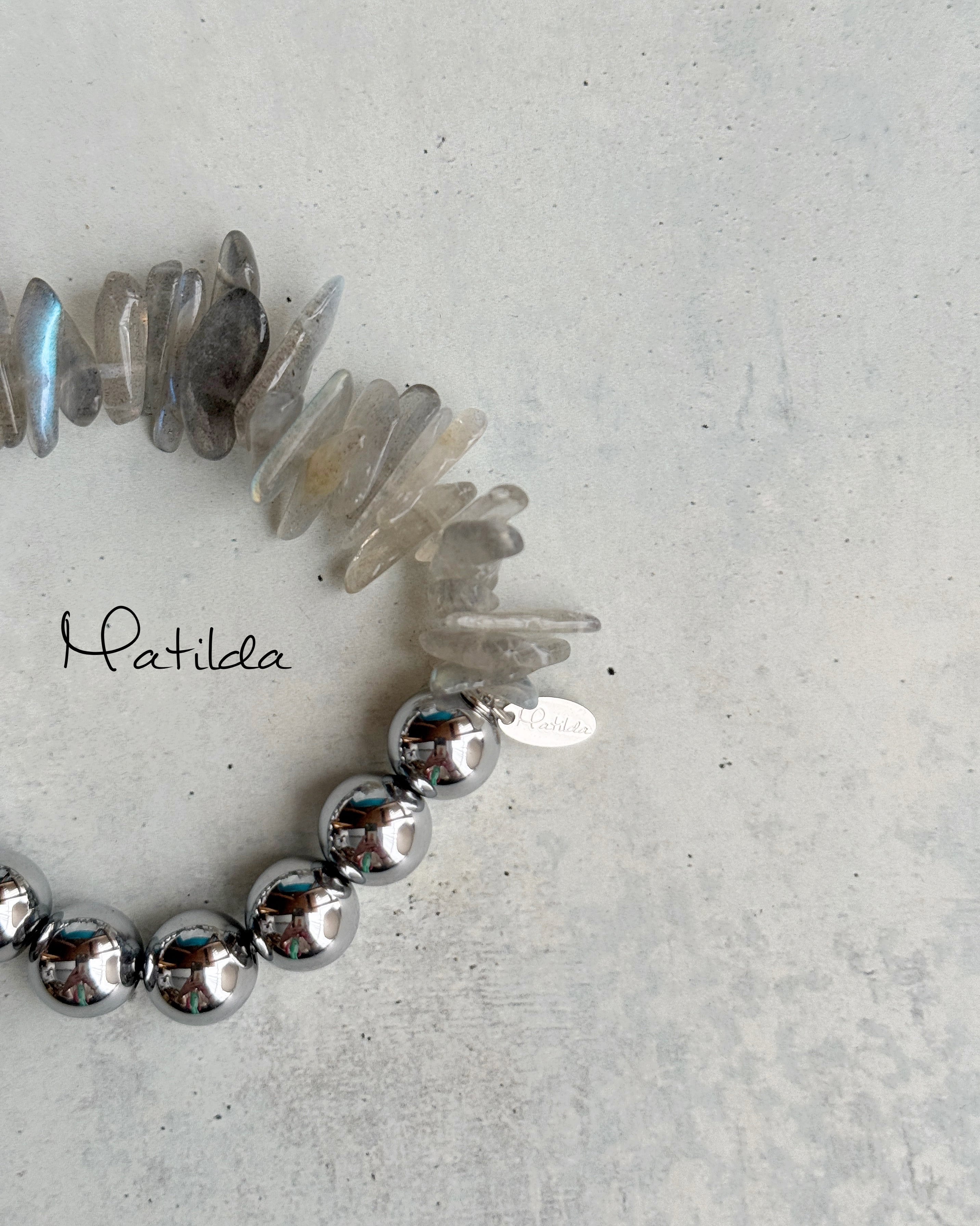 シラーの儚いきらめき、アンニュイなニュアンスに惹かれずにはいられないラブラドライトのチップに、鋭く閃くメタルシルバーがクールなヘマタイトボールを合わせて。