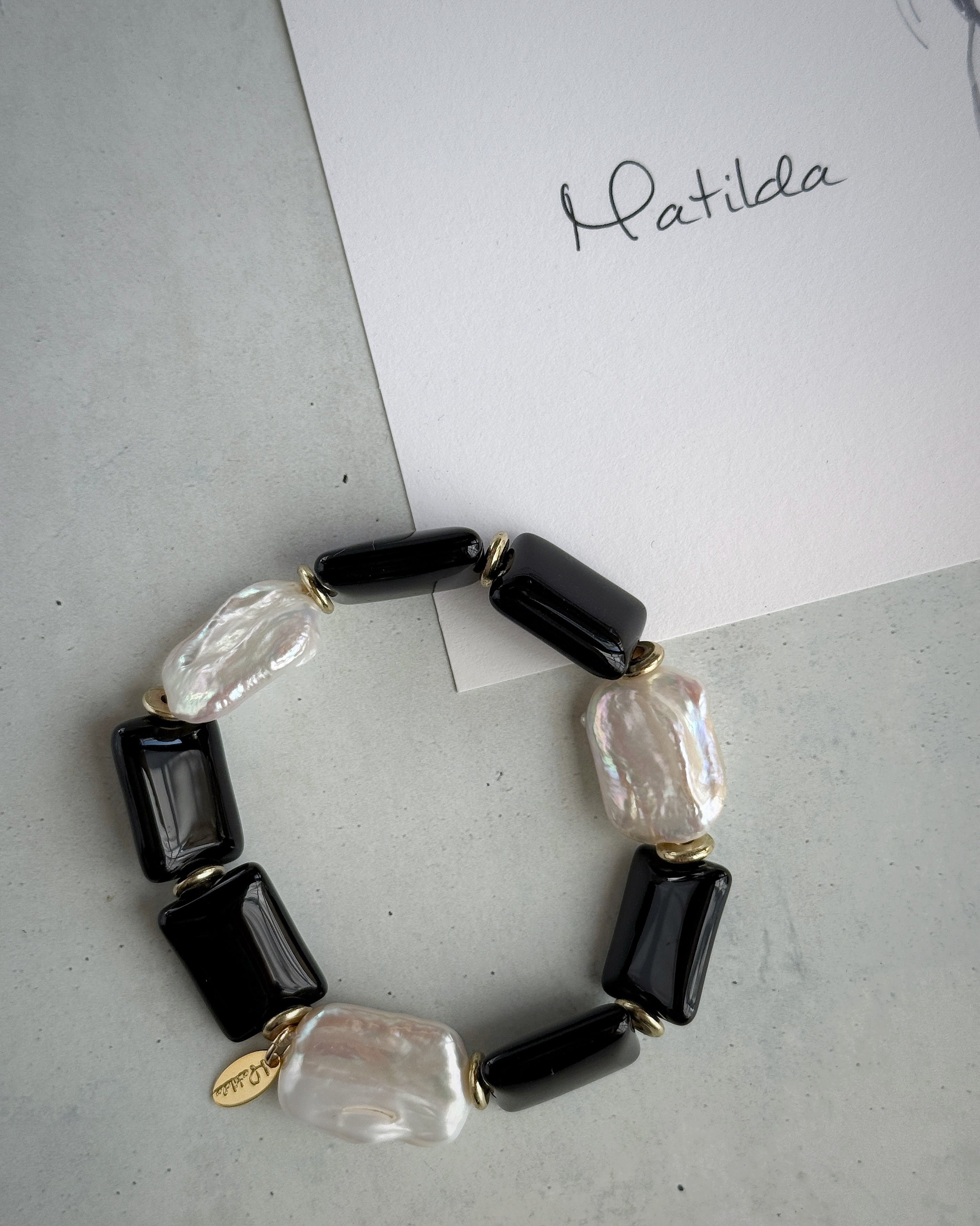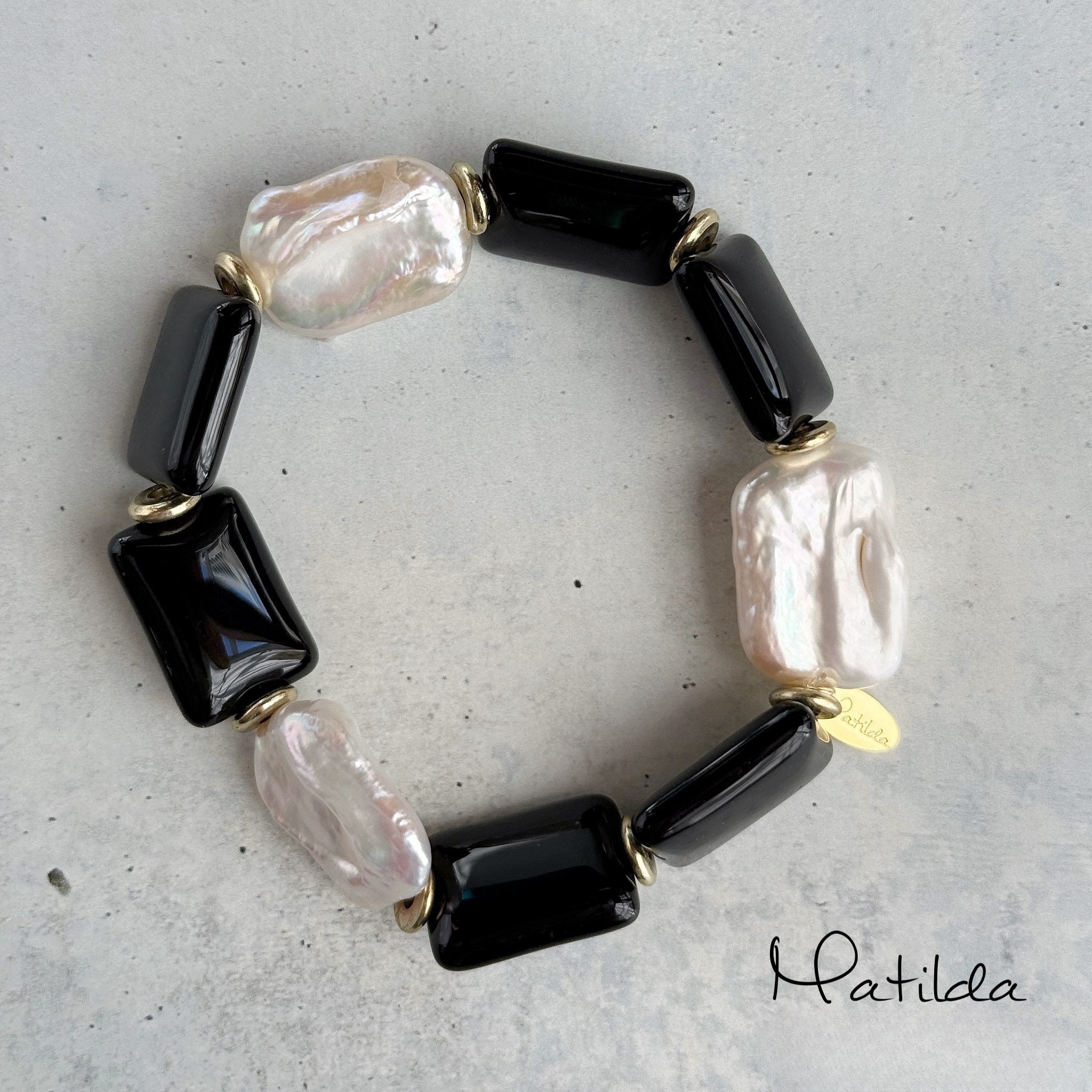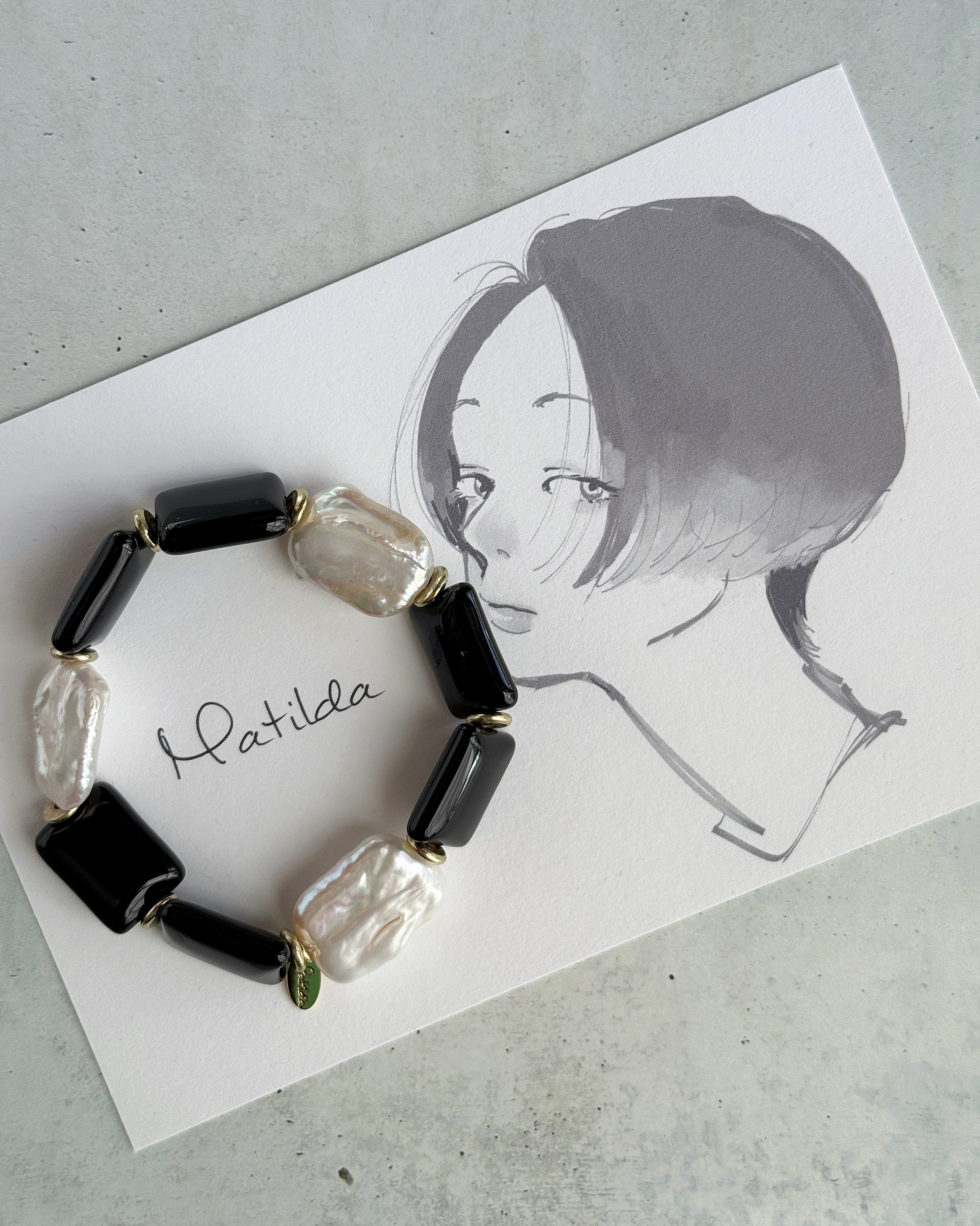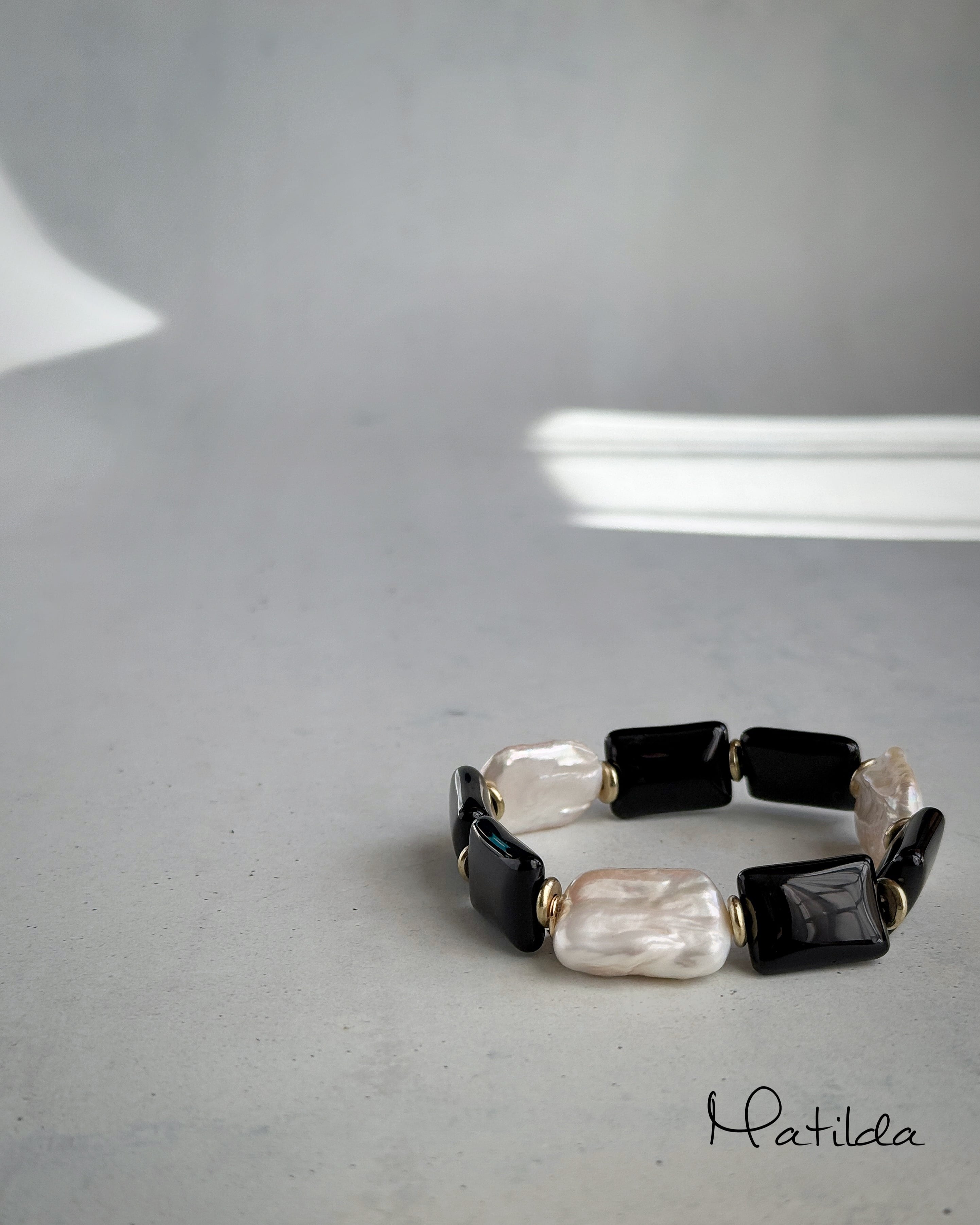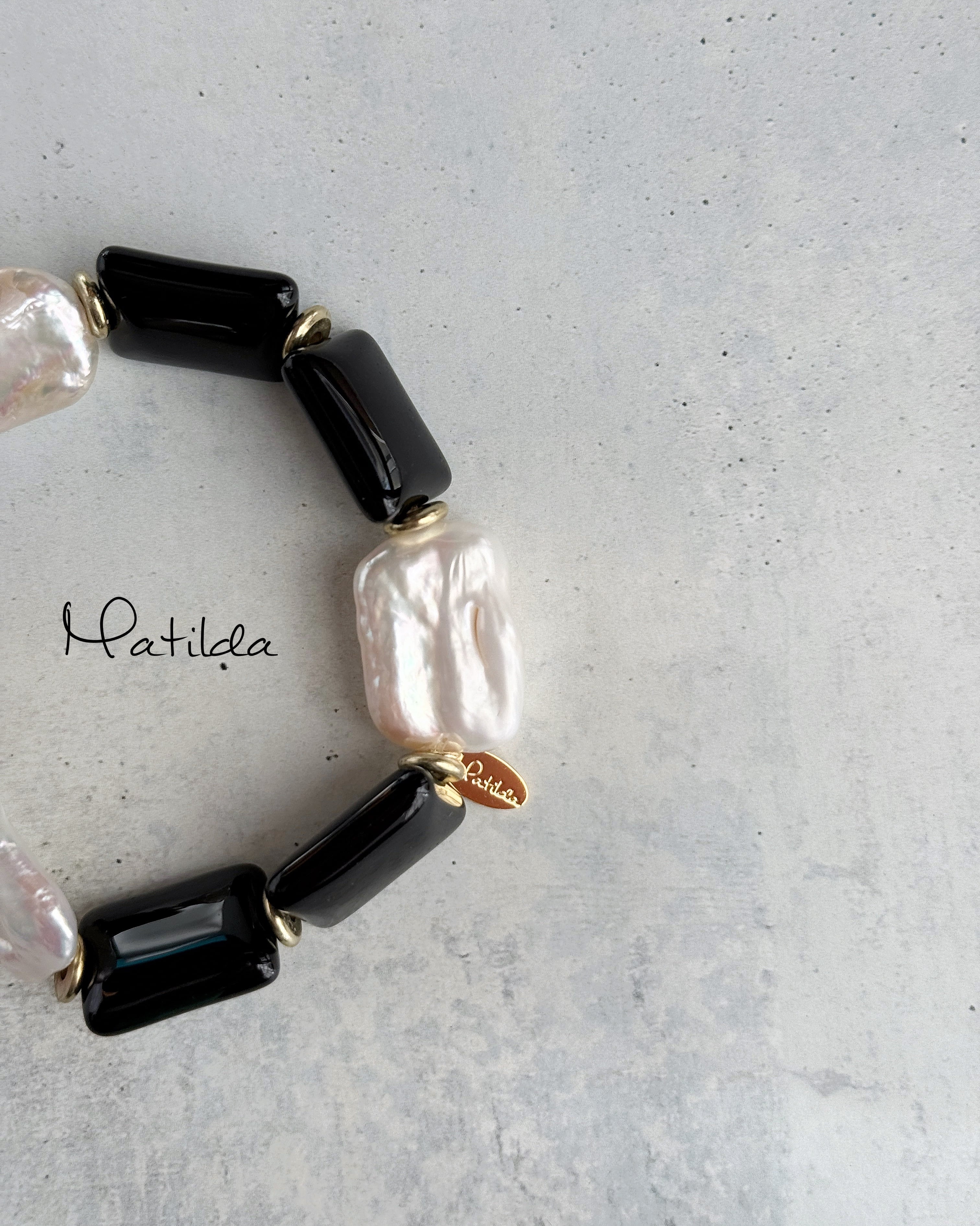 シックな漆黒がマニッシュなオニキスのタブレットとパールホワイトが艶めくパールのタブレットのペアに、ゴールドのメタルビーズを添えて華やかなアクセントに。