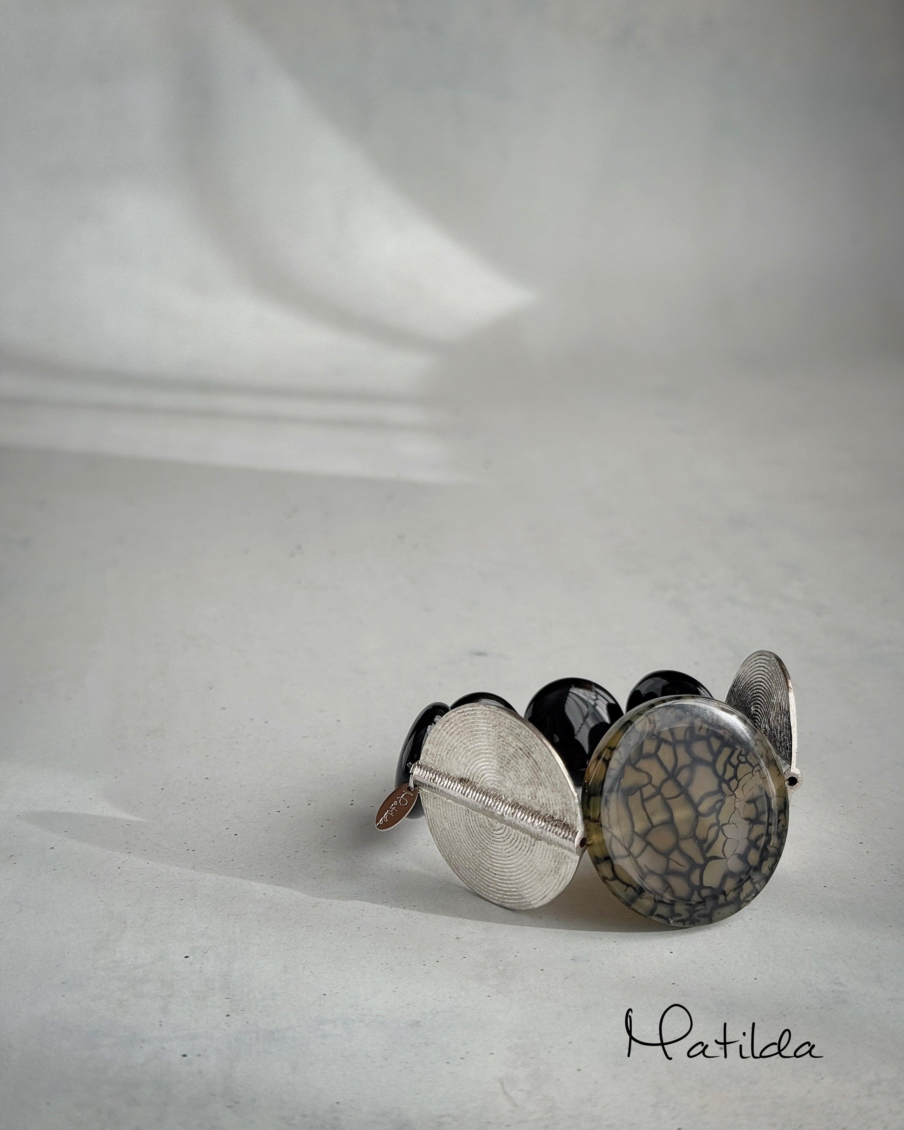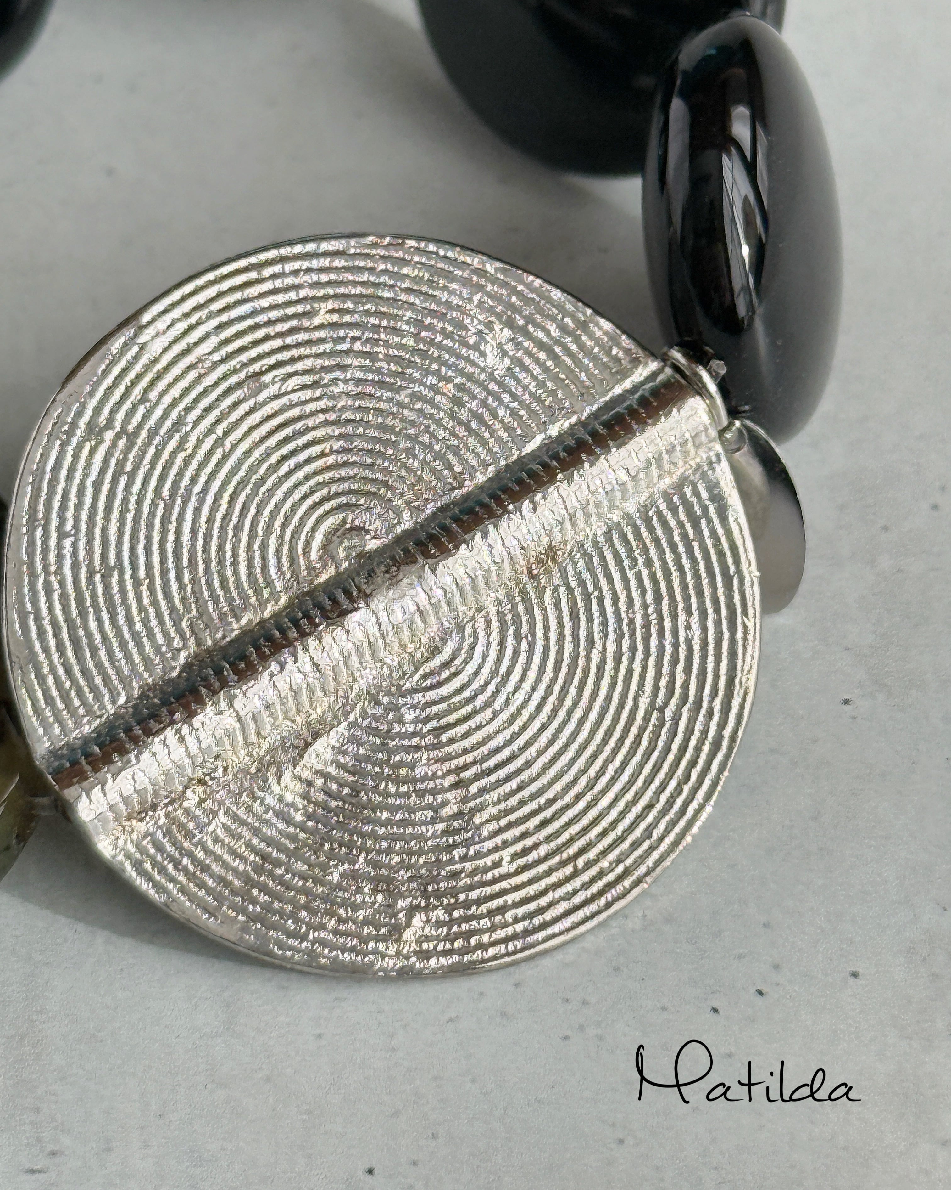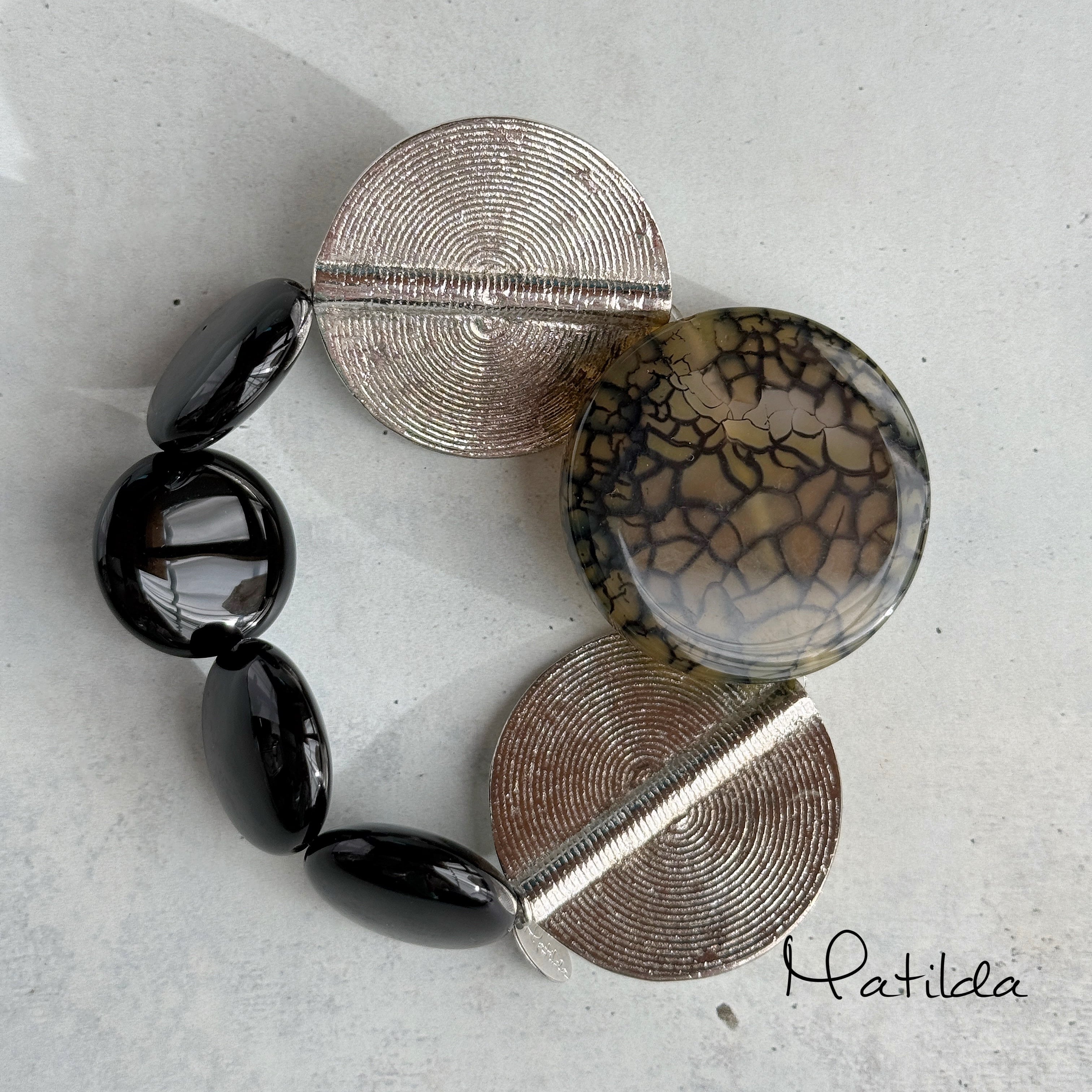 独特の鱗模様が目を引く大粒のドラゴンアゲートとホワイトメタルのペアリングを、4連オニキスのトゥルーブラックで引き締めて。