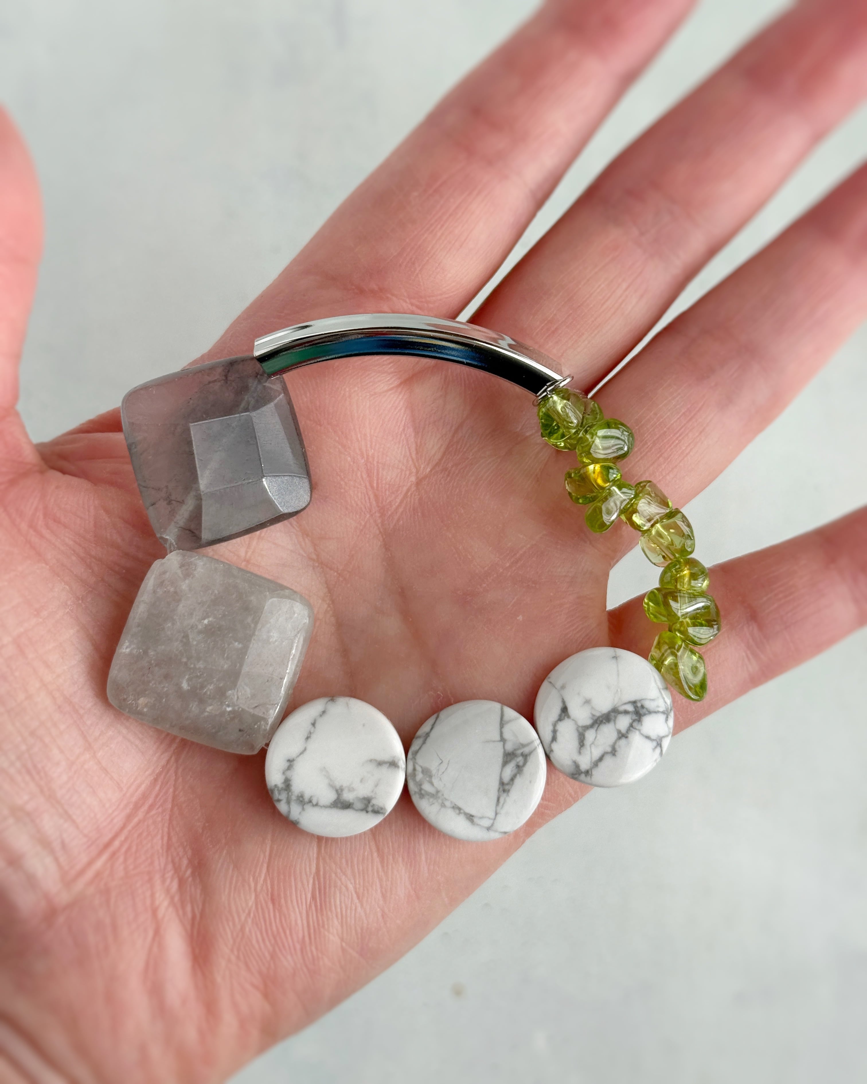 透け感がスタイリッシュなグレークォーツとハウライトのマットホワイト、真鍮ビーズのシルバーを合わせたクールなグレートーンに、フレッシュなクリアグリーンのペリドットを差し込んで。