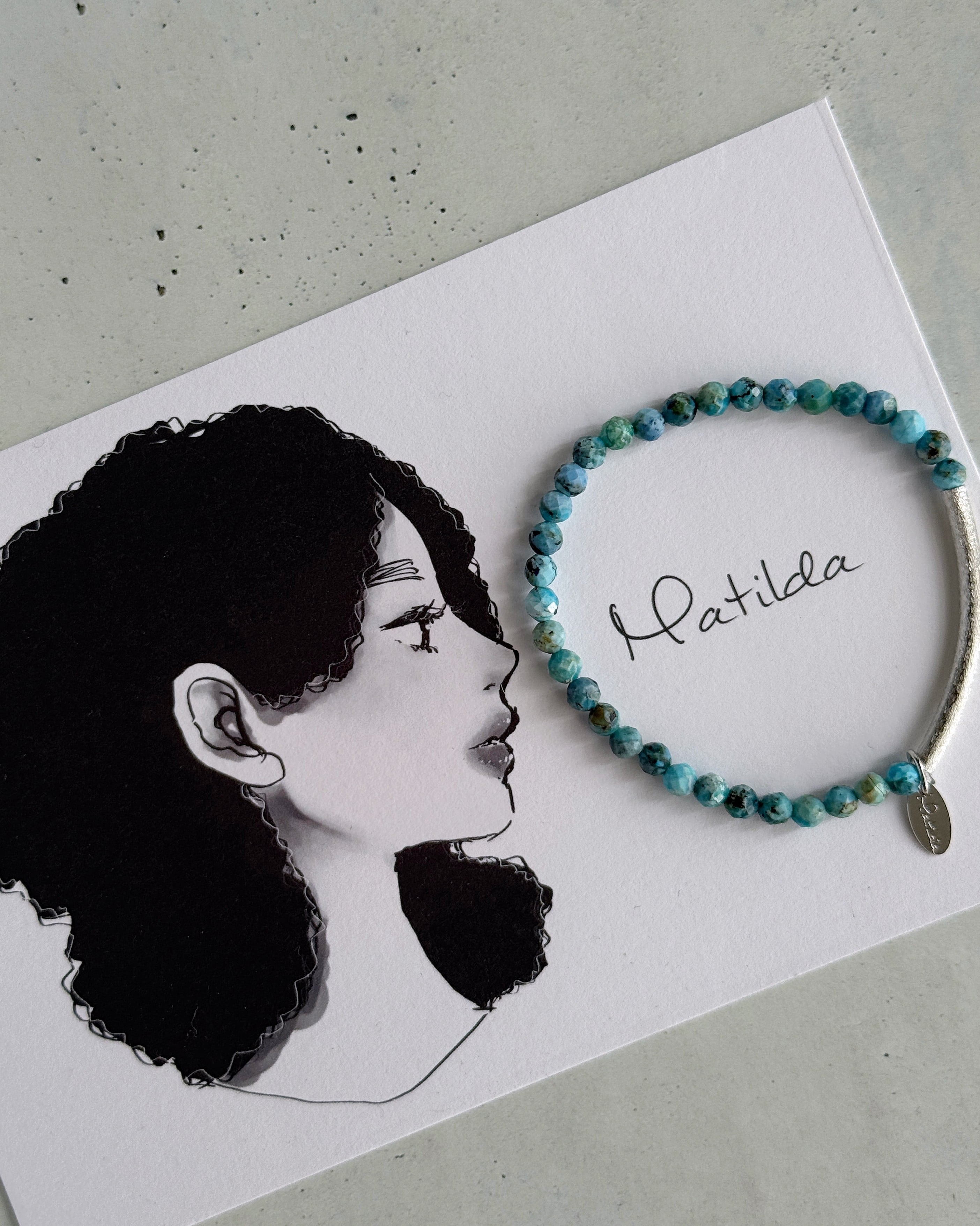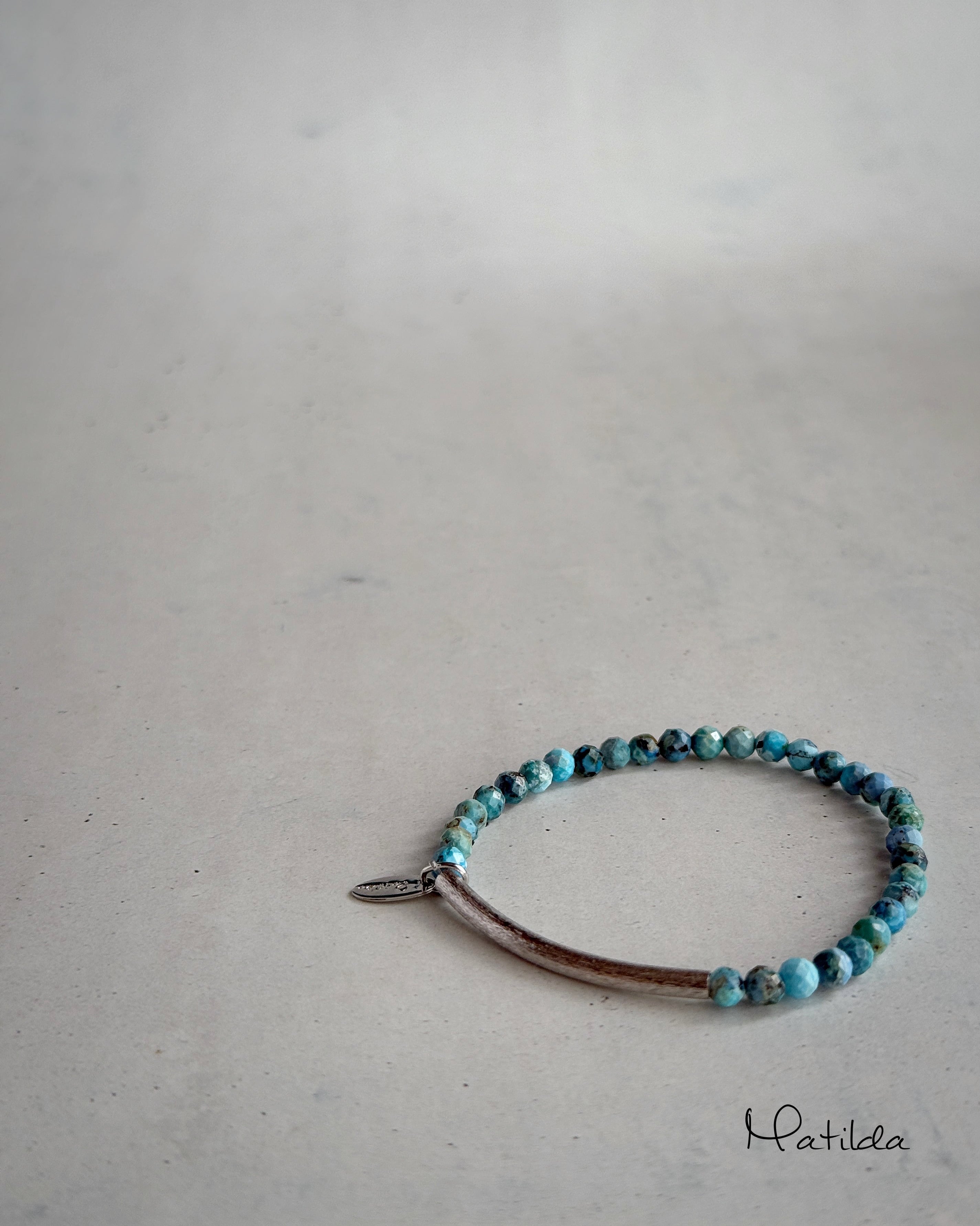鮮やかなシアンブルーのブルーオパールに、マットな質感がリラックスした雰囲気を漂わせるシルバーカラーの真鍮ビーズを合わせて。