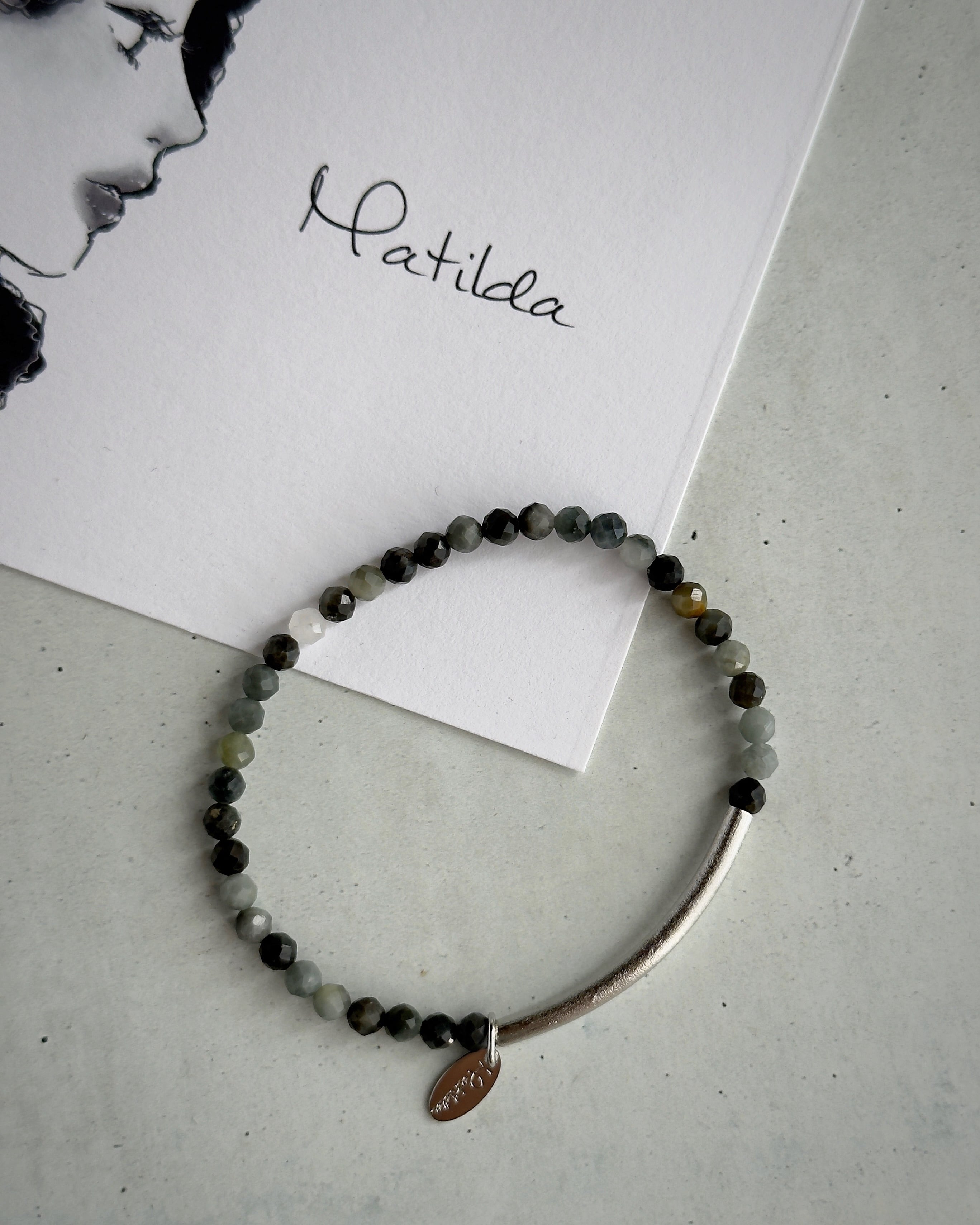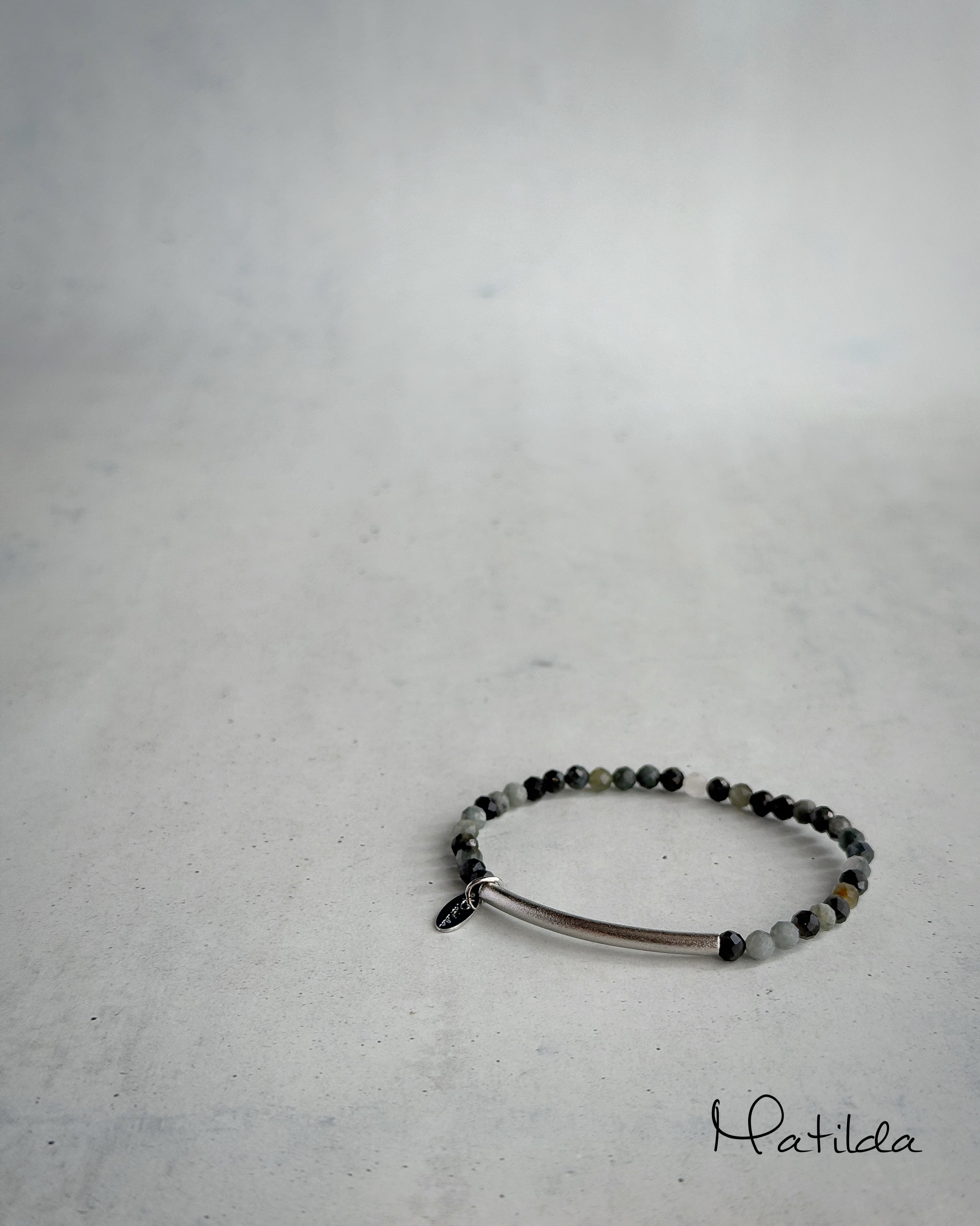 クリスタルホワイトから、ストーングレー、トゥルーブラックへとグラデーションを描くイーグルアイに、クールなシルバーカラーの真鍮ビーズを合わせて。