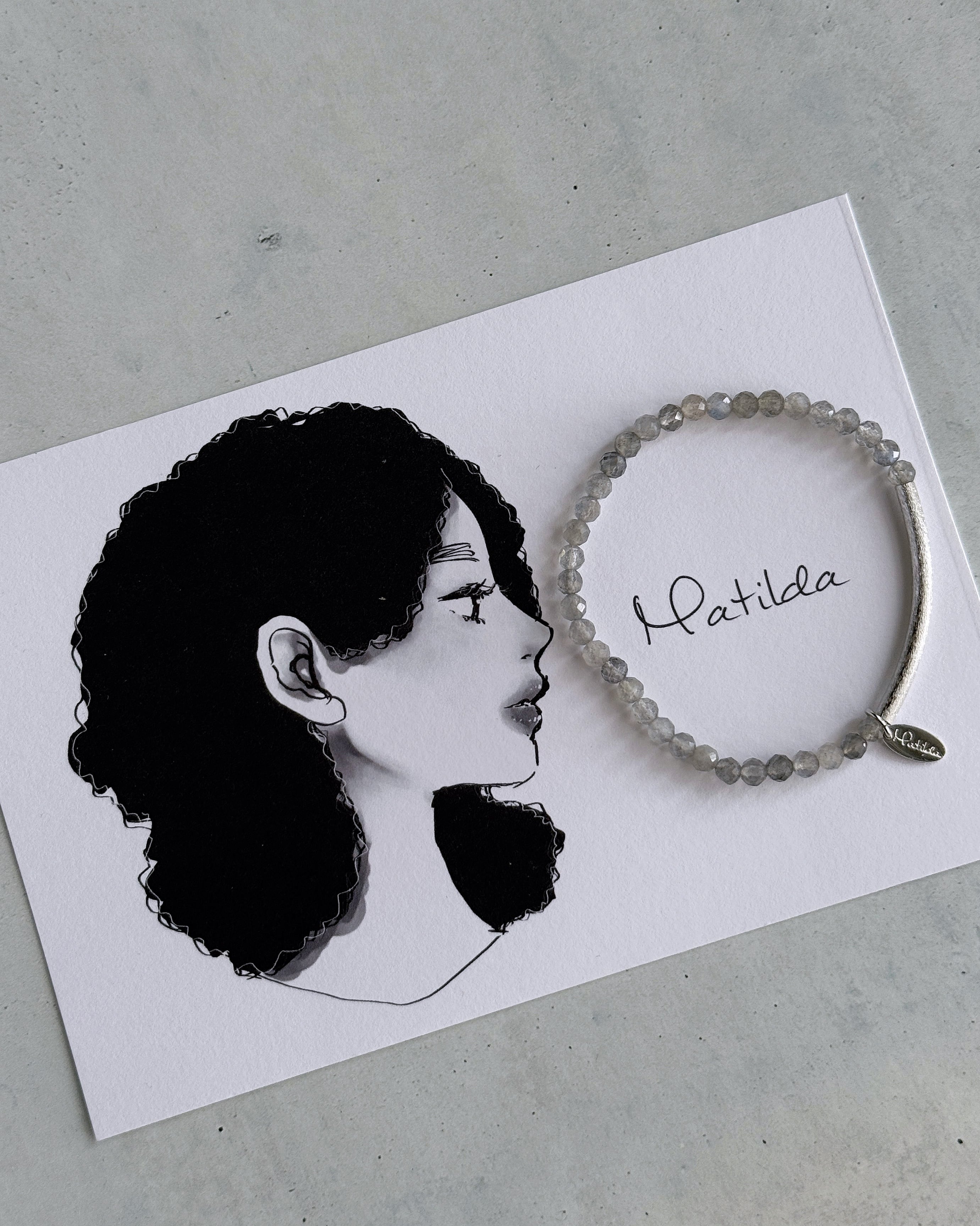 透明感あふれるシルバーグレーとブルーのシラーが繊細な雰囲気を漂わせるラブラドライトに、シルバーカラーの真鍮チューブを合わせて。