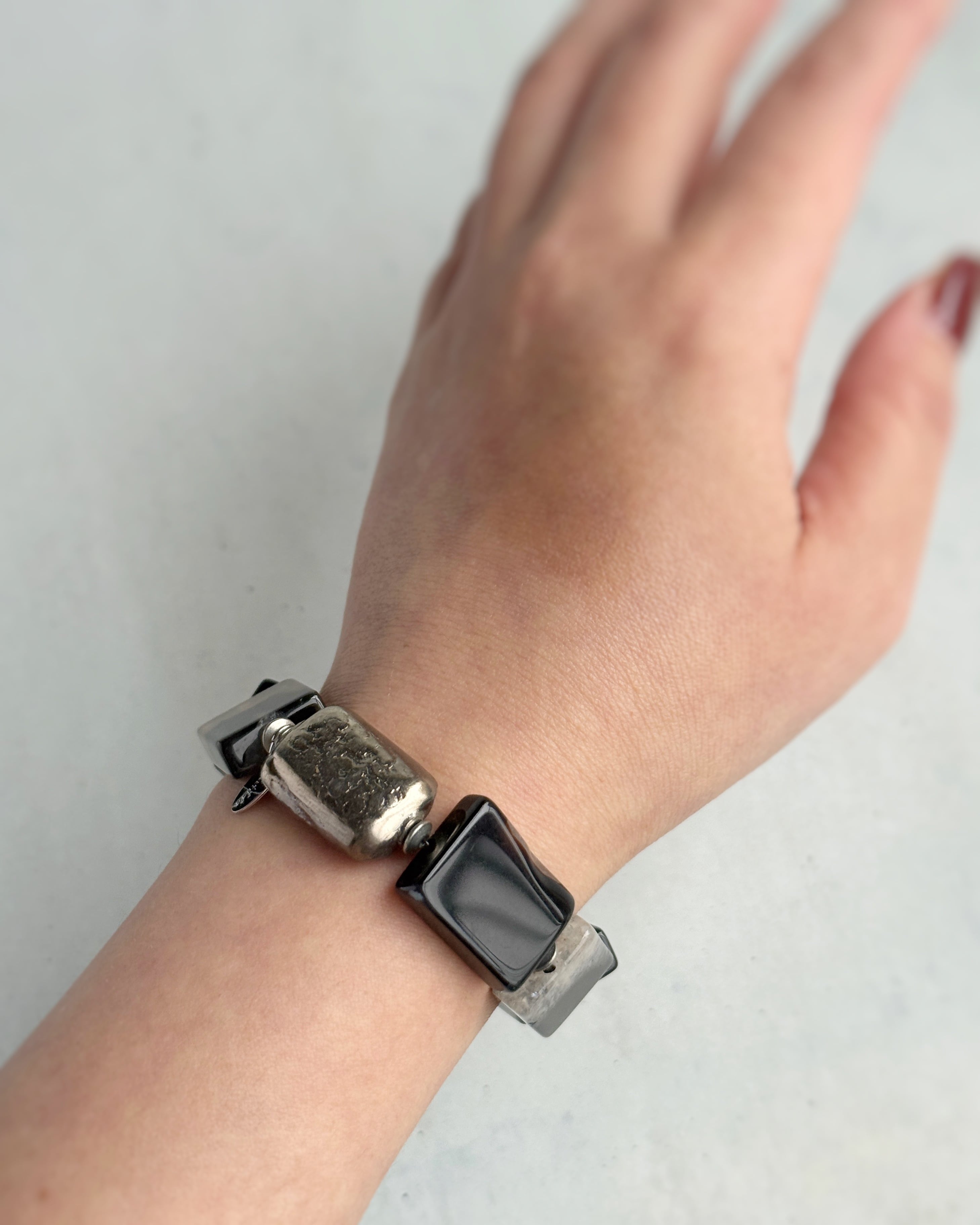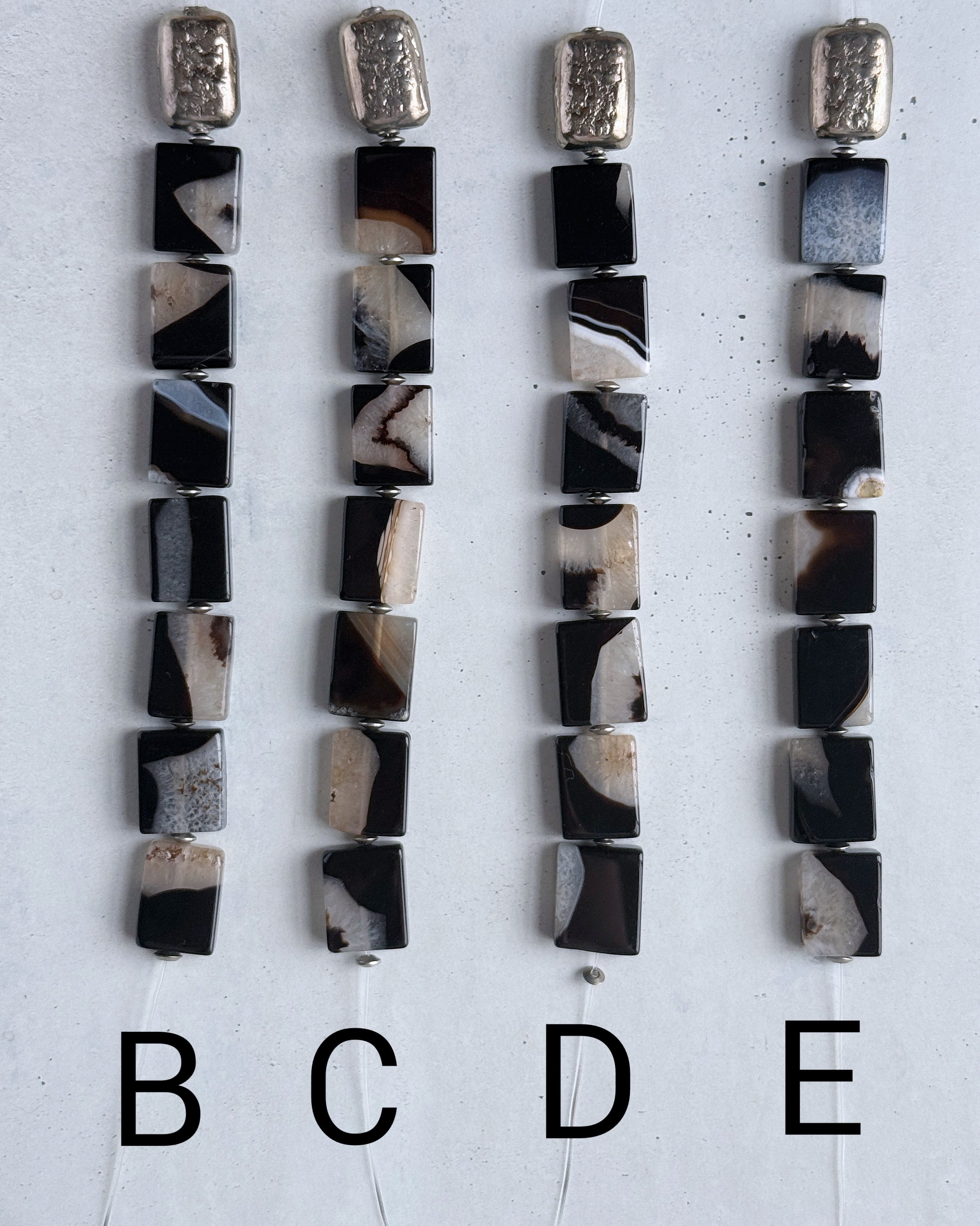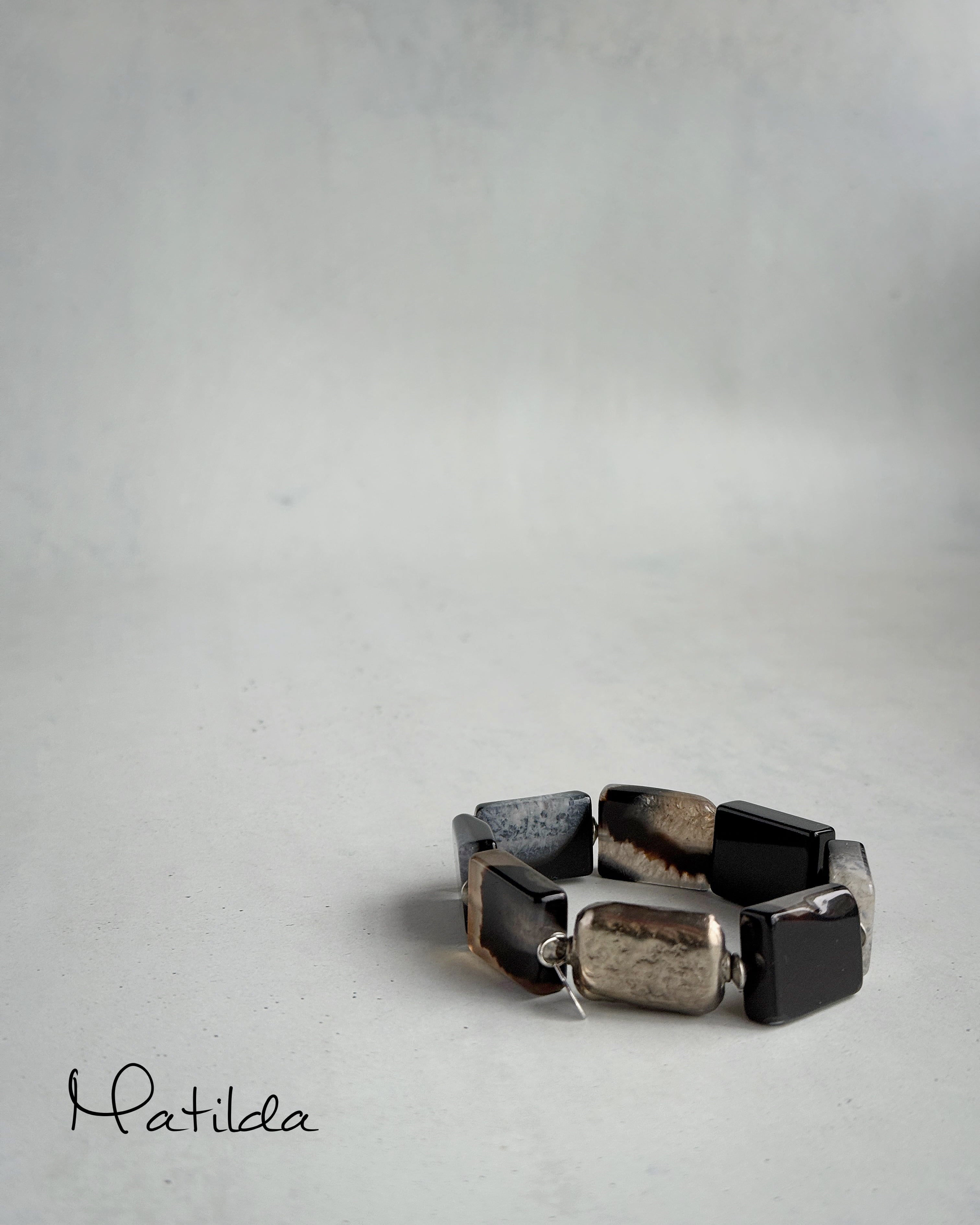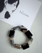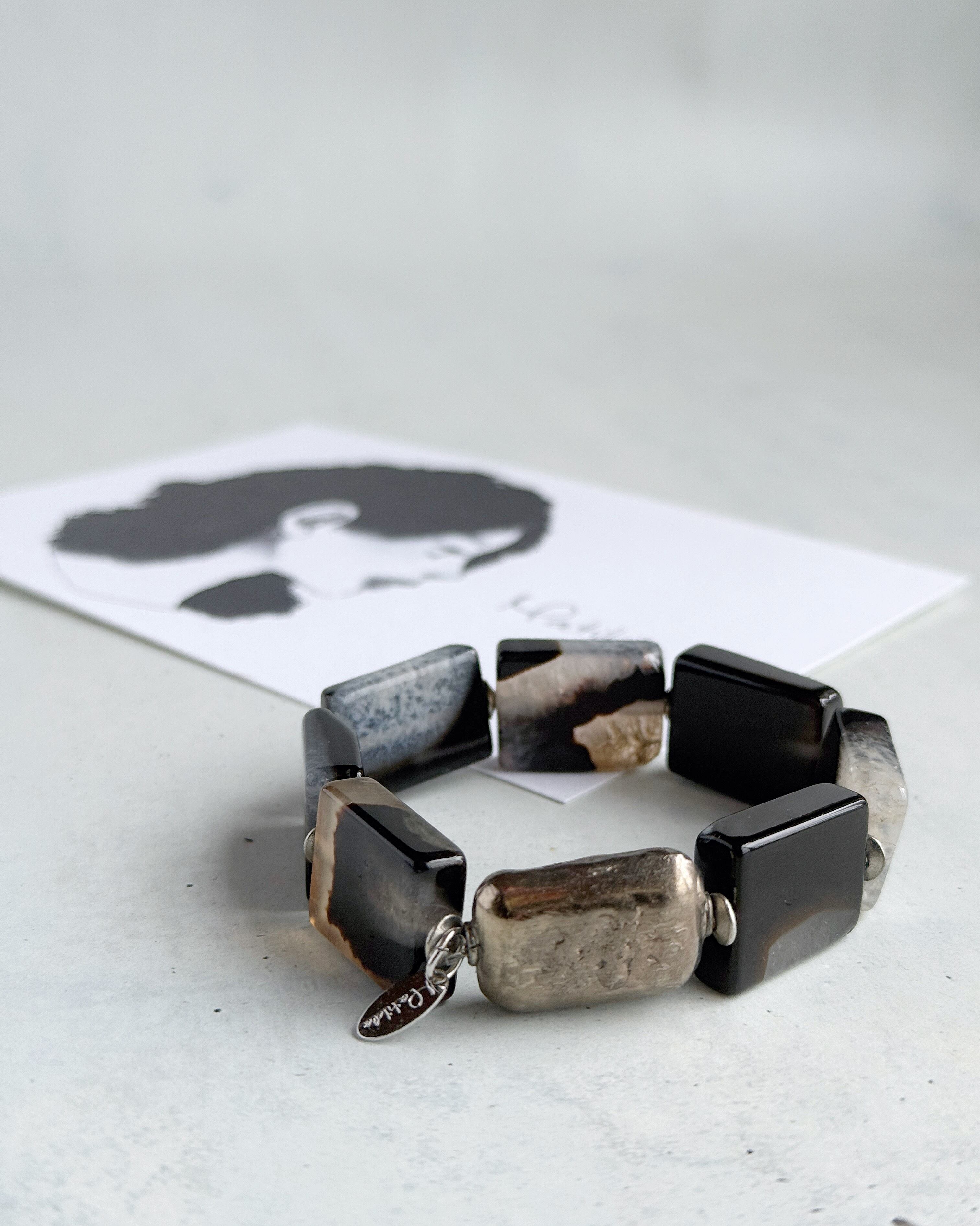 アゲートとクォーツのハイブリッドストーンは、ブラックとクリアが融けあう豊かな表情をマニッシュなタブレットシェイプに仕立てて。