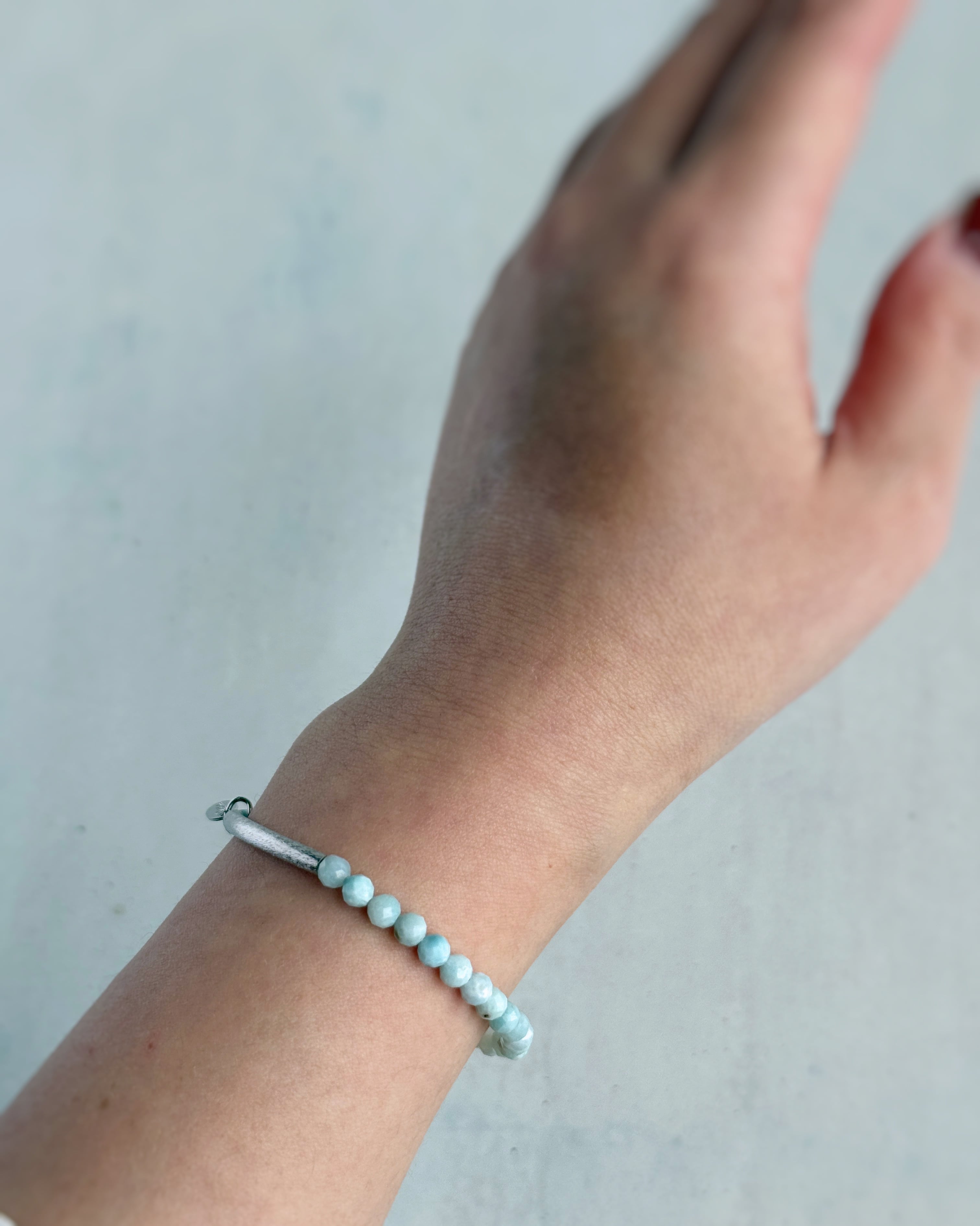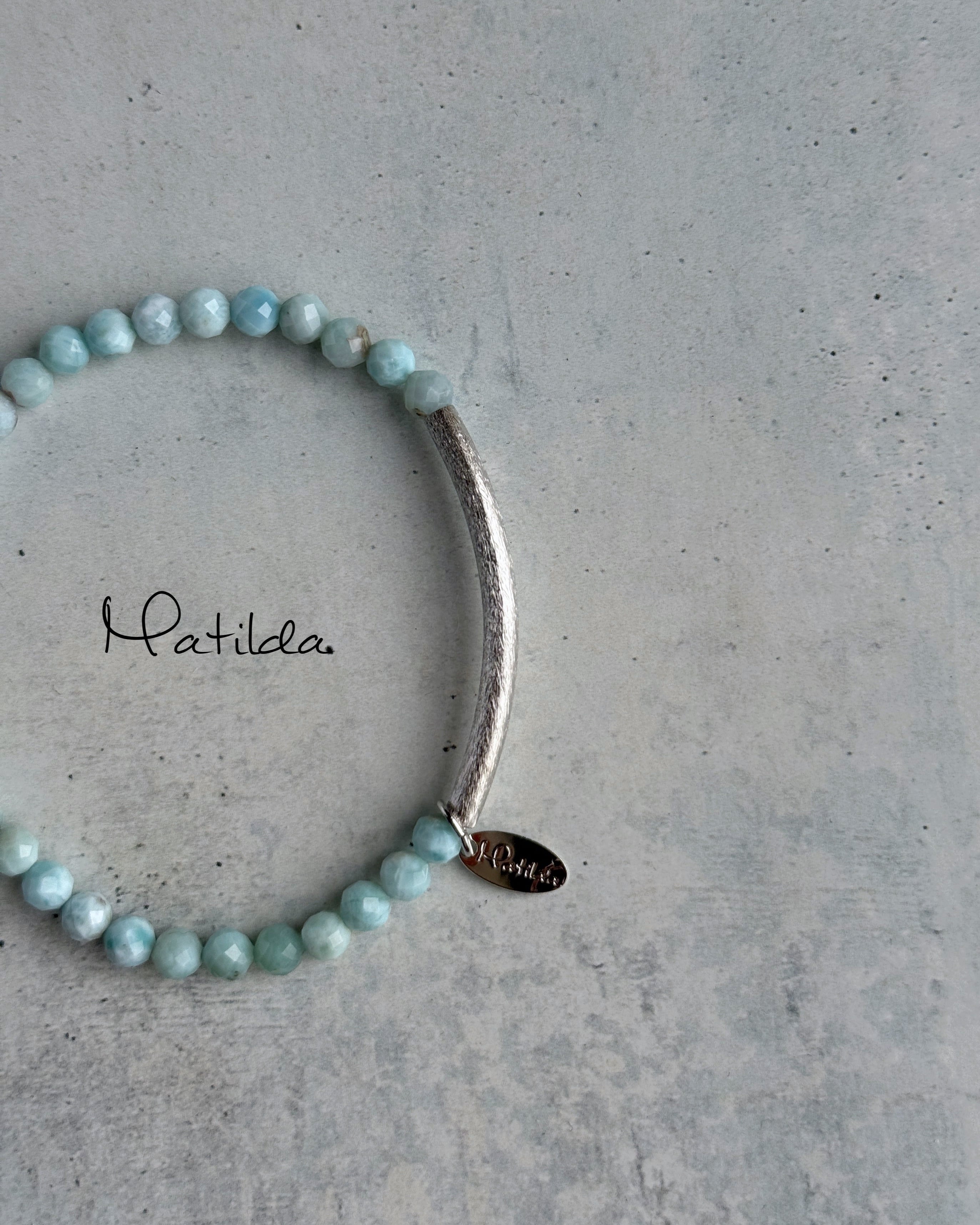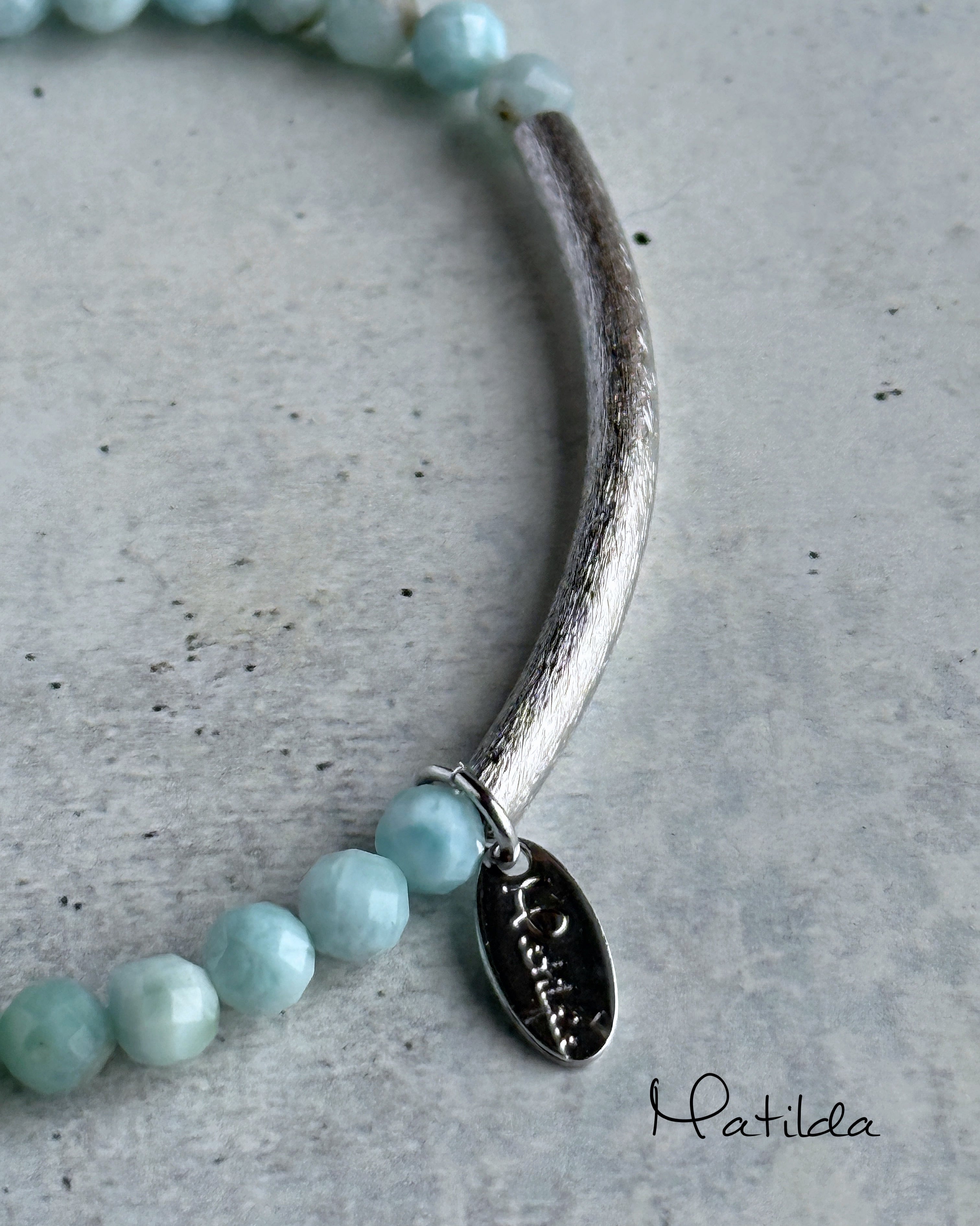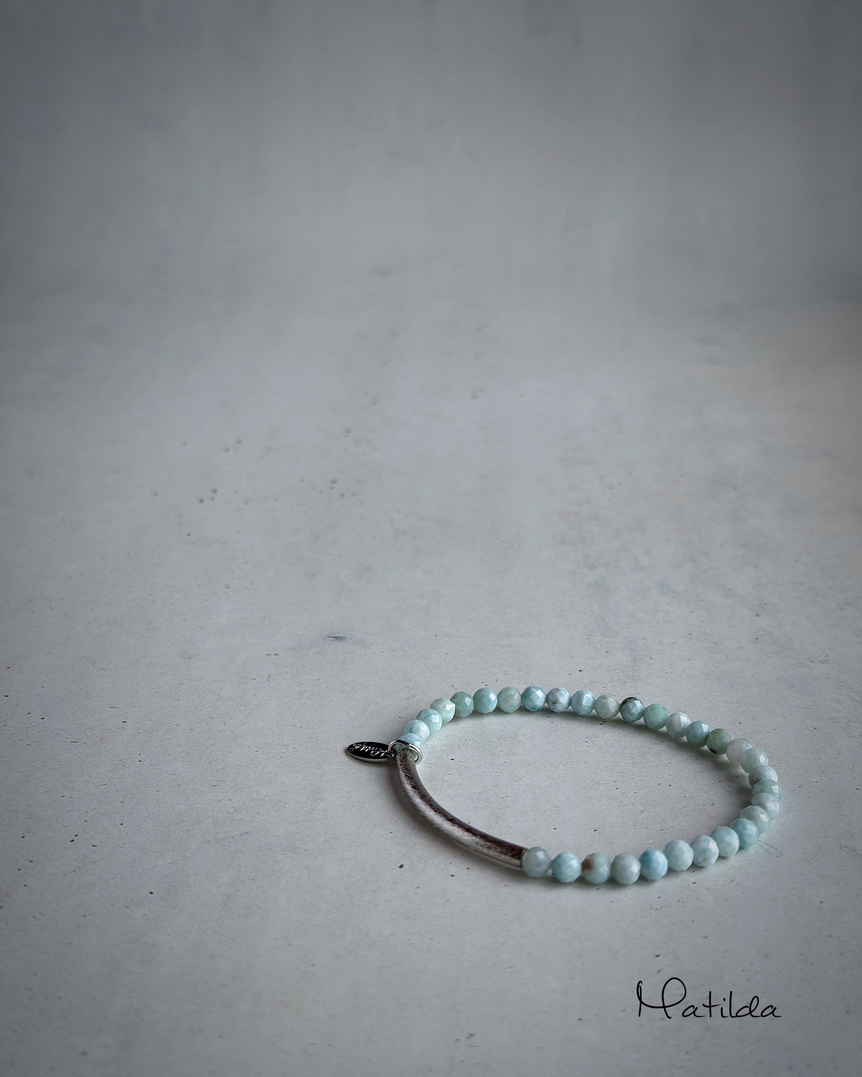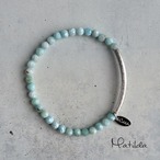 肌に溶け込むようなミルキーなベイビーブルーのラリマーを、シルバーカラーの真鍮ビーズとペアリング。