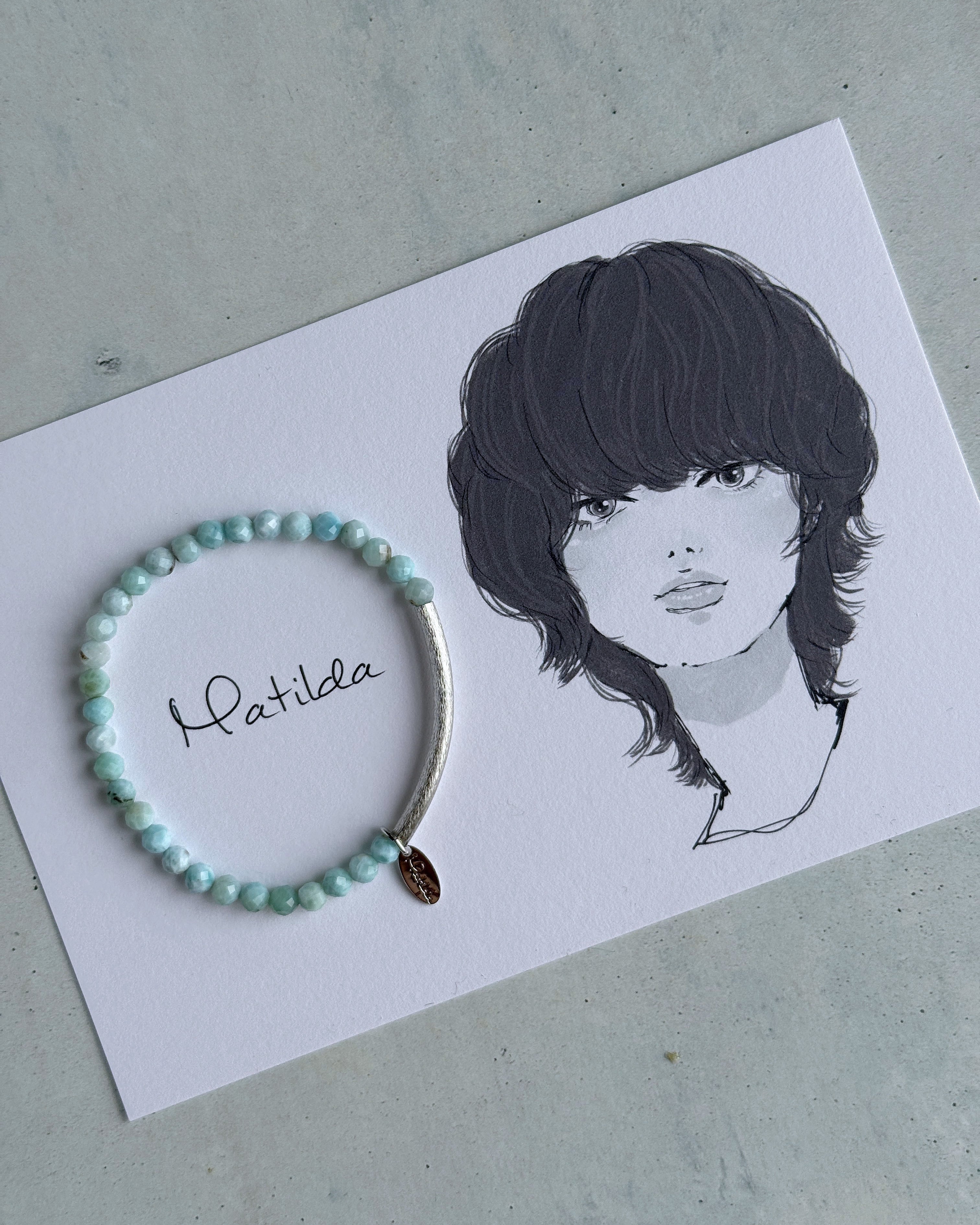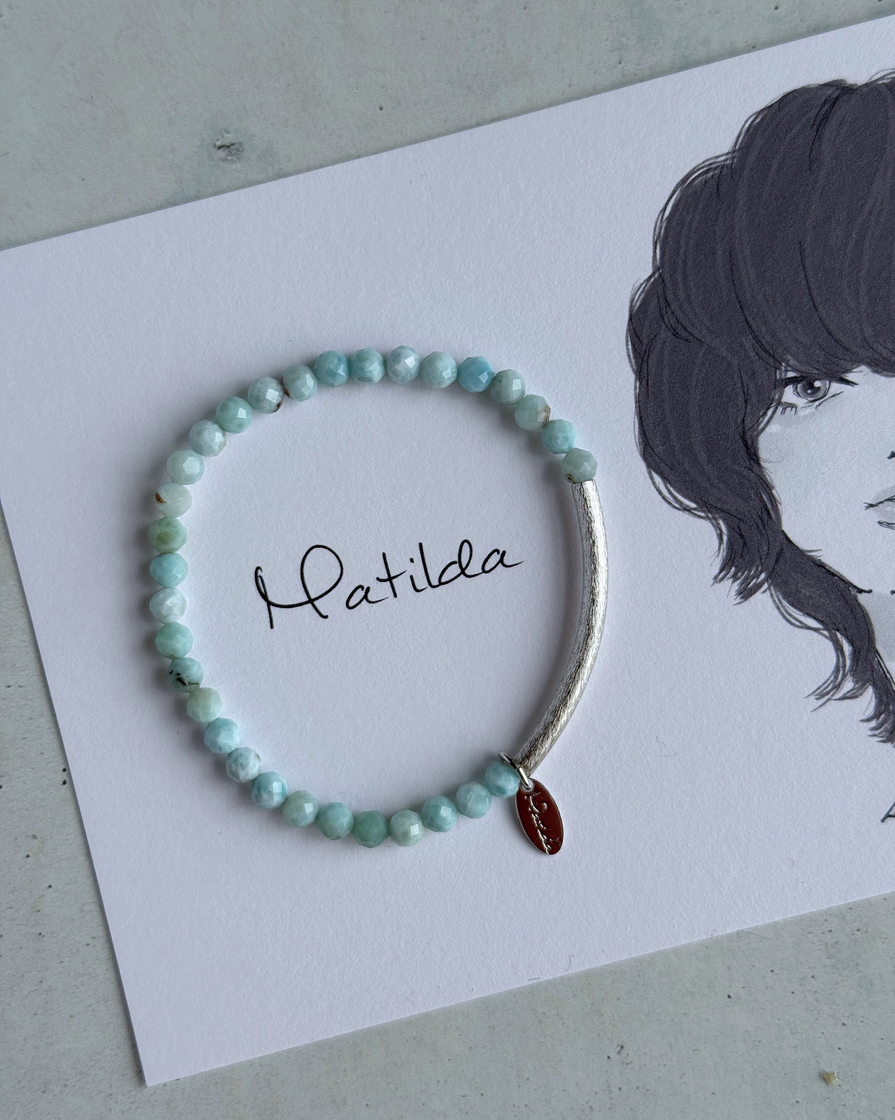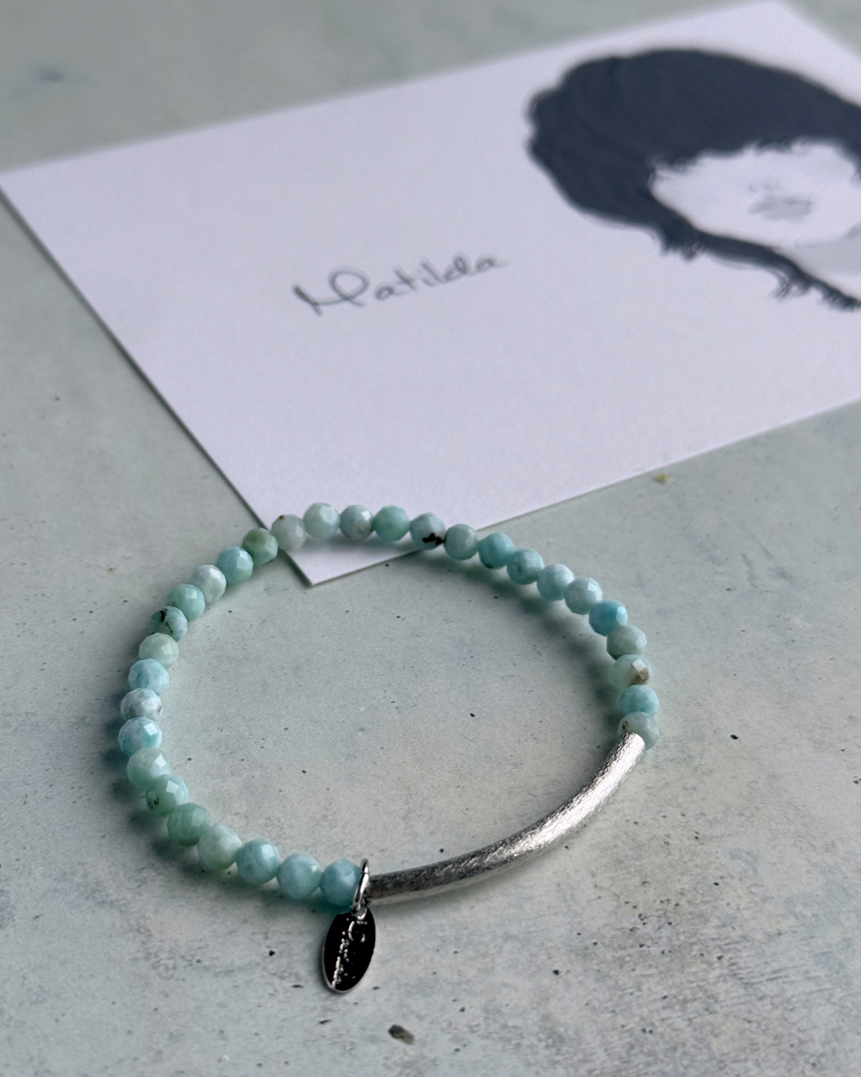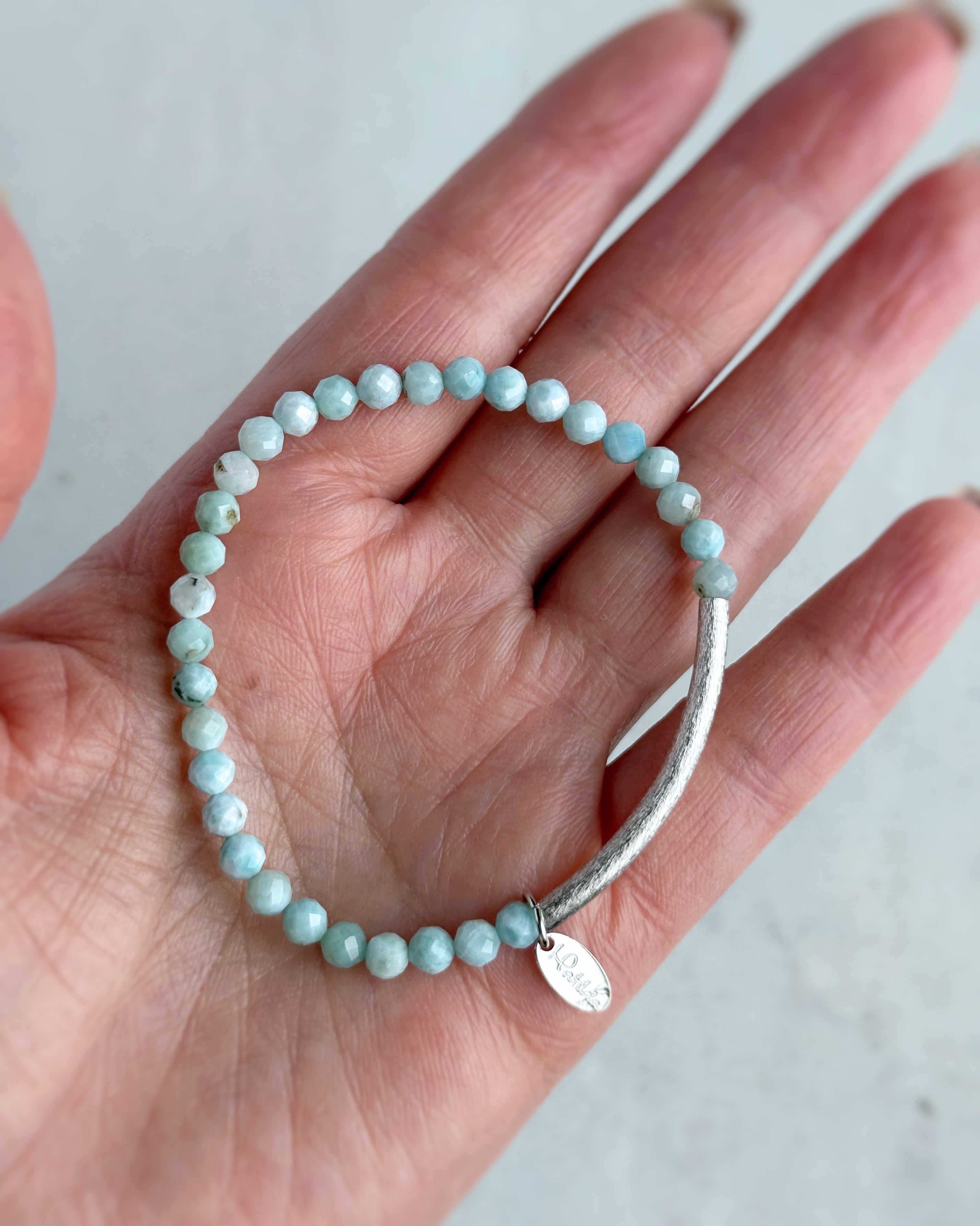 肌に溶け込むようなミルキーなベイビーブルーのラリマーを、シルバーカラーの真鍮ビーズとペアリング。