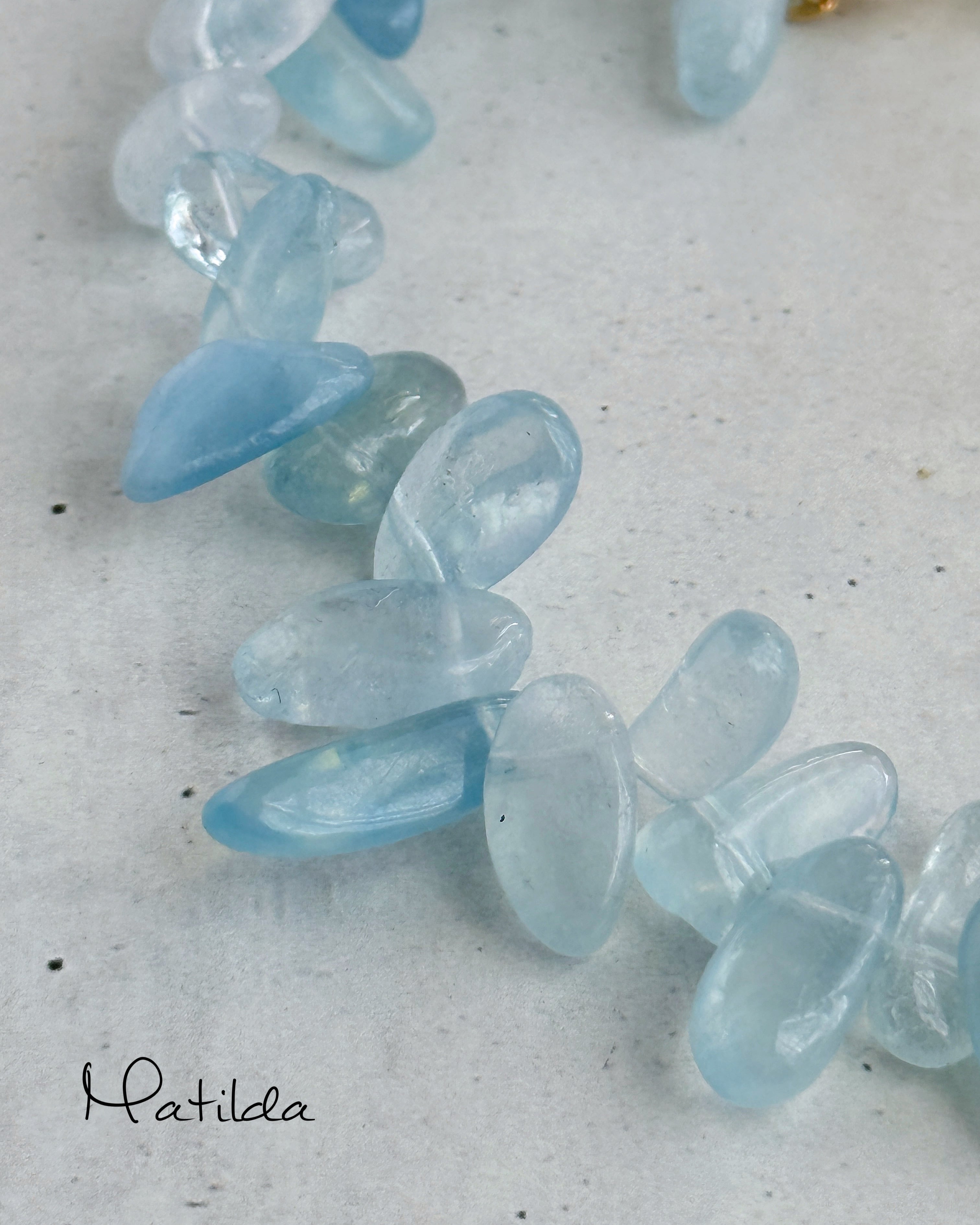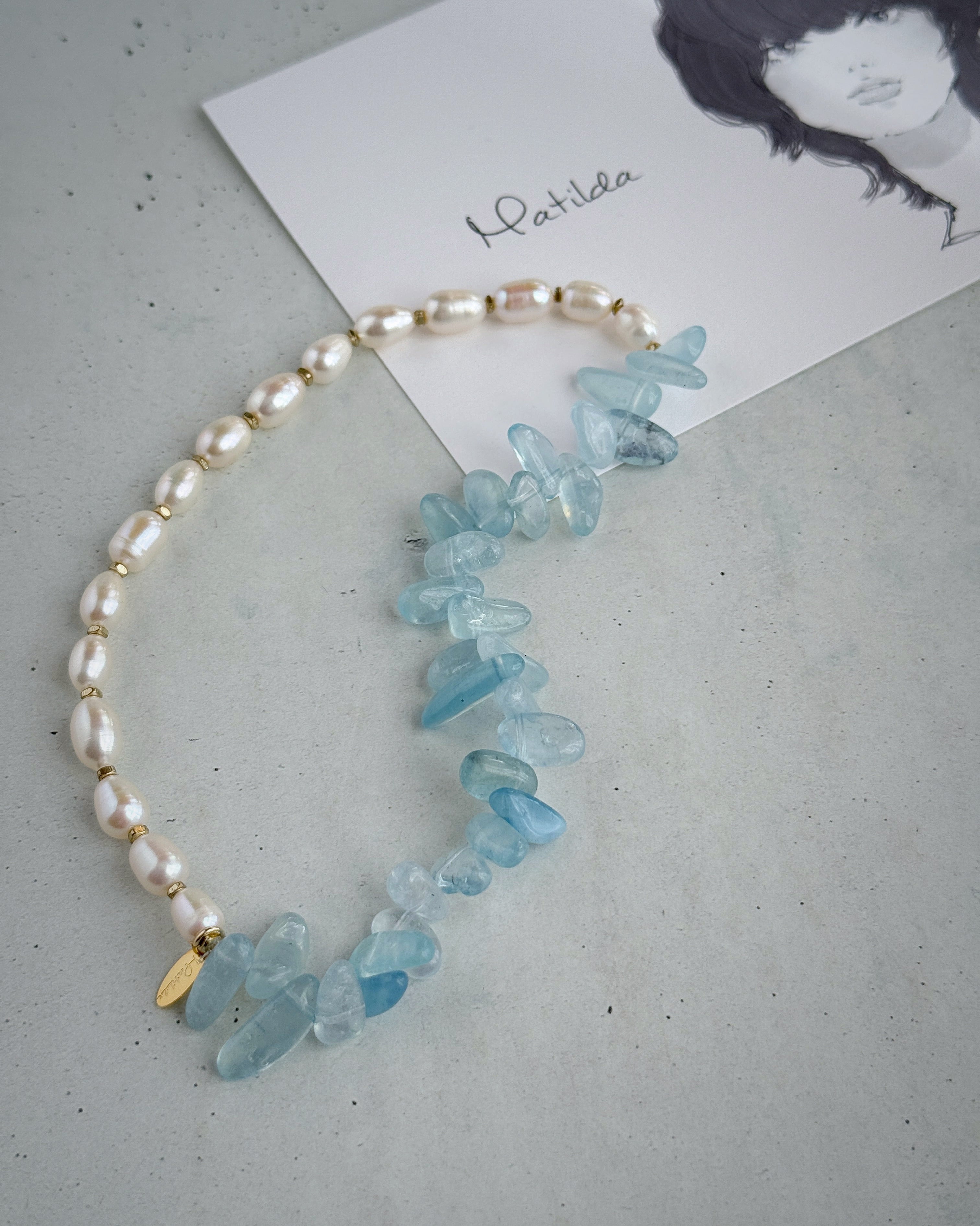 ゴールドカラーの真鍮ビーズで繋いだオーバルパールと、シーグラスのような柔らかな存在感が愛らしいアクアマリンのクリアなライトブルーを合わせて。