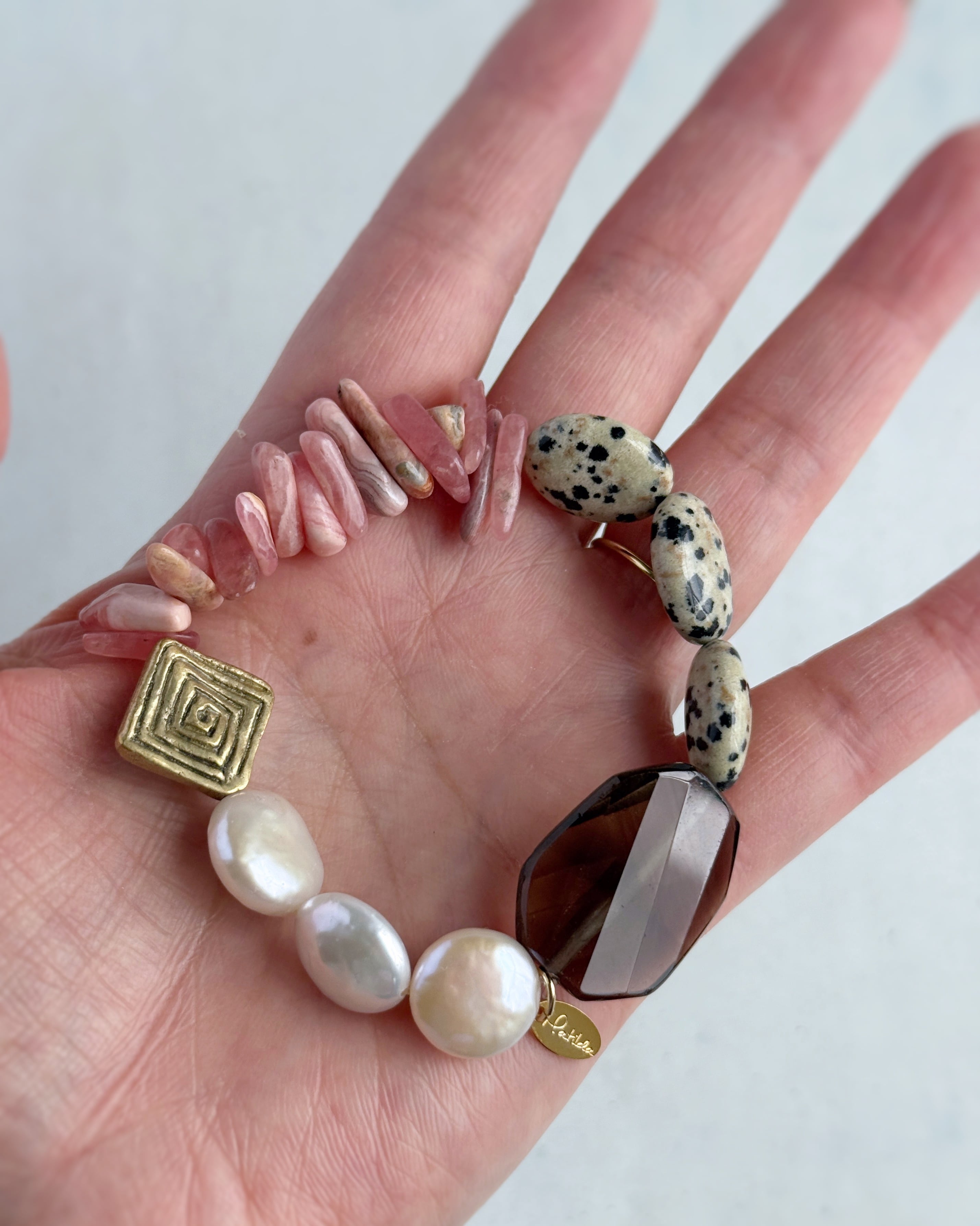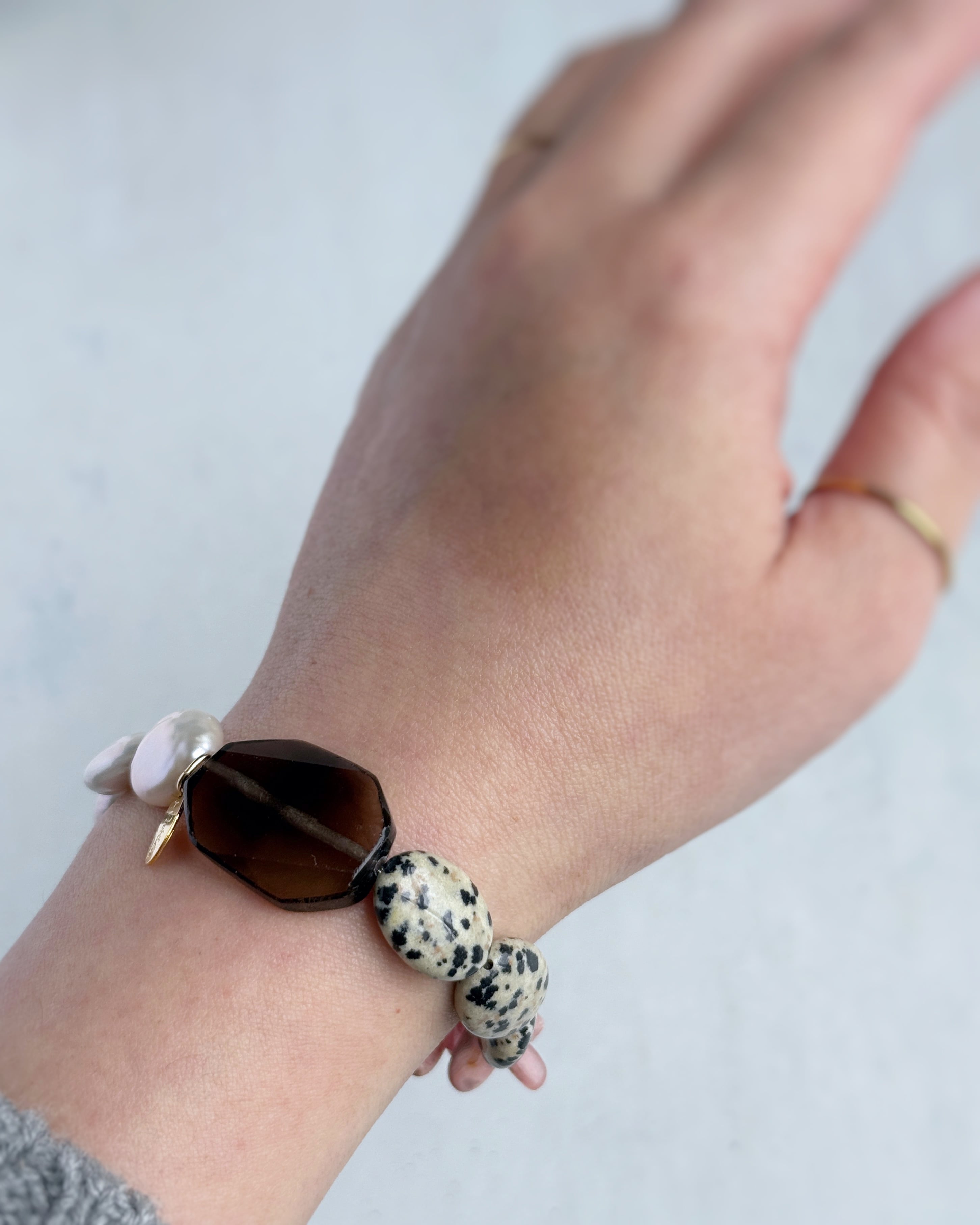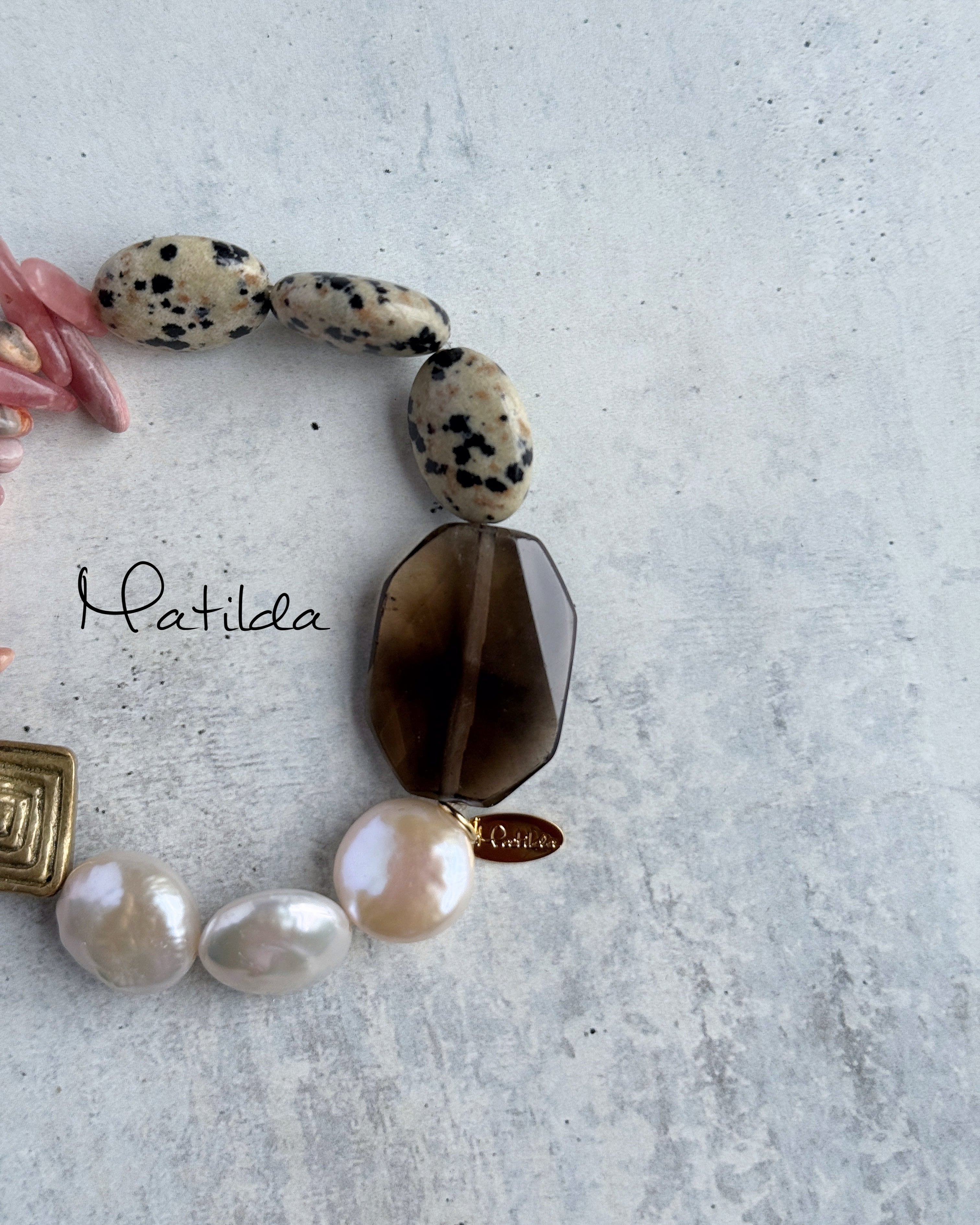 ナチュラルなシェイプがスタイリッシュなパールに、ユニークな真鍮ビーズ、コケティッシュなダルメシアンジャスパーに、インカローズのチップ。奔放にうねるマテリアルの色彩を、大粒のスモーキークォーツがぐっと引き締め、まとめ上げて。