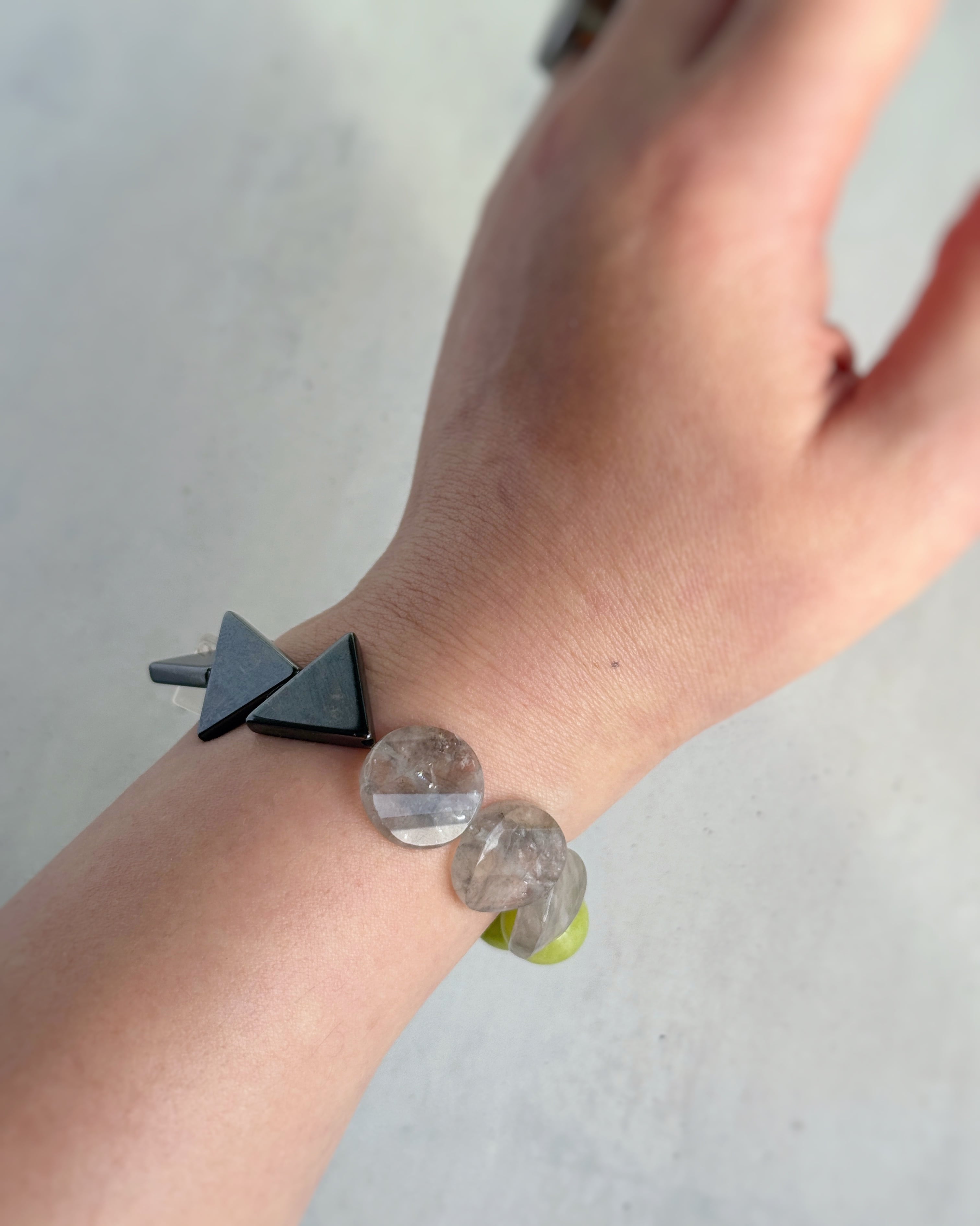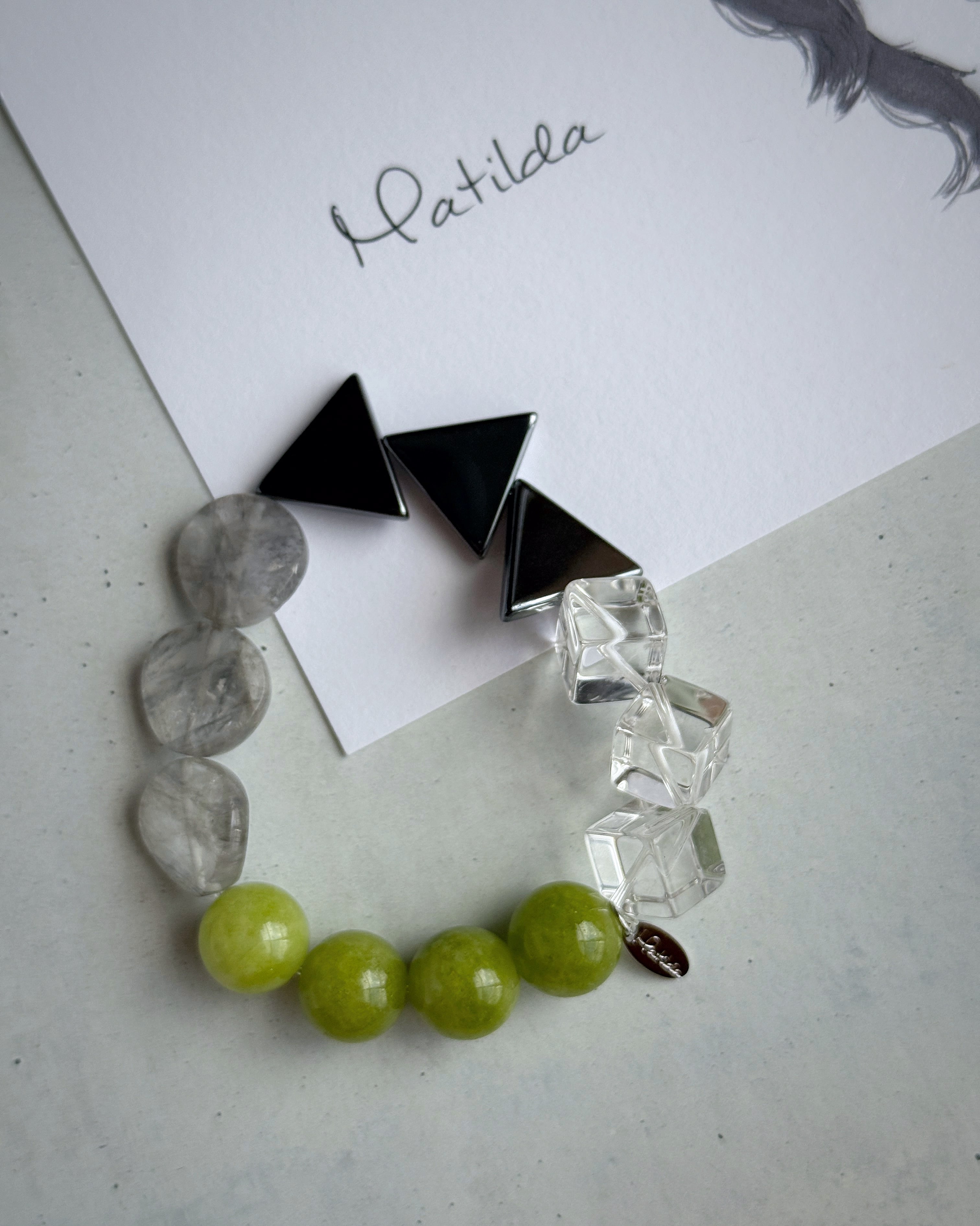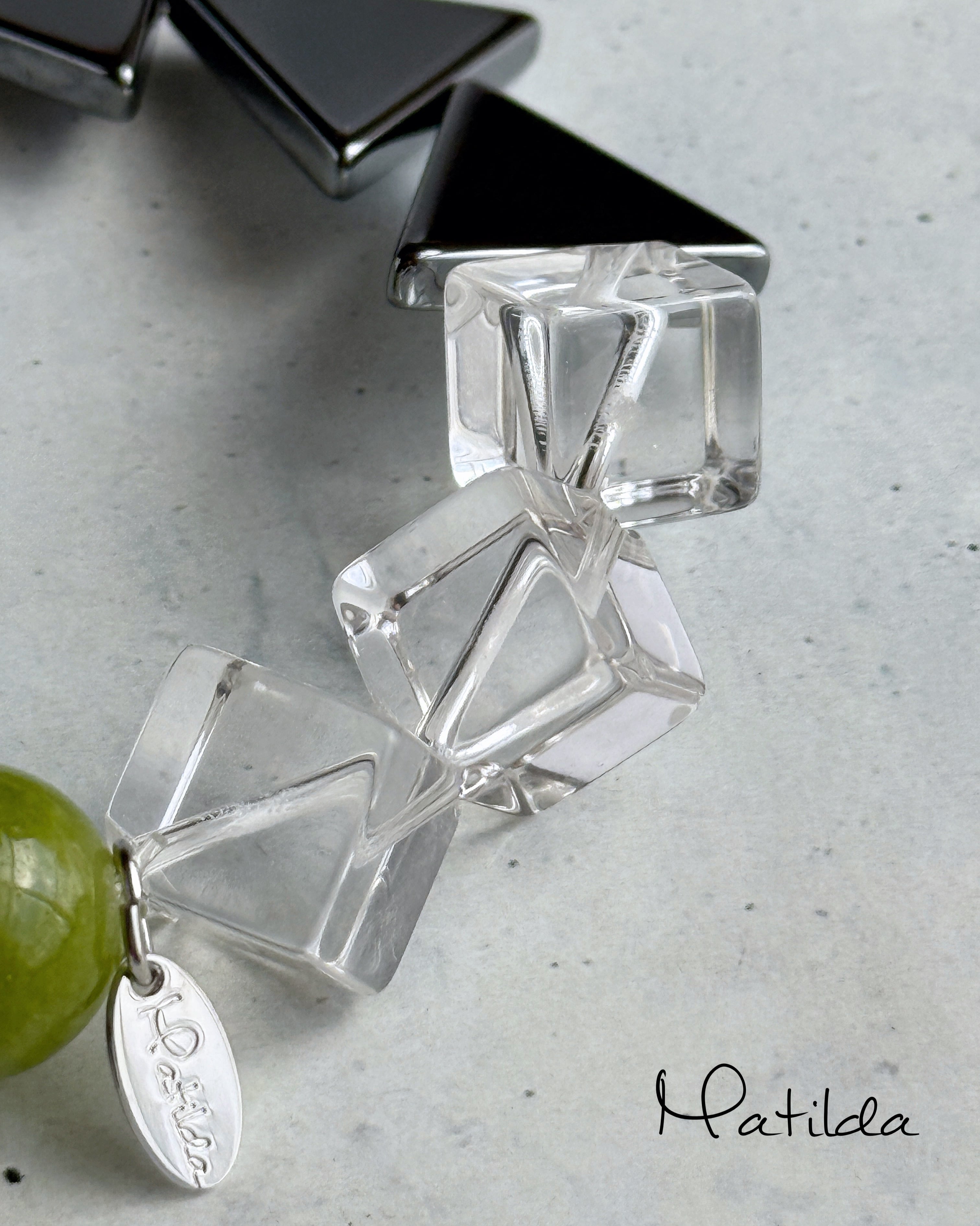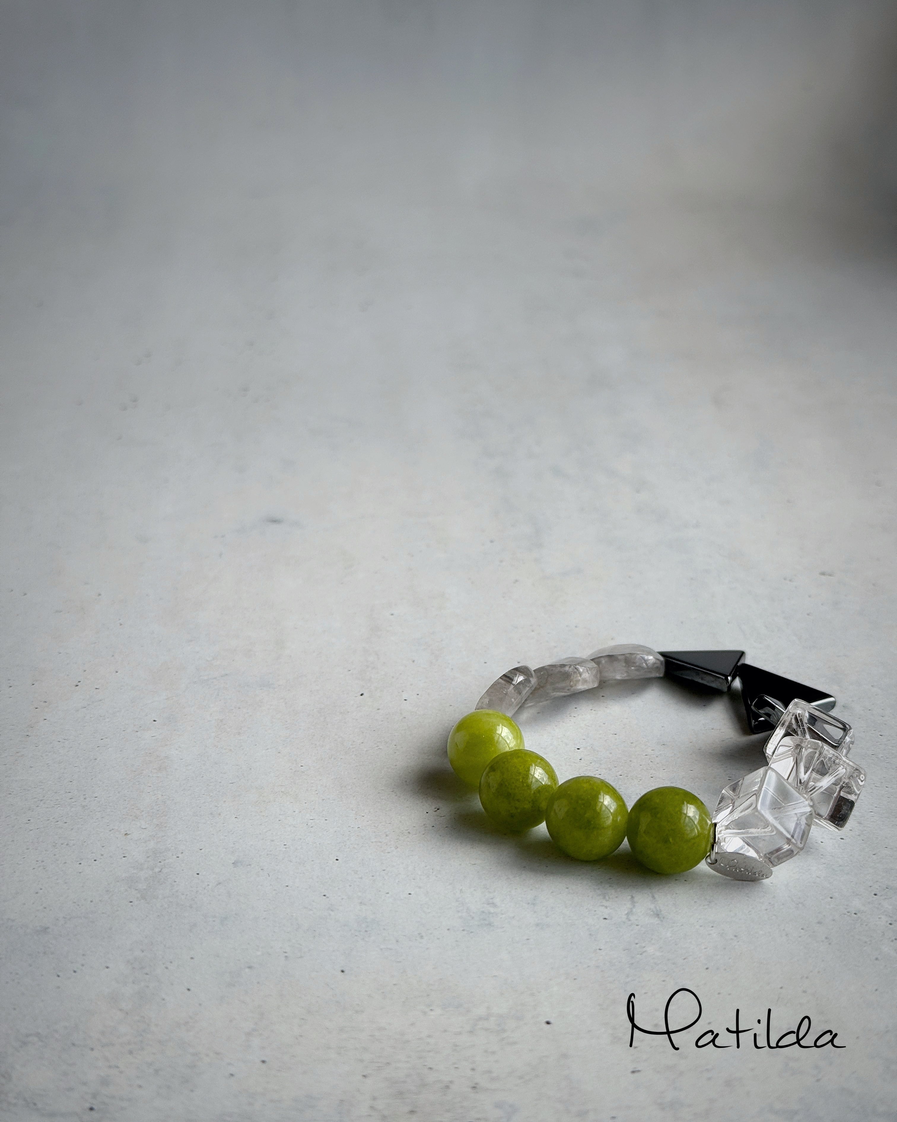 クォーツのクリアキューブ、グレークォーツのツイステッド・コイン、鮮やかなグリーンのマレーシアジェイドを、トライアングルのクールなヘマタイトがスパイシィに引き締めて。