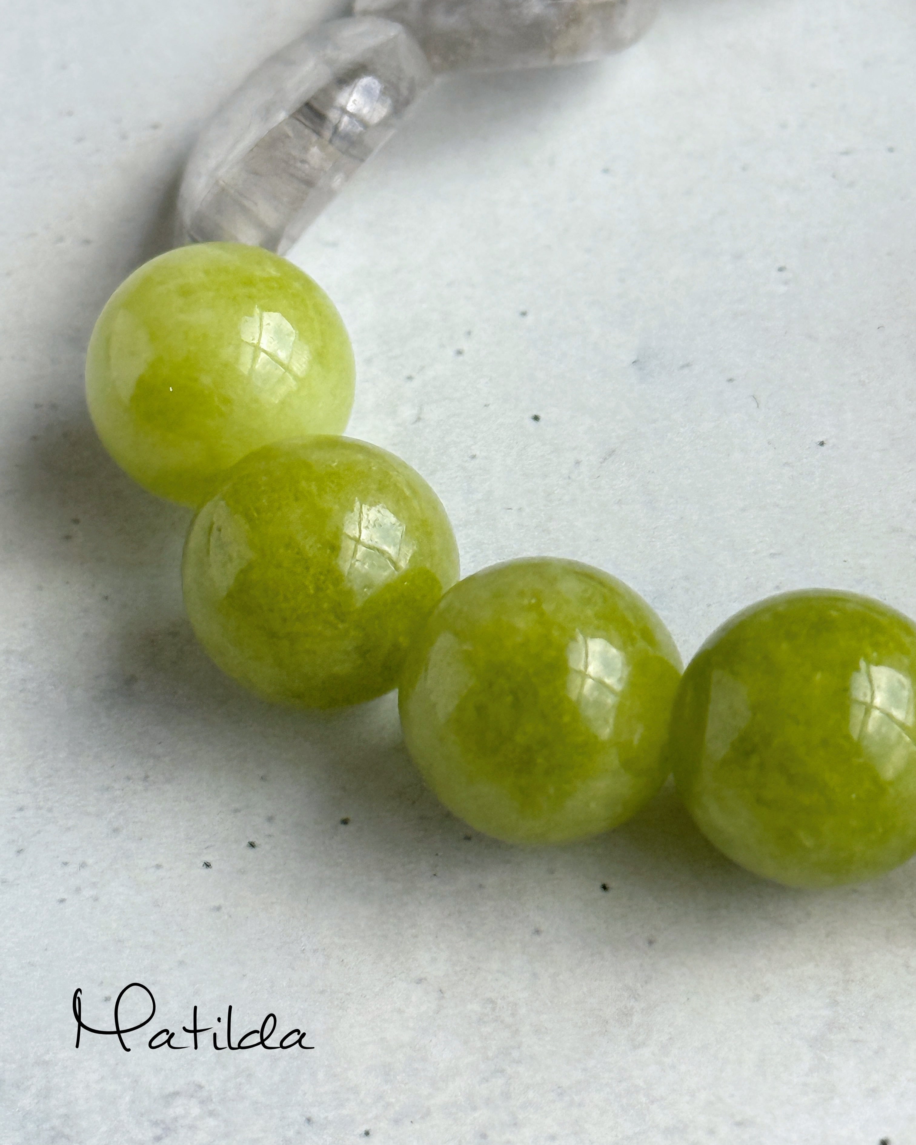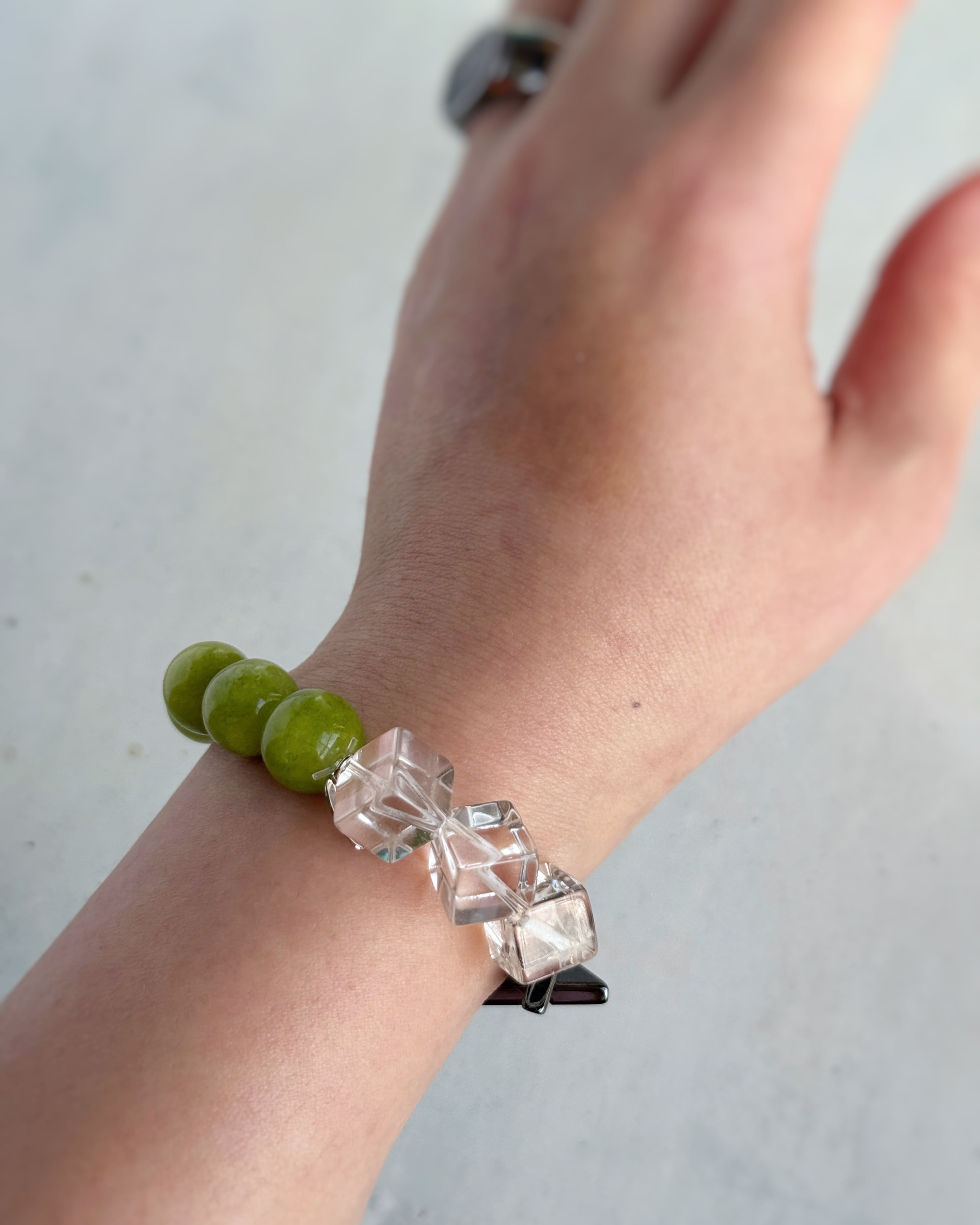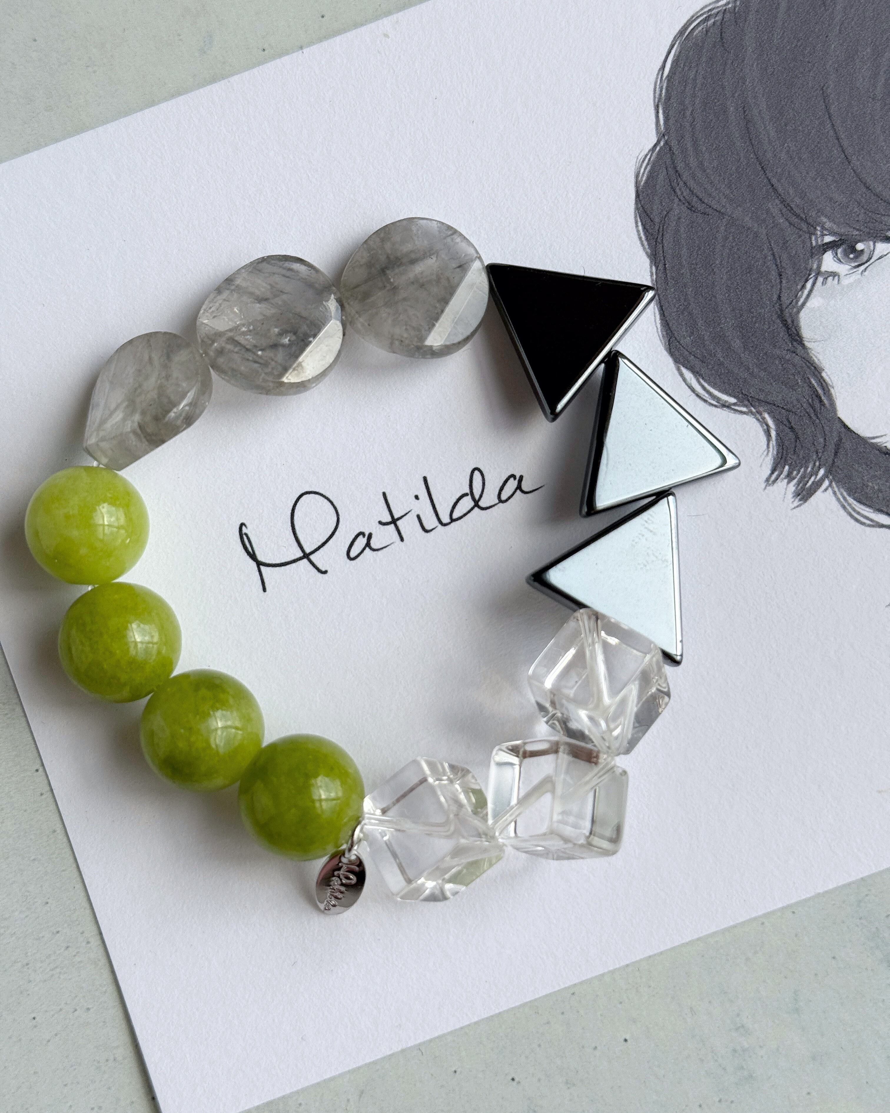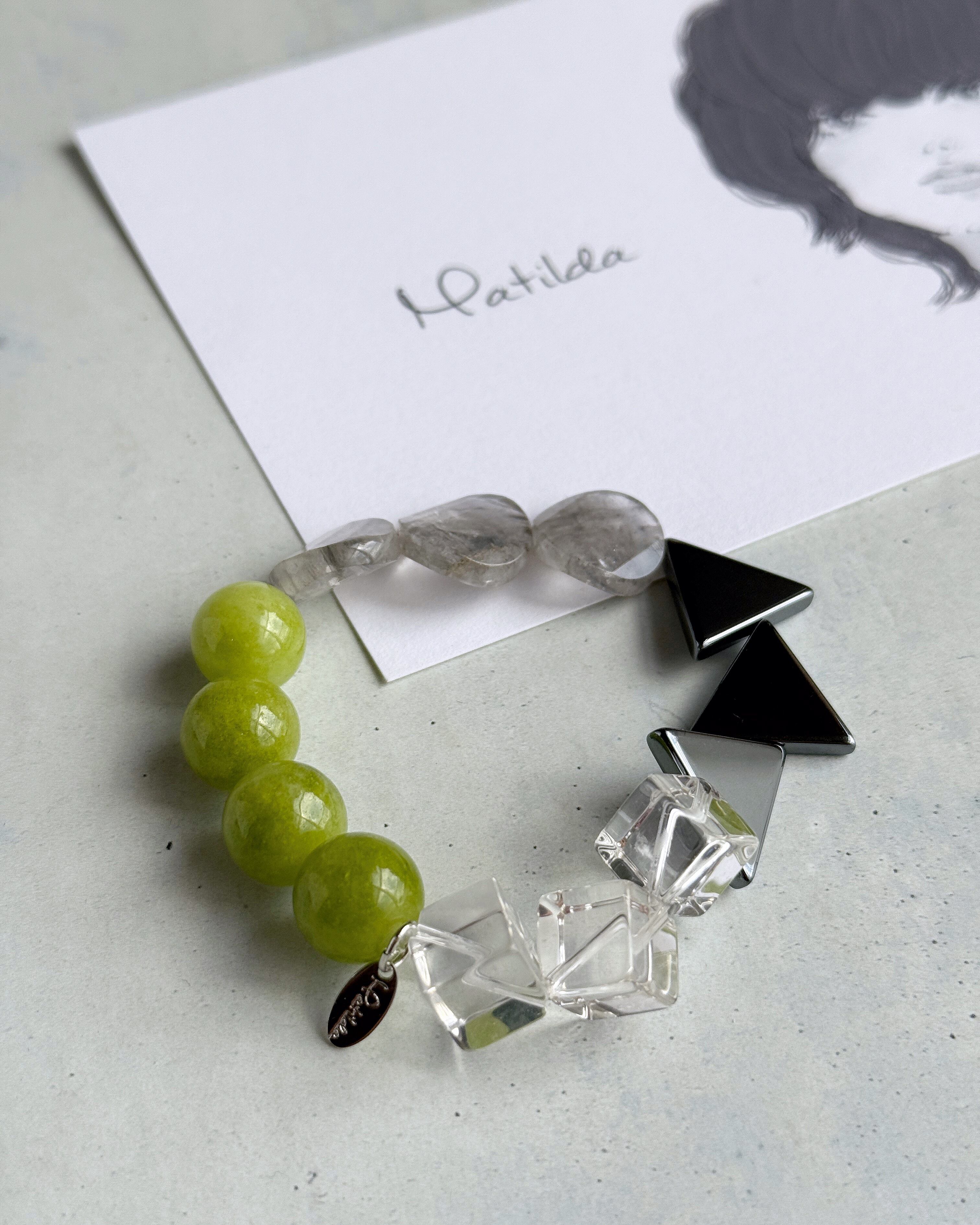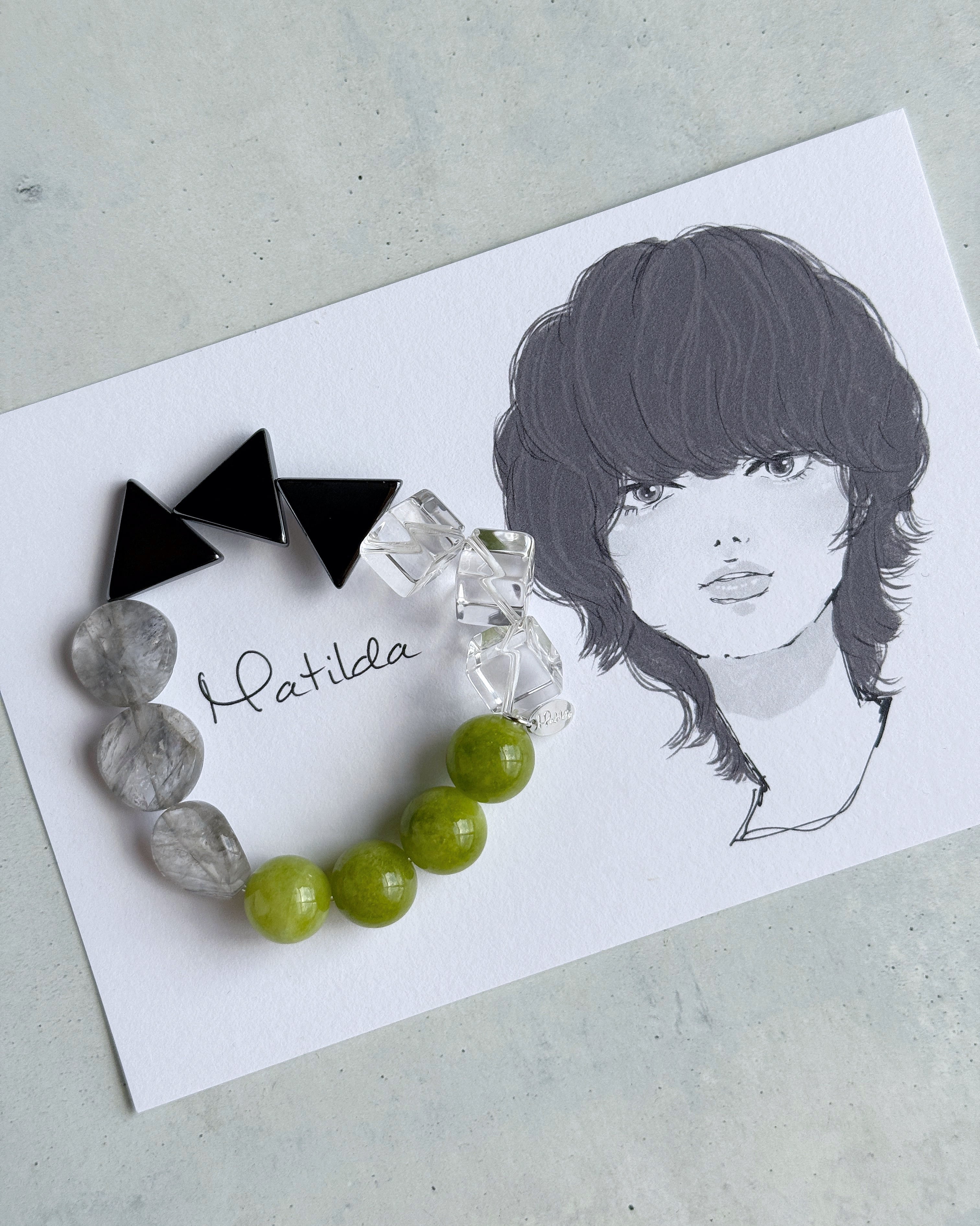 クォーツのクリアキューブ、グレークォーツのツイステッド・コイン、鮮やかなグリーンのマレーシアジェイドを、トライアングルのクールなヘマタイトがスパイシィに引き締めて。