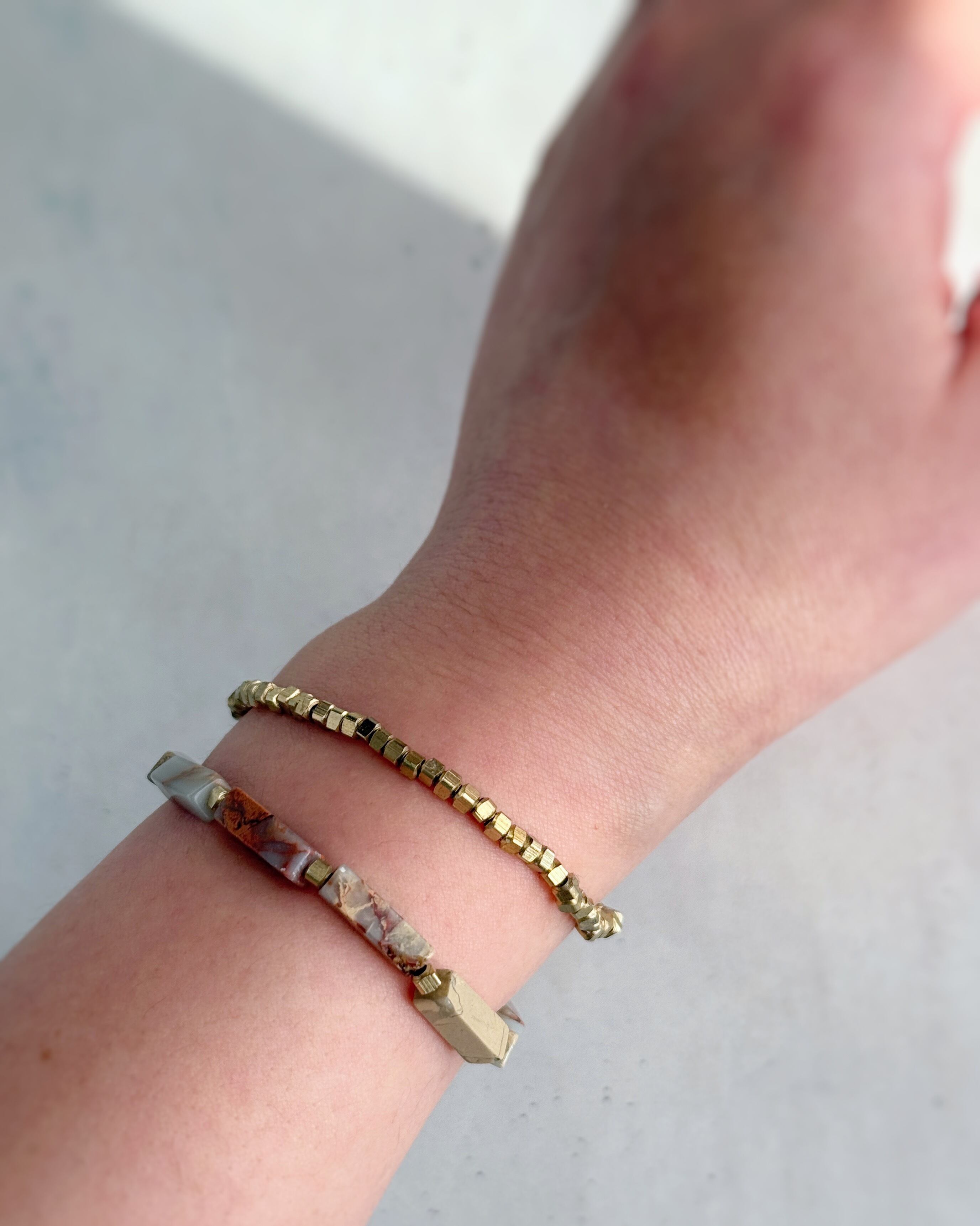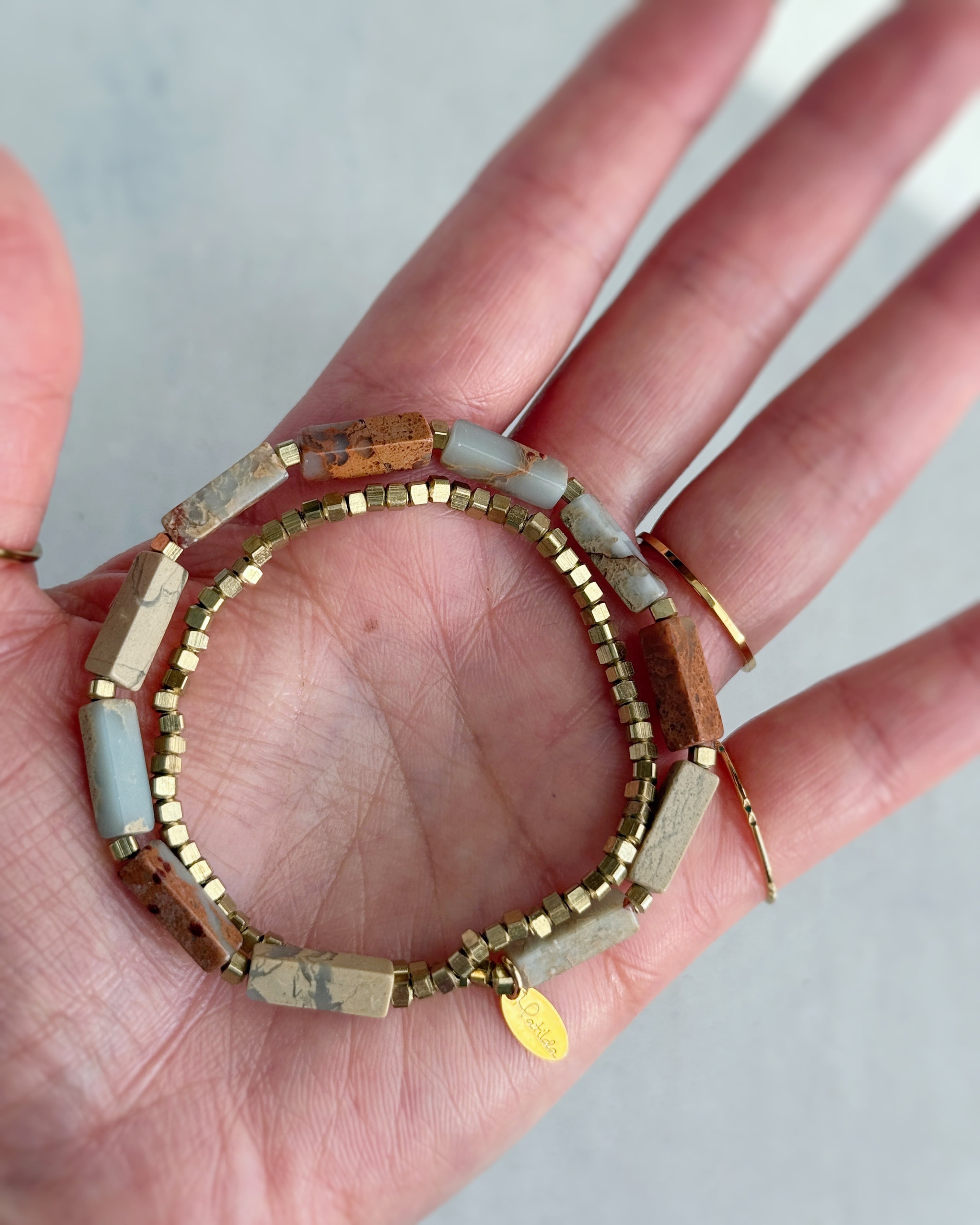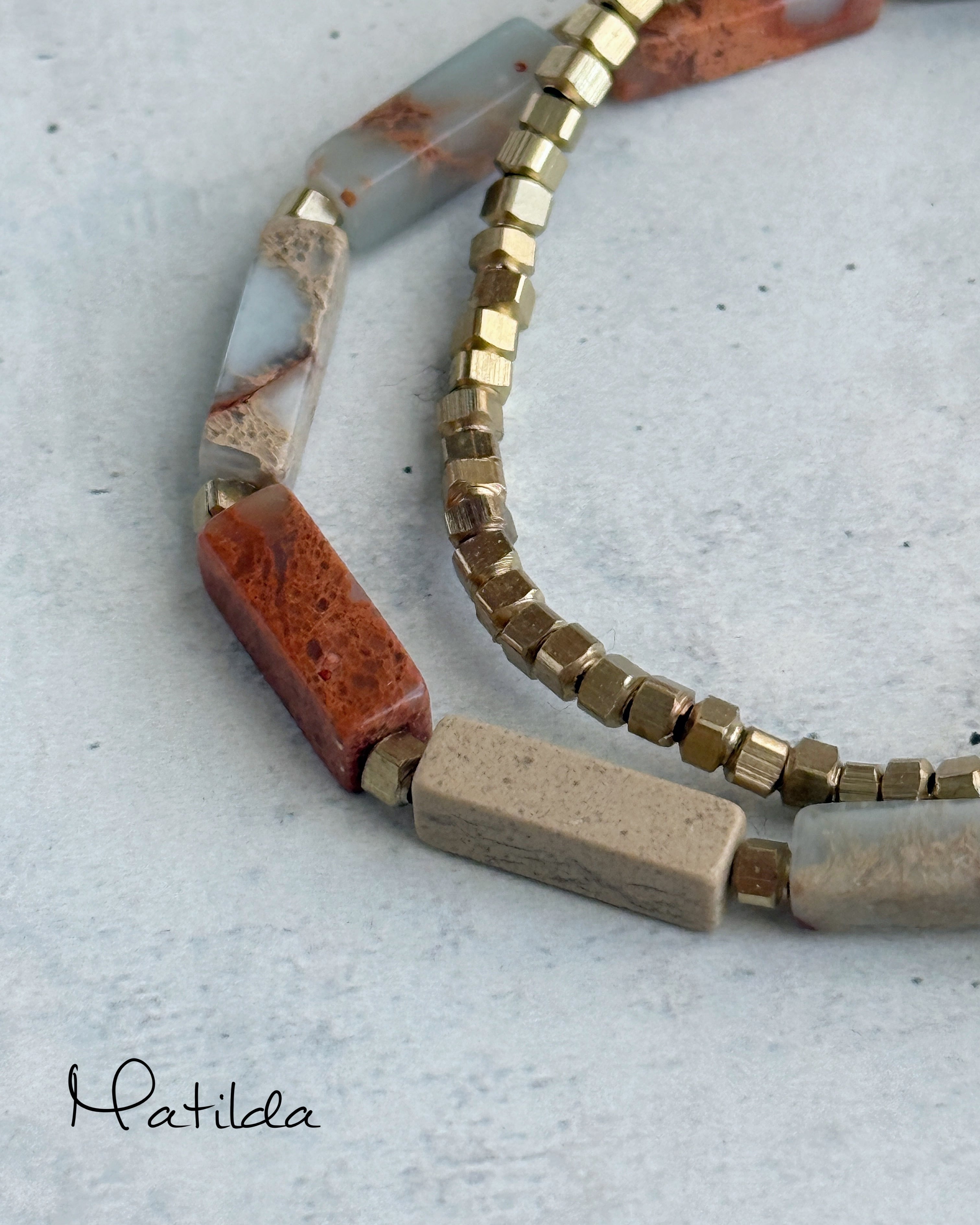 ソフトなアースカラーとエッジの立ったシャープなシェイプが洗練されたインプレッションストーンに、ゴールドカラーのメタルビーズを合わせて。