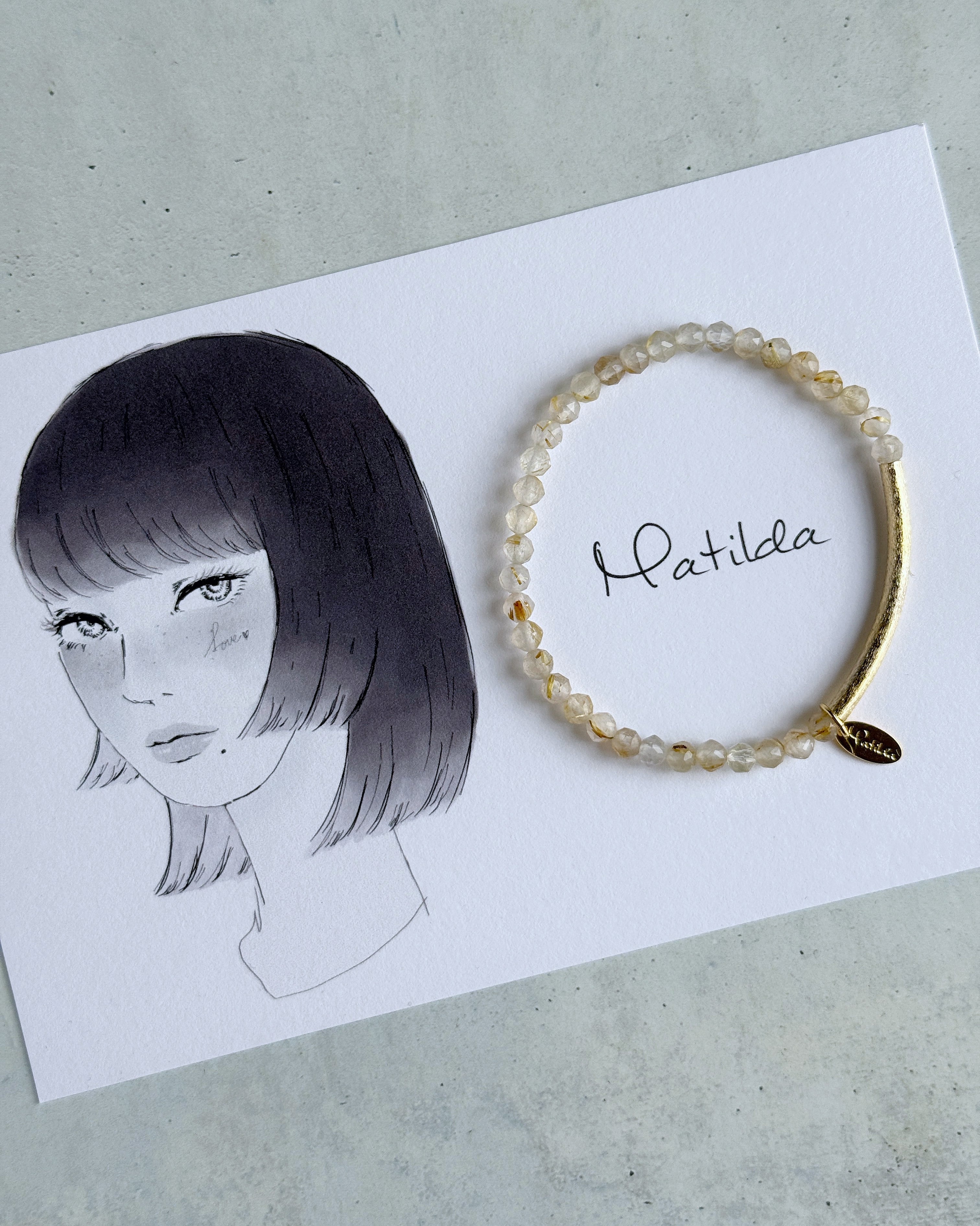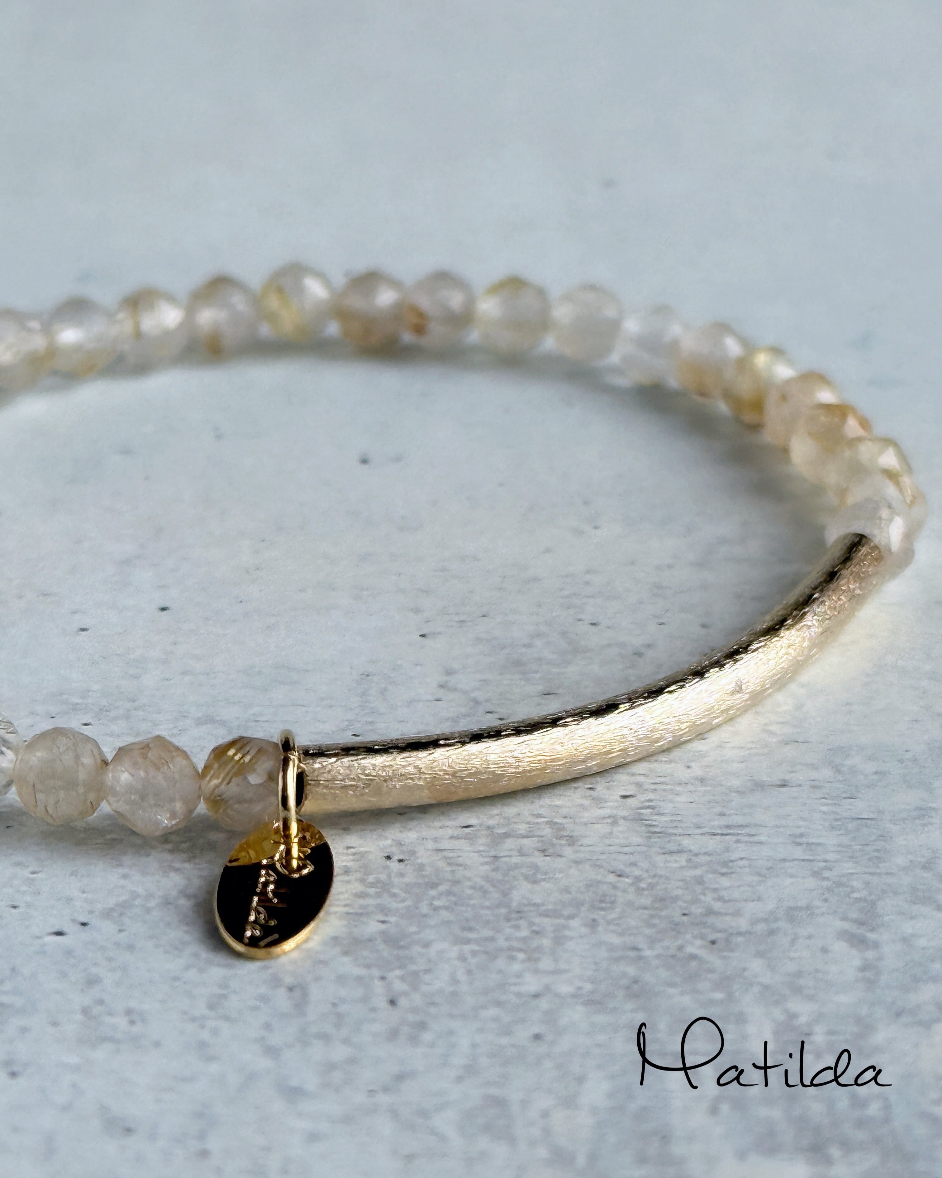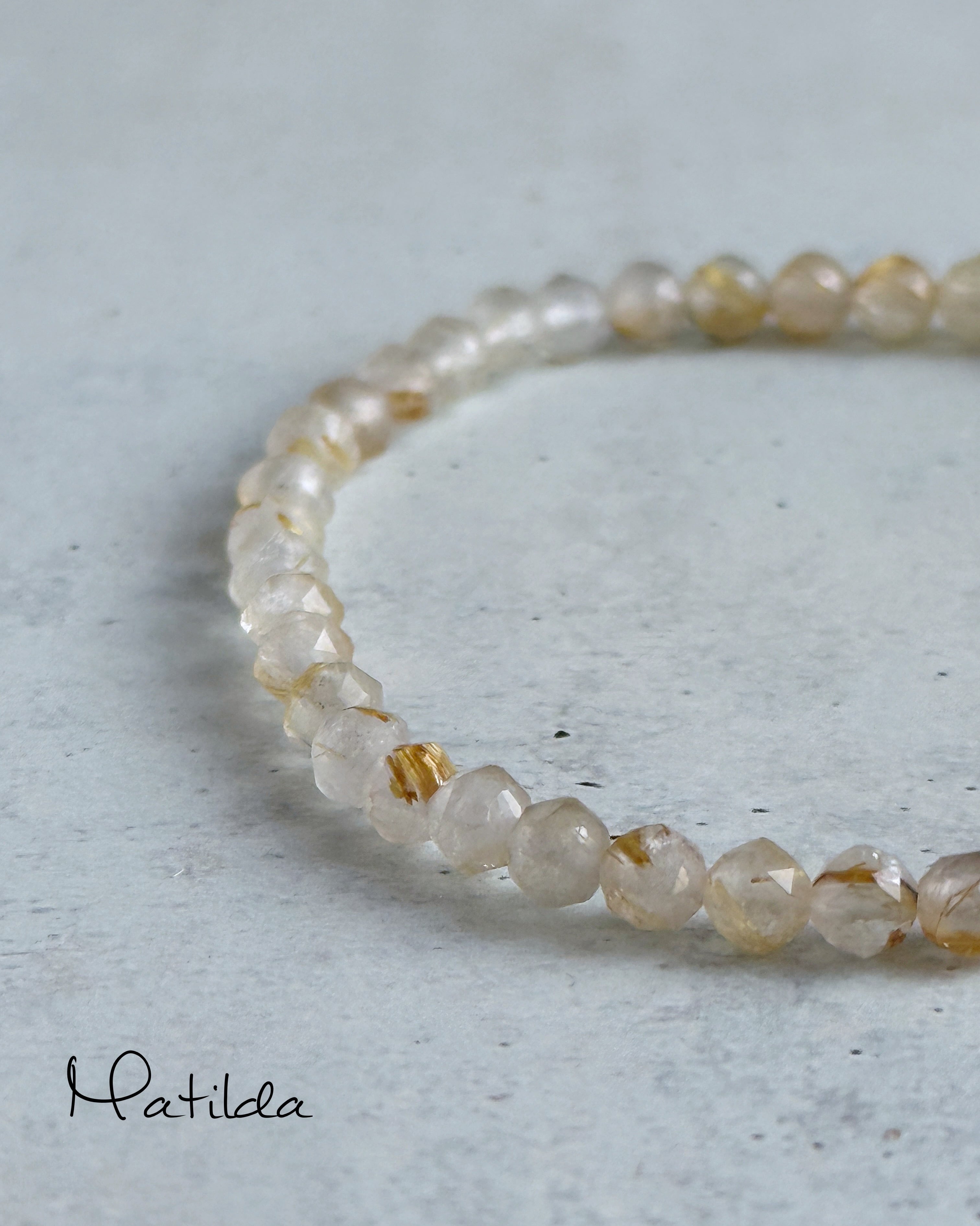 繊細なゴールドカラーのインピュリティがきらめくルチルクォーツに、ざらりとした質感の真鍮ビーズを合わせて。