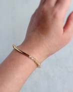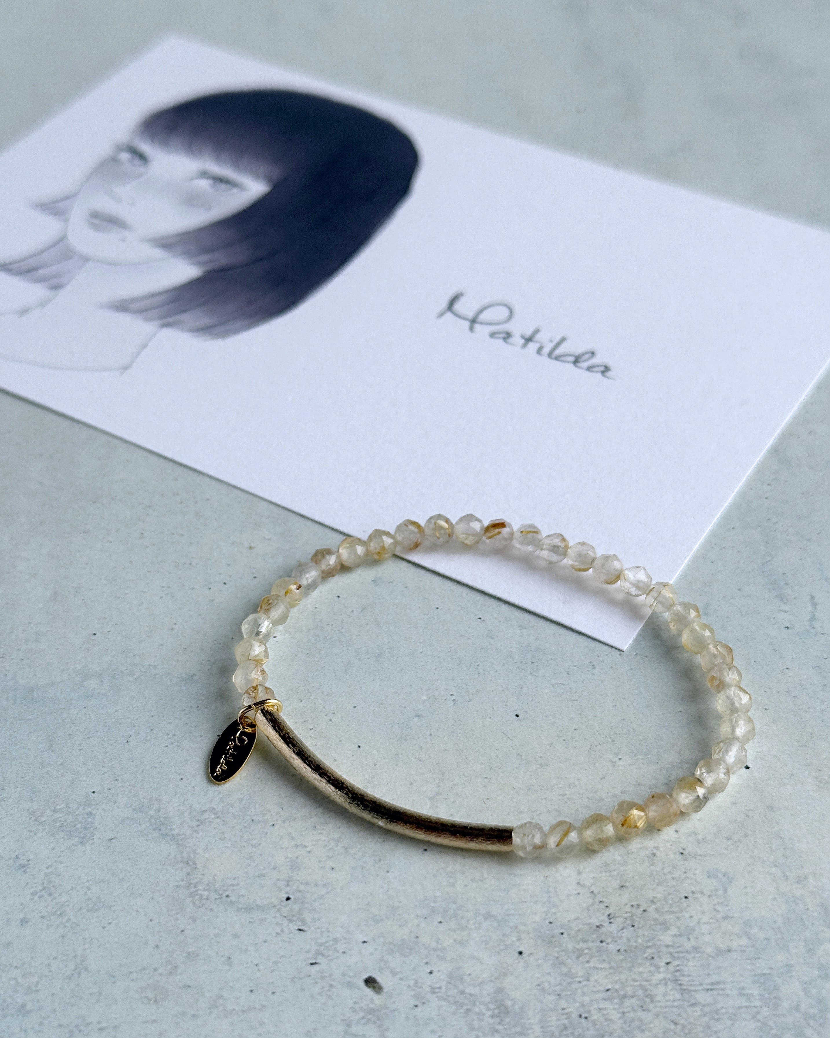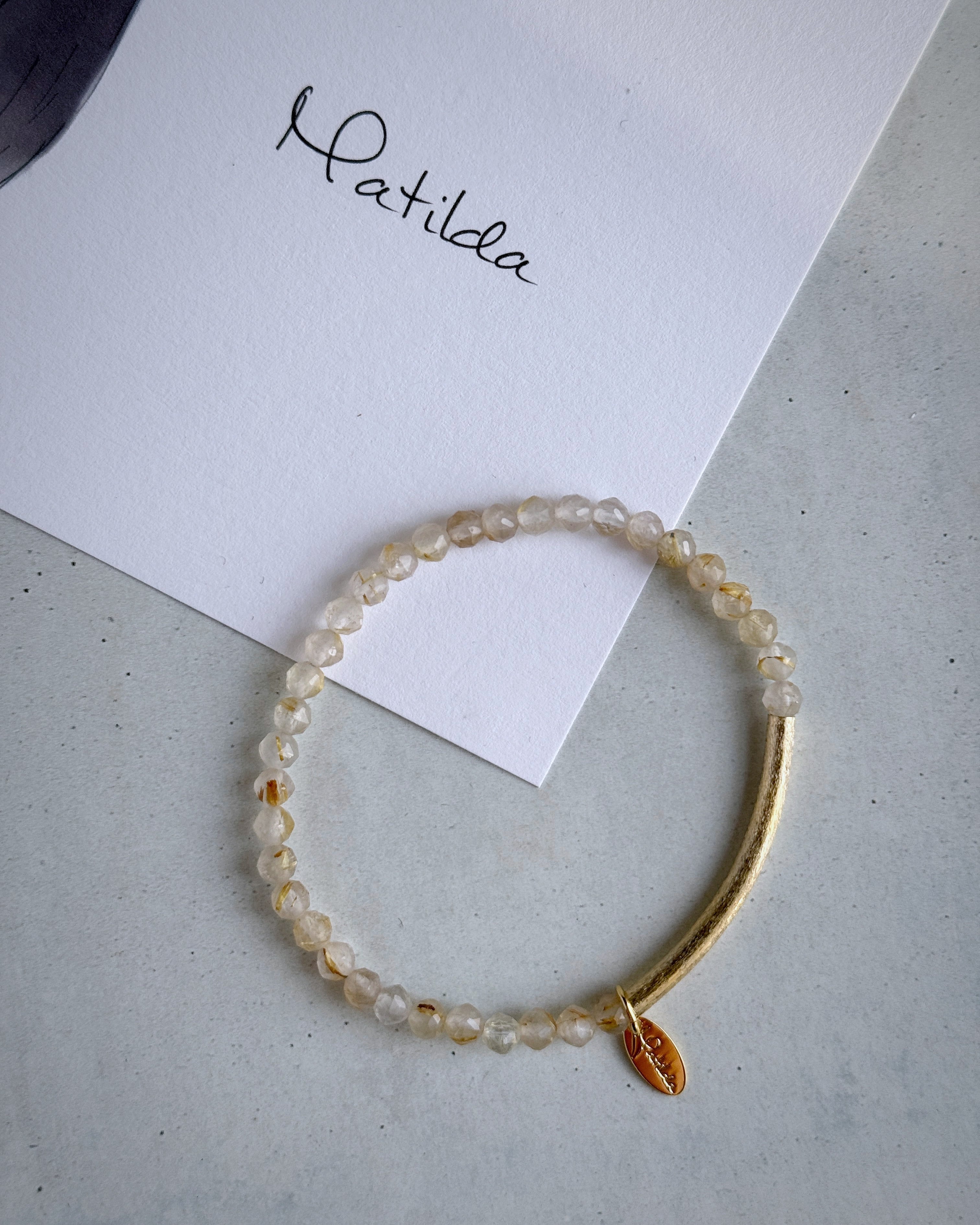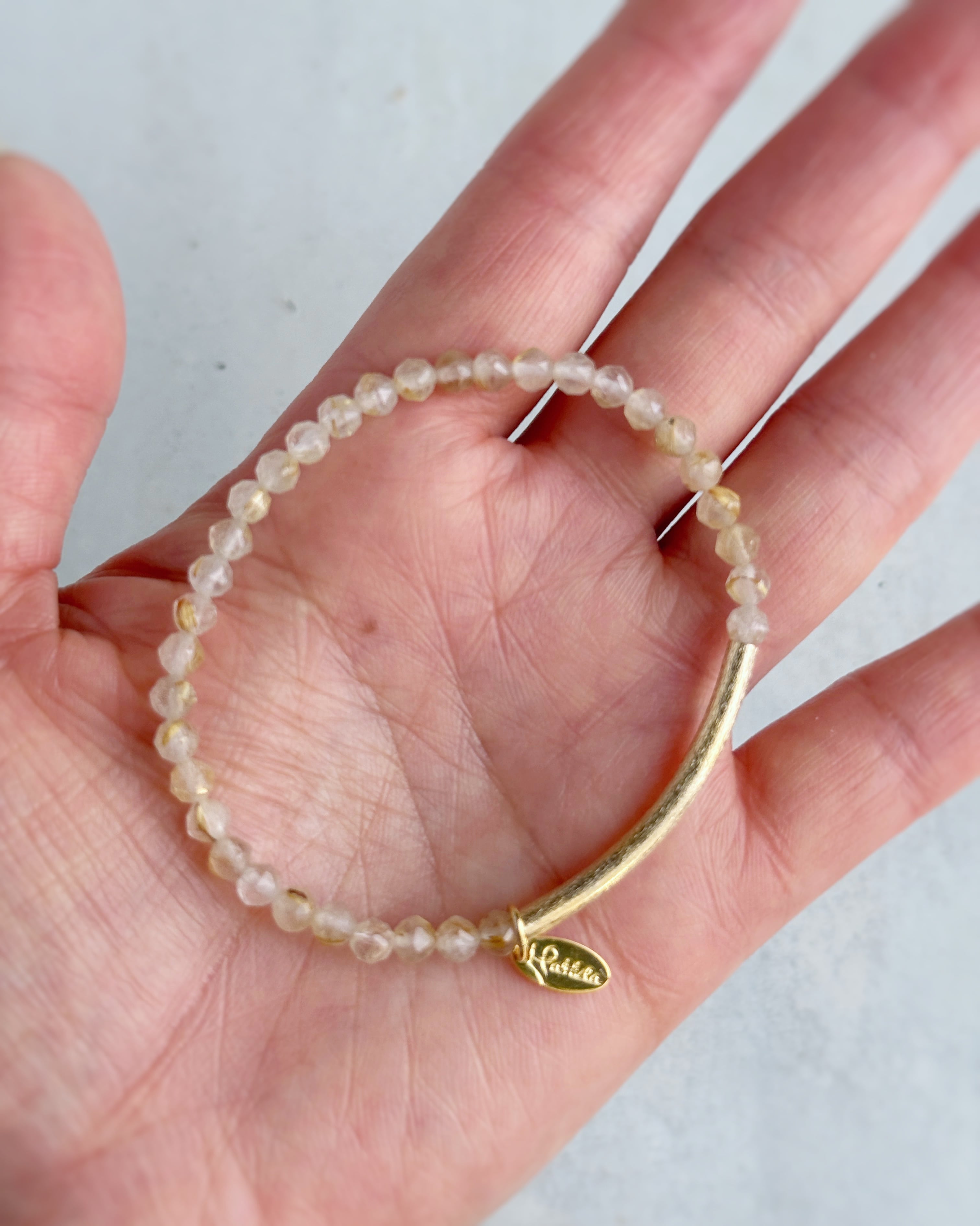 繊細なゴールドカラーのインピュリティがきらめくルチルクォーツに、ざらりとした質感の真鍮ビーズを合わせて。