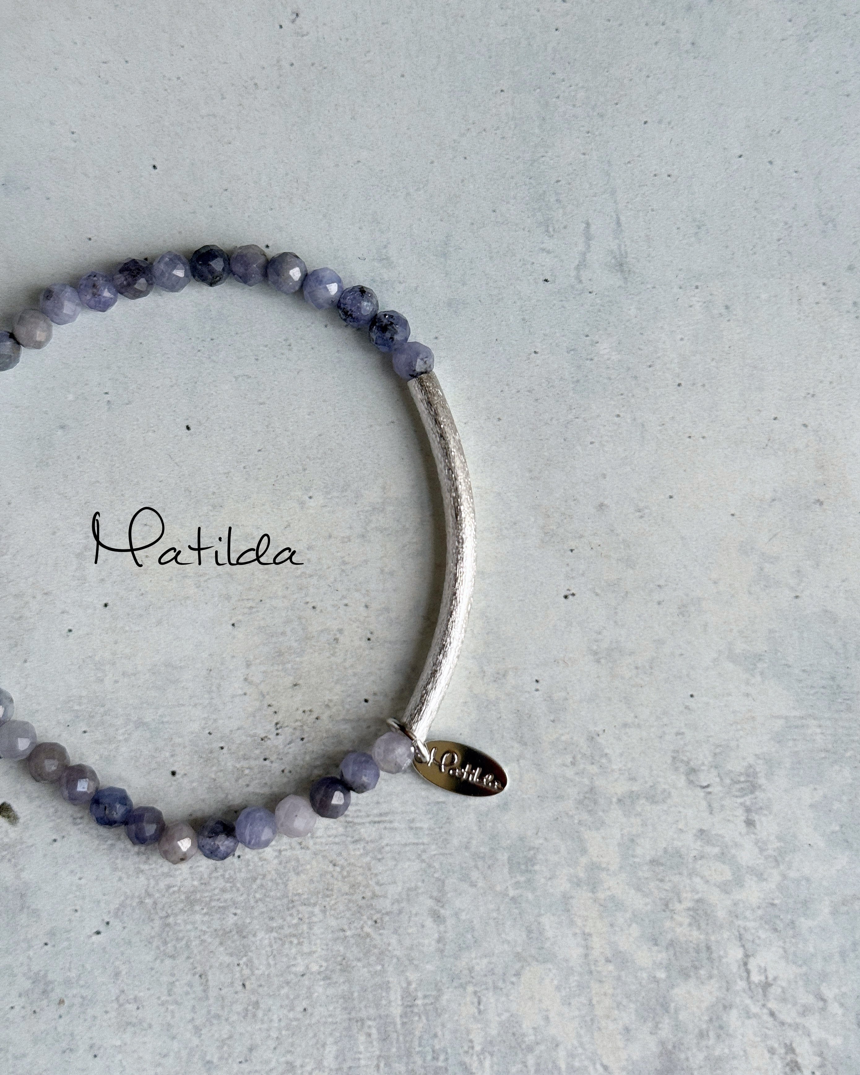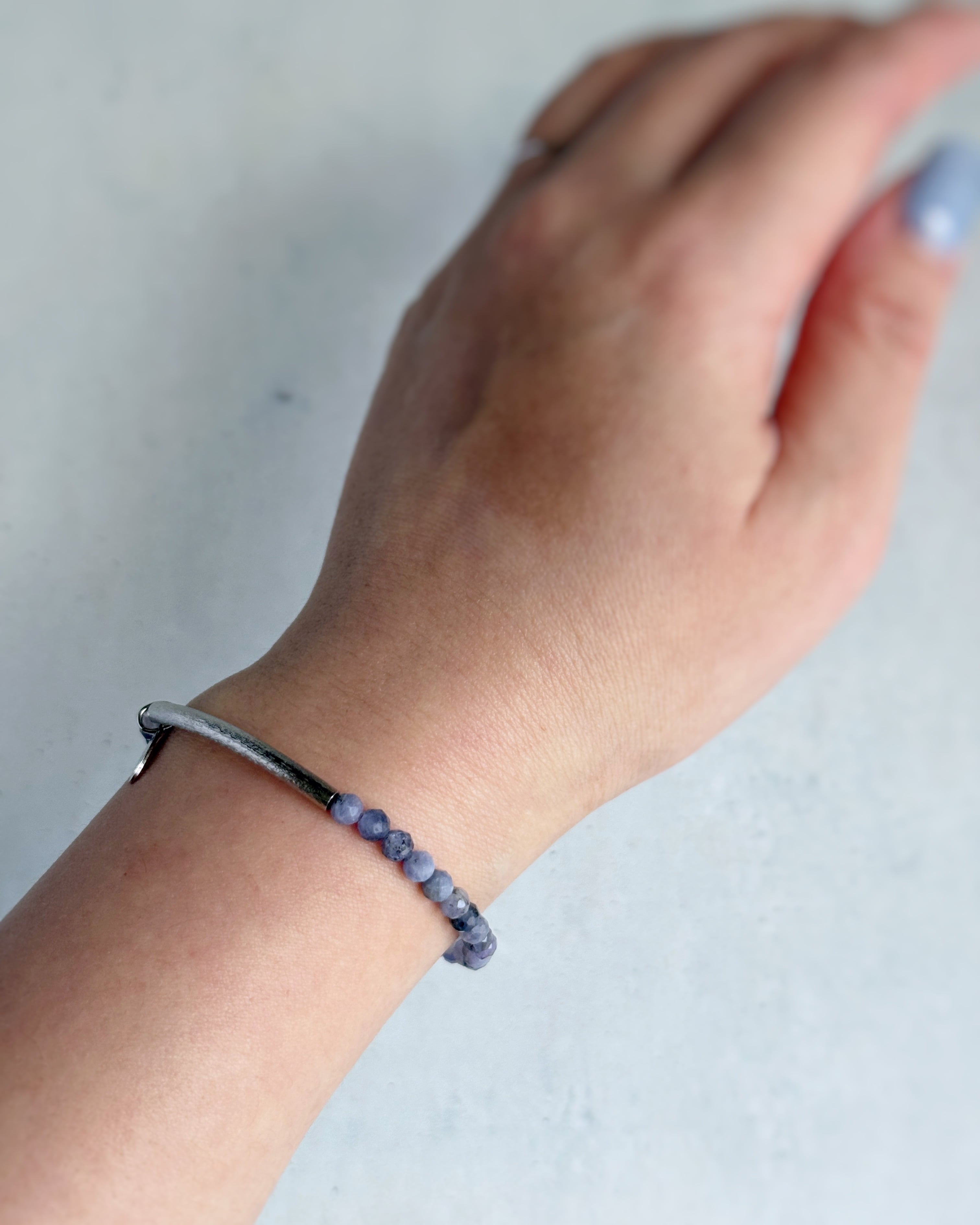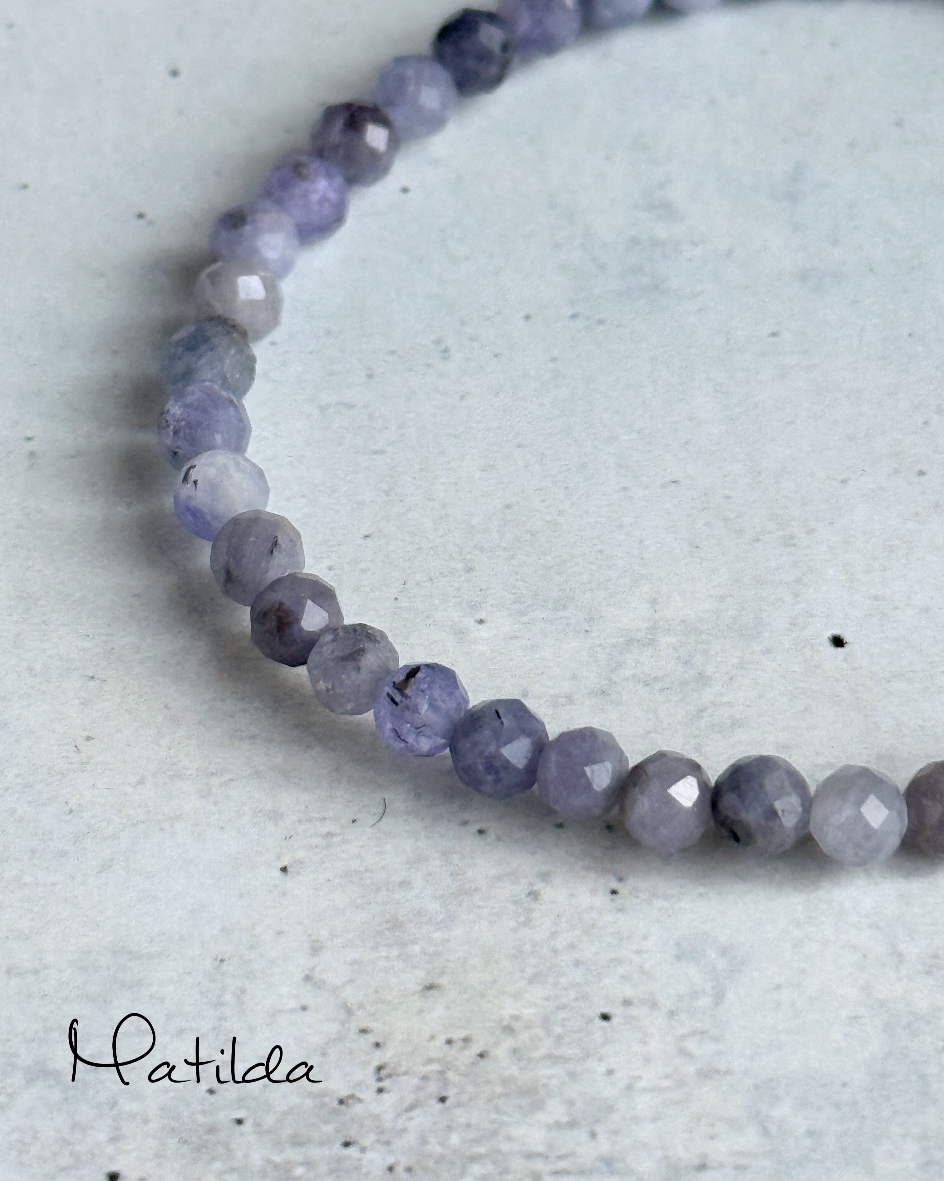 シルバーのニュアンスを含んだネイビーブルーがシックなタンザナイトに、シルバーカラーの真鍮ビーズをペアリング。