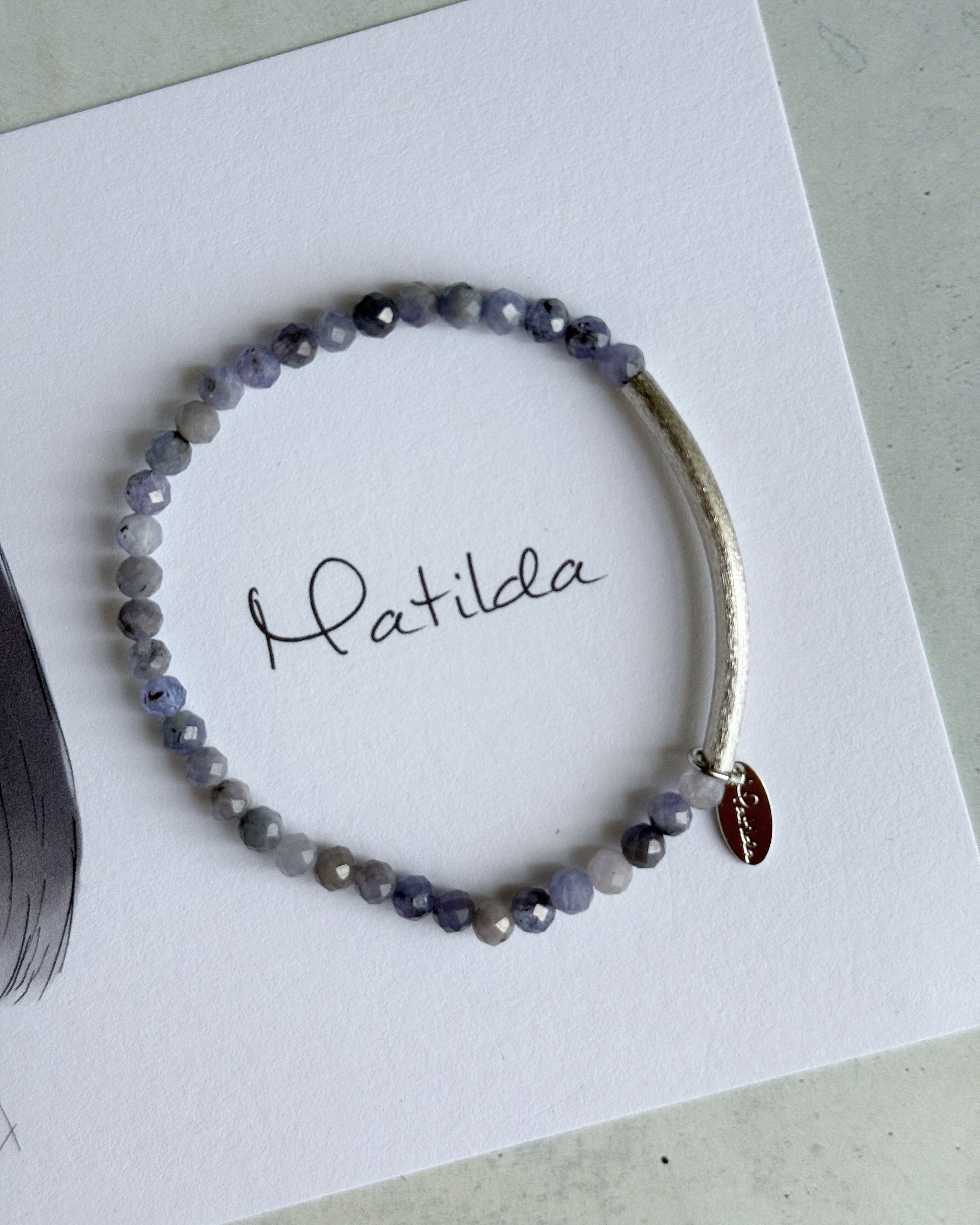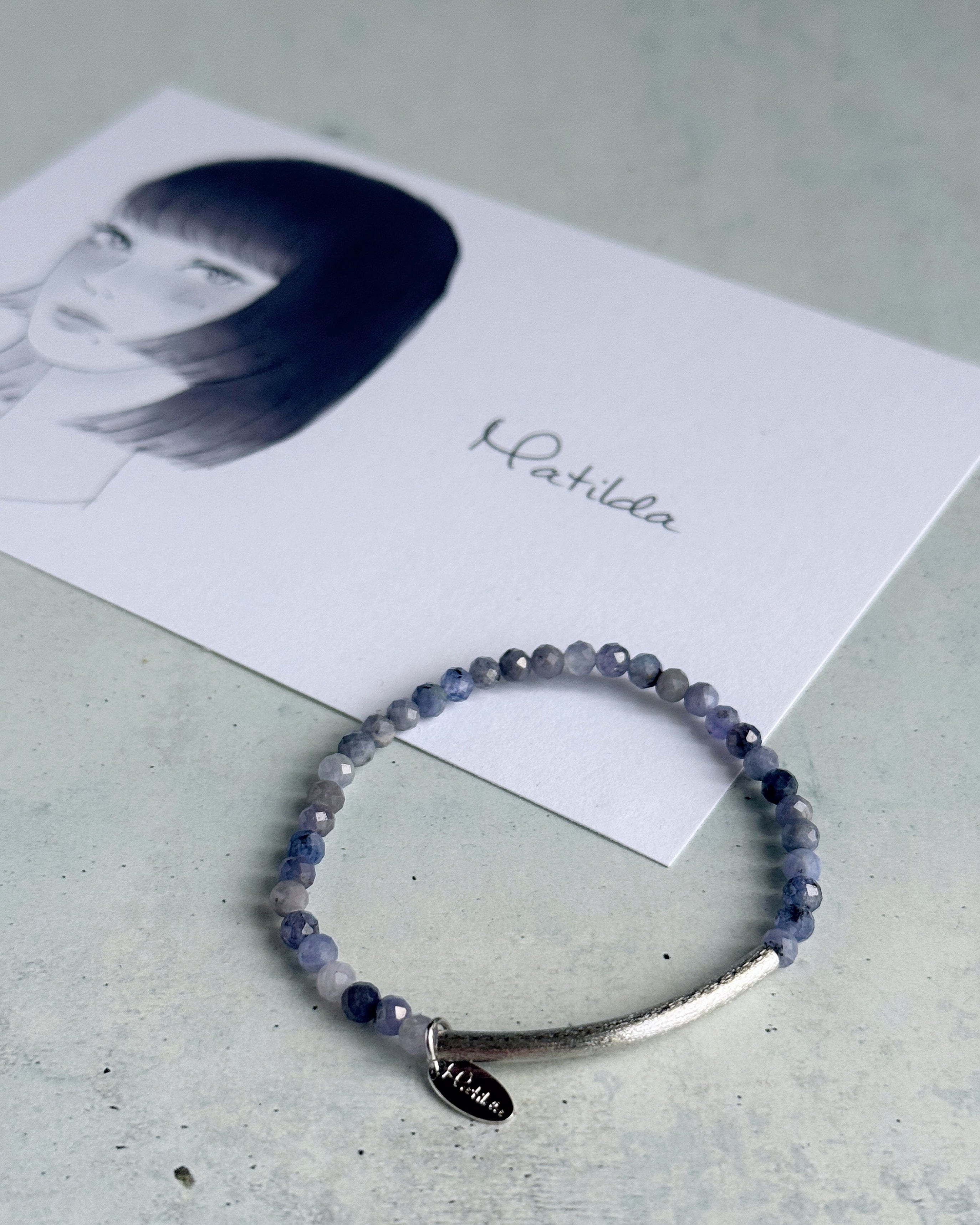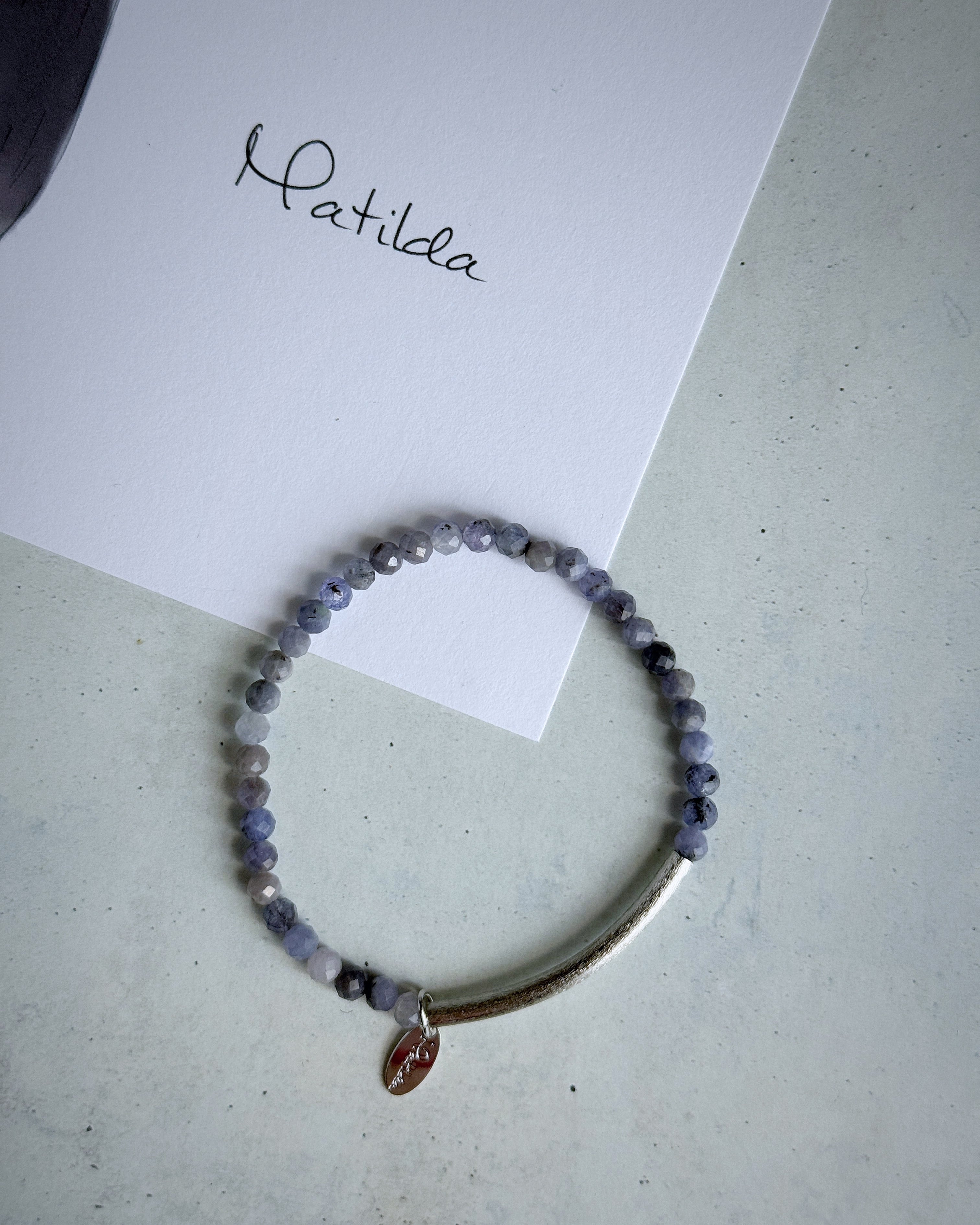 シルバーのニュアンスを含んだネイビーブルーがシックなタンザナイトに、シルバーカラーの真鍮ビーズをペアリング。