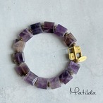 フラットなスクエアシェイプが端正なアメジストに、プリミティブなデザインがユニークなゴールドカラーの真鍮ビーズを合わせて。