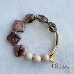 硬質な透け感のスモーキークォーツ、まろやかなアイボリーのリバーストーンのコントラストを、ローズカラーのロードナイトがシックにまとめ、ゴールドカラーの真鍮ビーズが華やかさを引き出す。