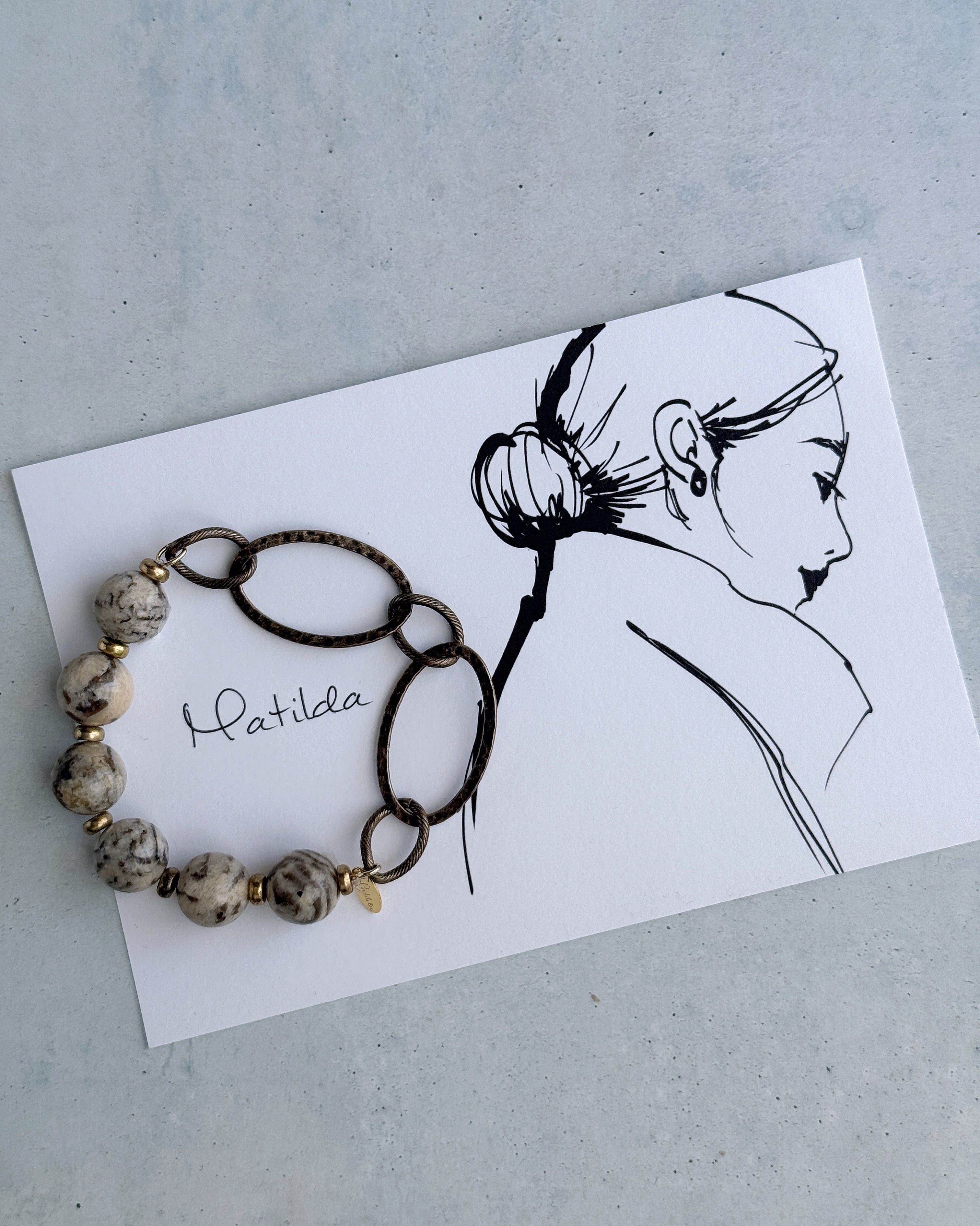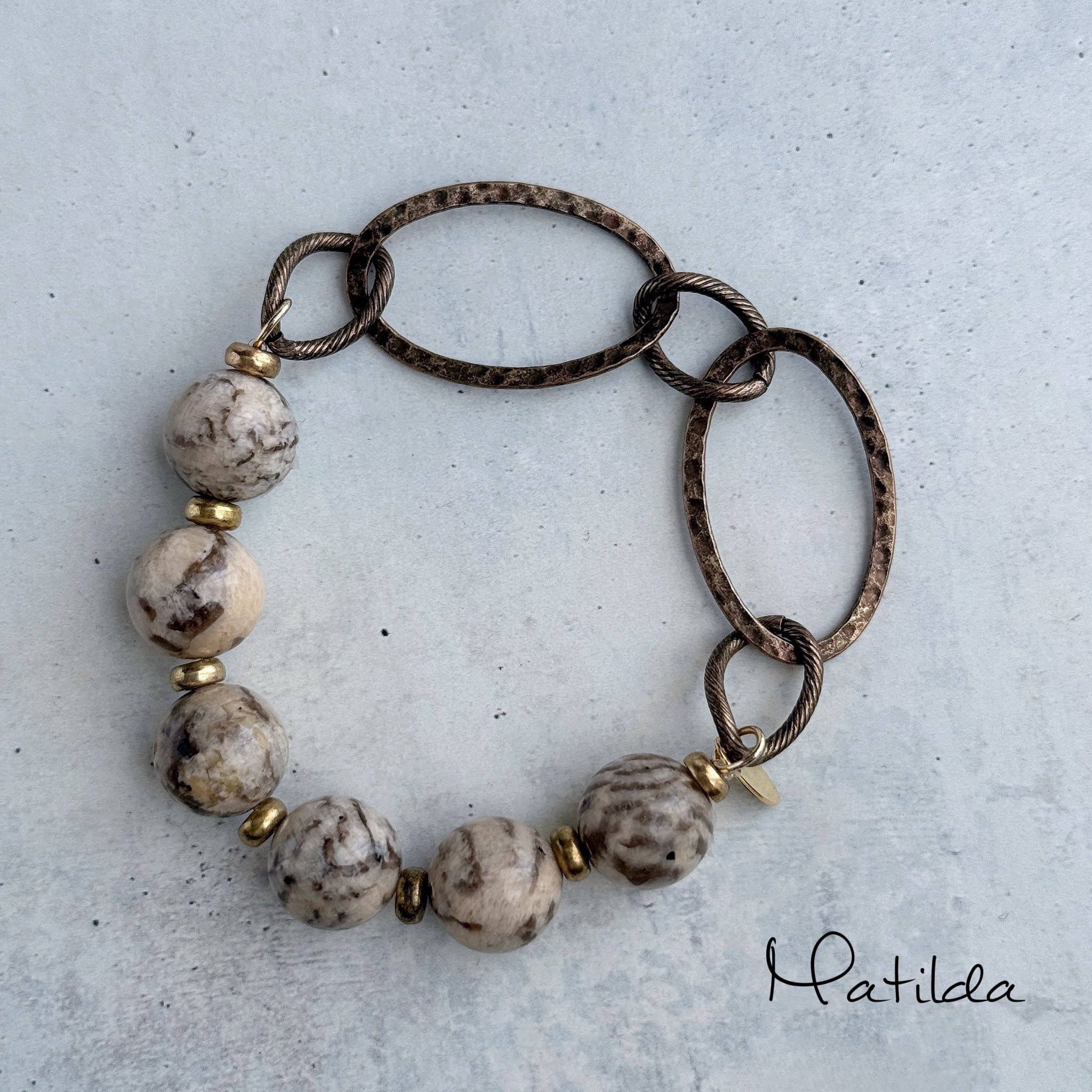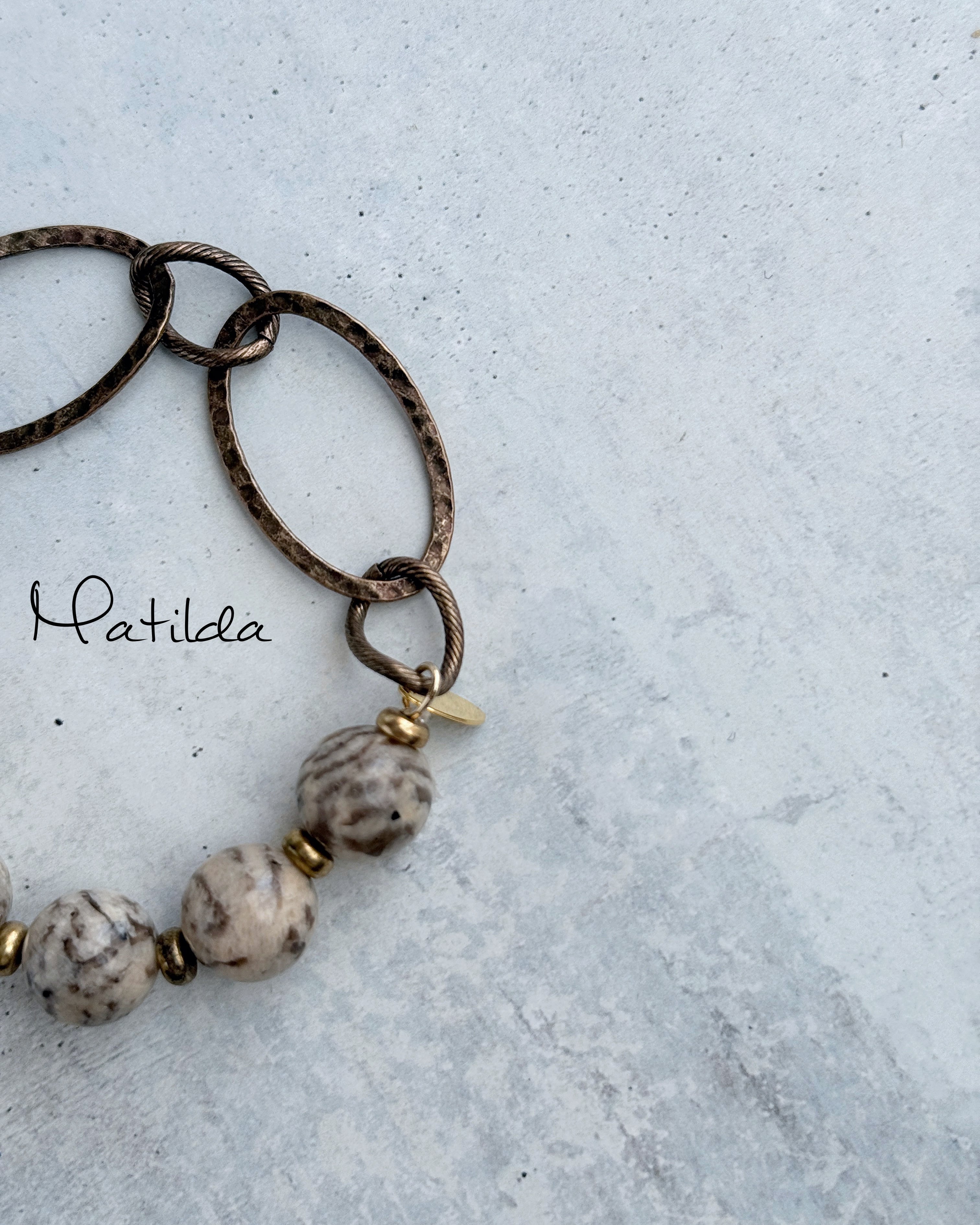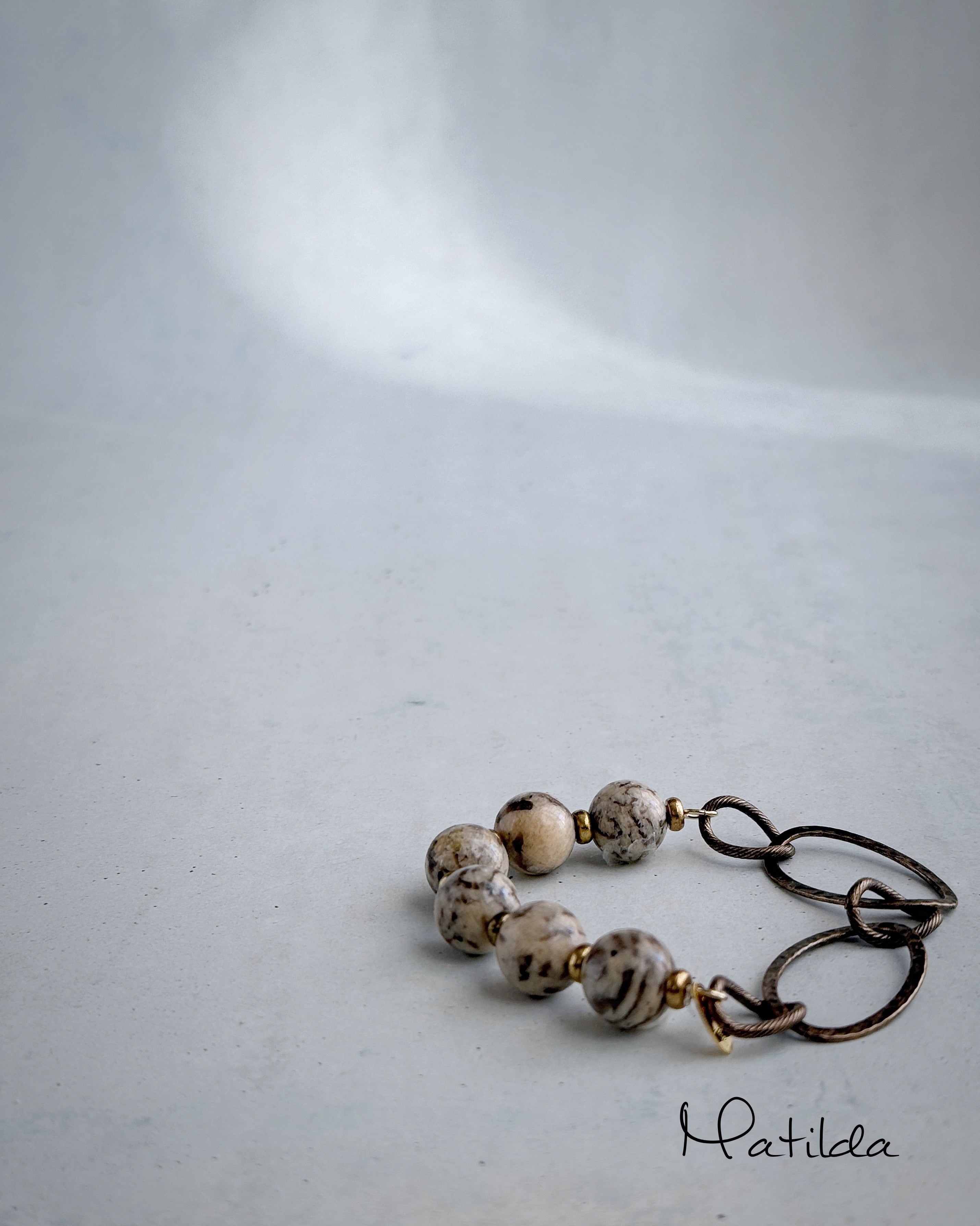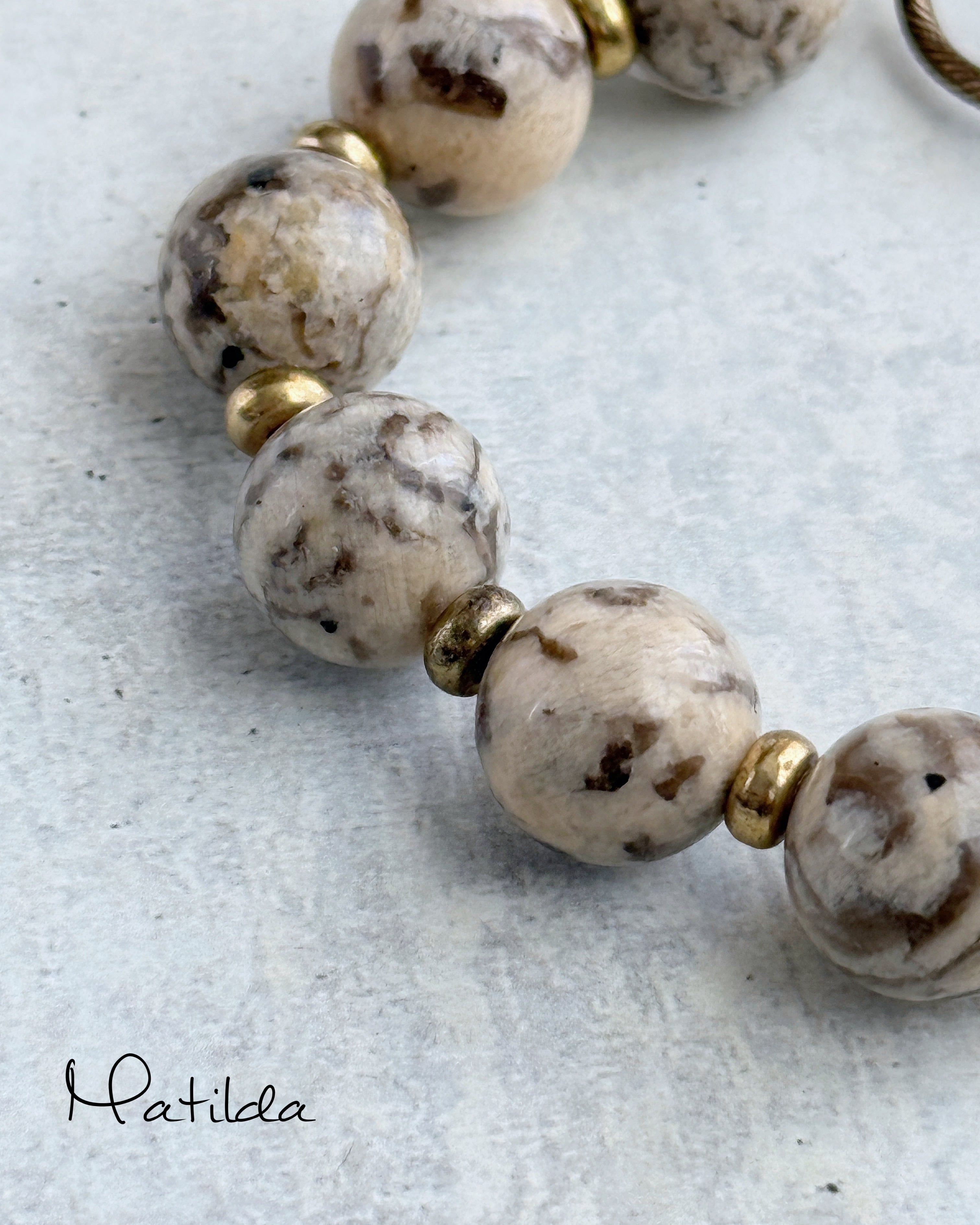 フェルスパーのアイボリーベージュにスモーキークォーツのクリアブラウンがアートな模様を描くグラフィックグラナイトに、ゴールドカラーの真鍮ビーズを合わせ、シックなブロンズカラーのメタルチェーンが抜け感を添える。