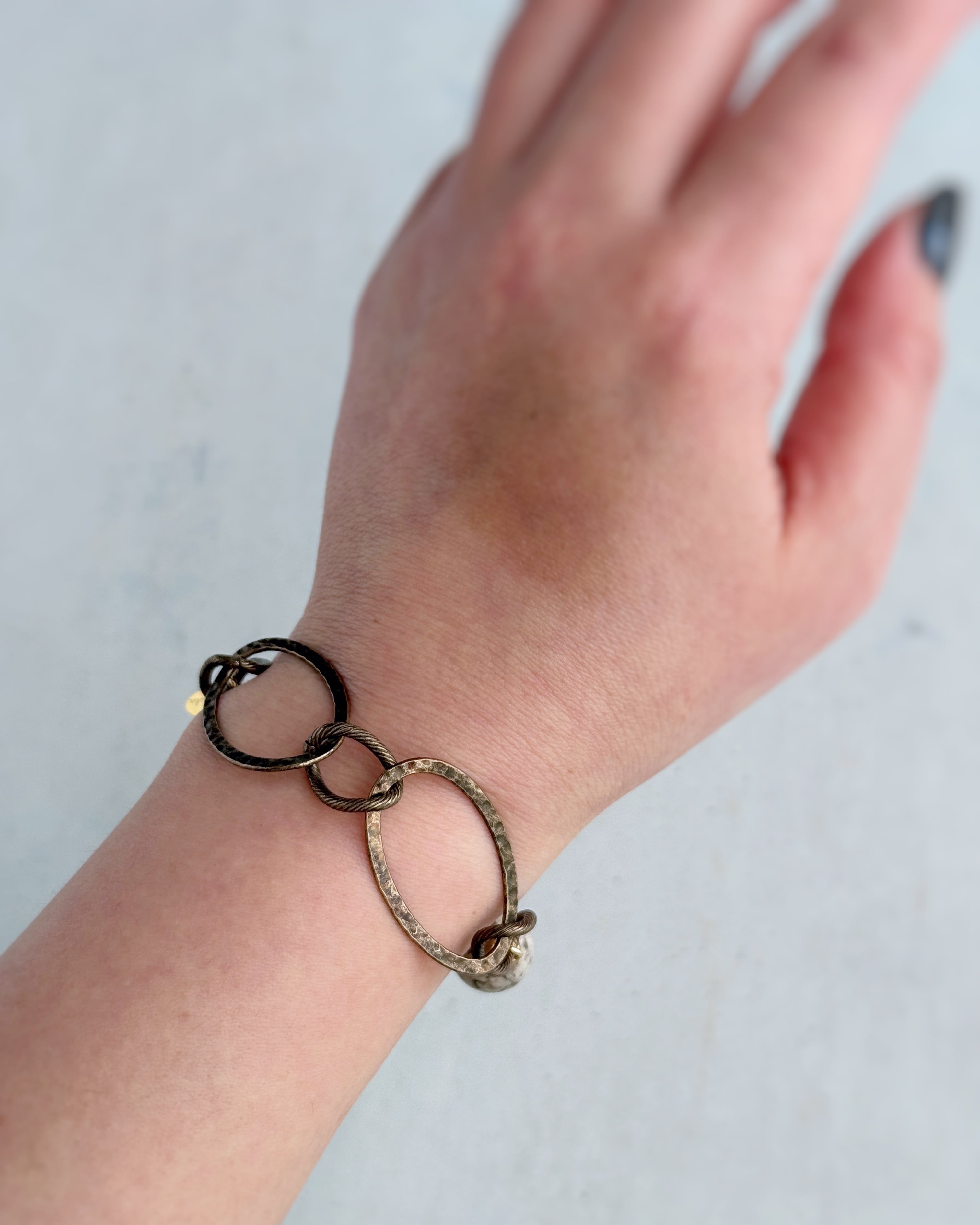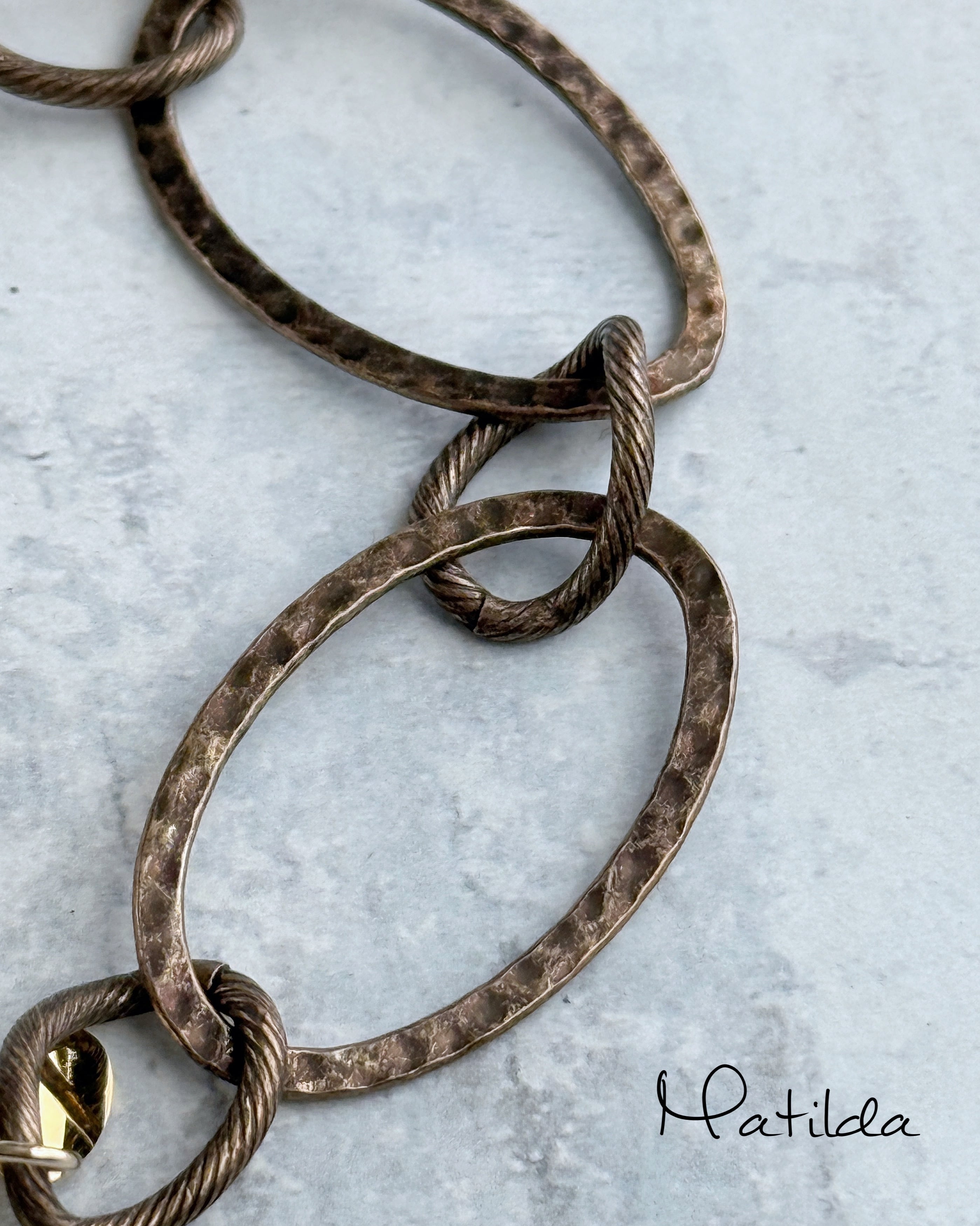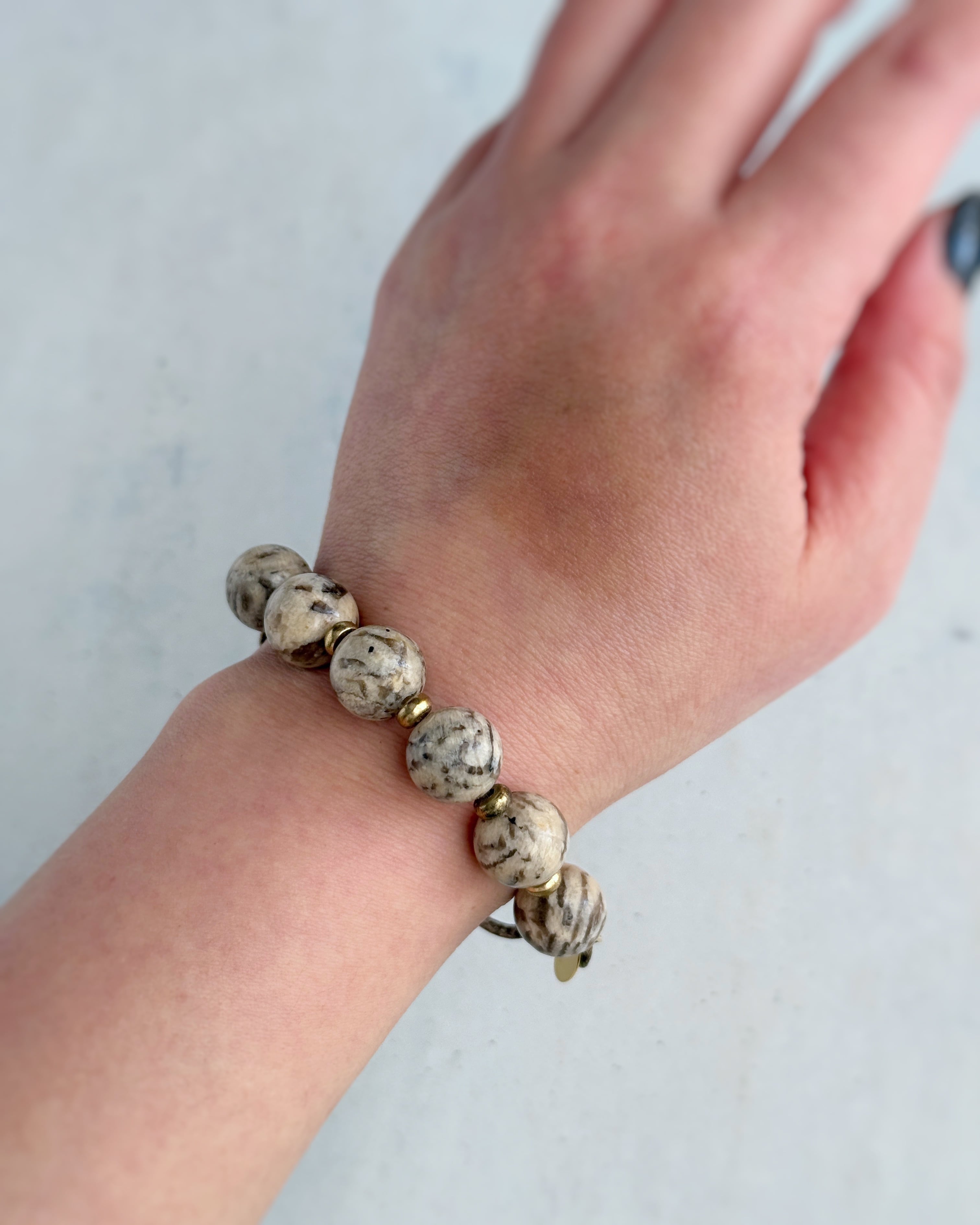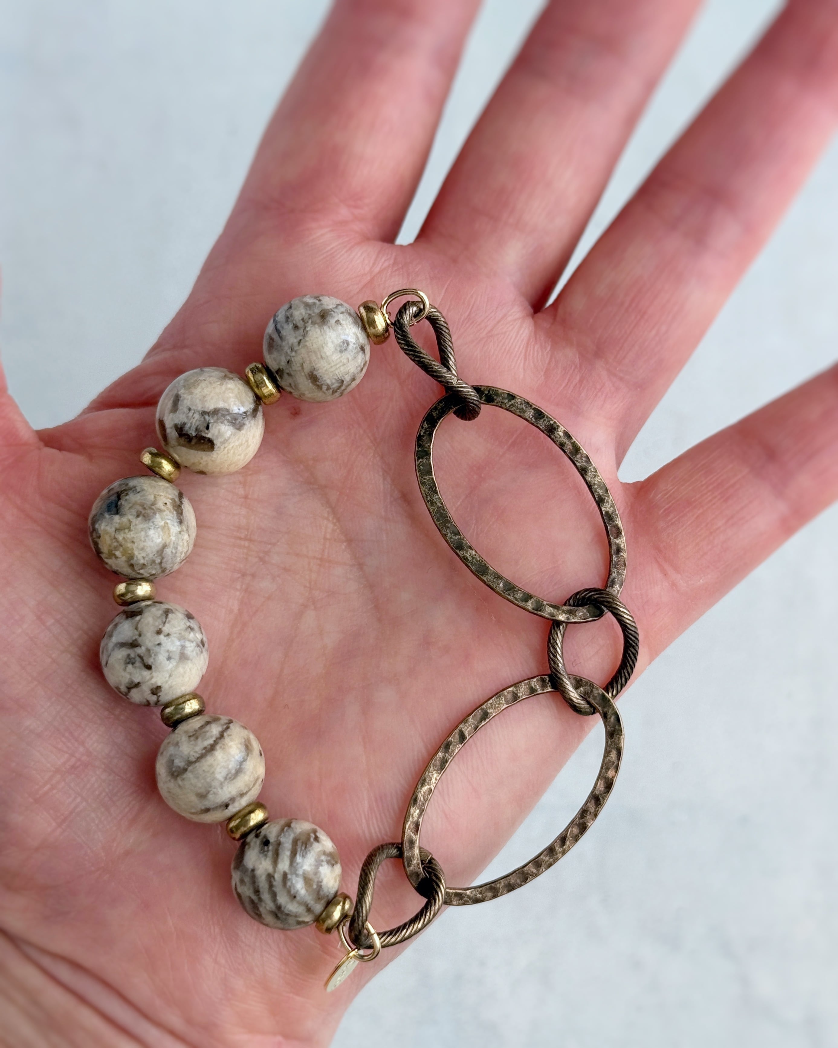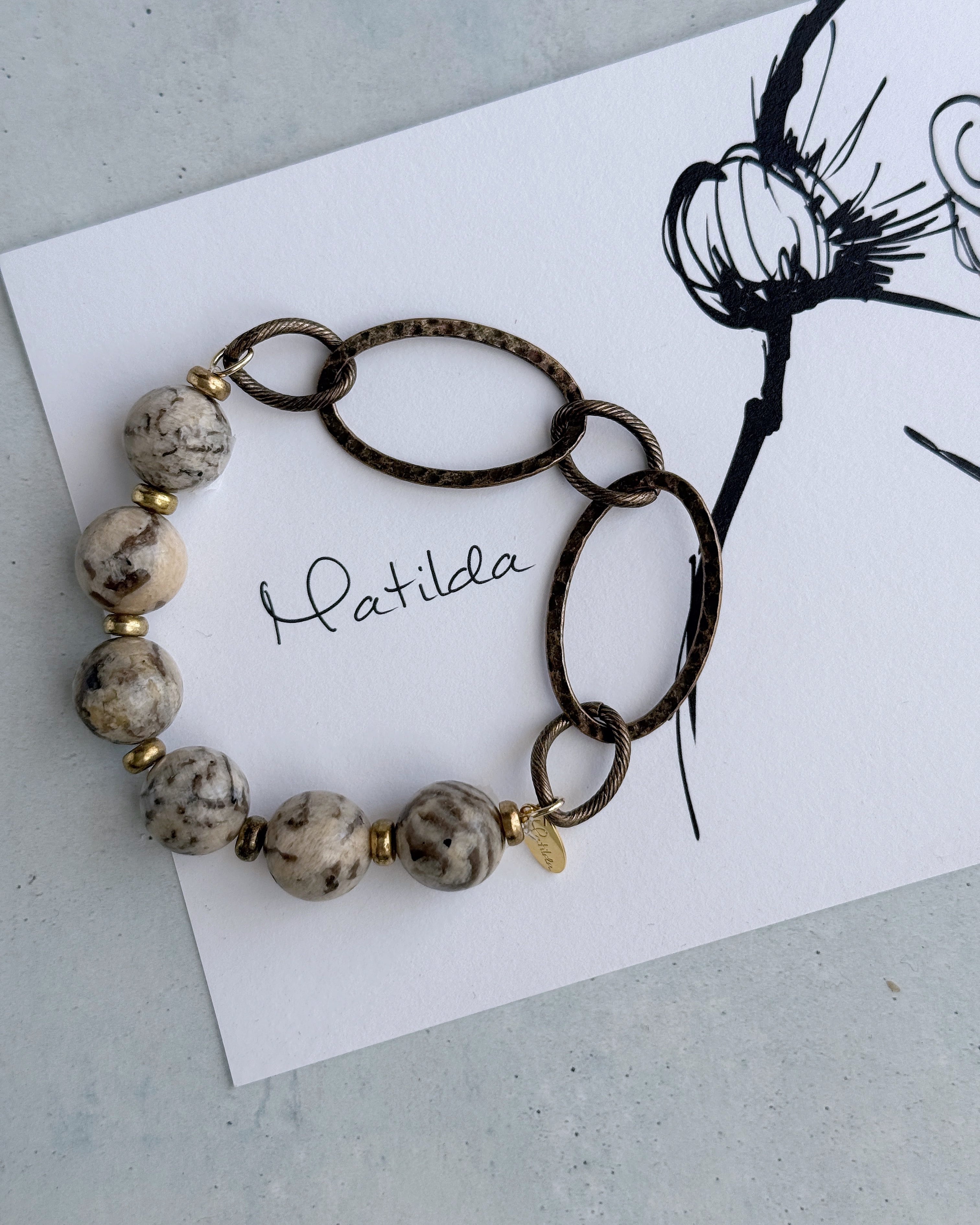 フェルスパーのアイボリーベージュにスモーキークォーツのクリアブラウンがアートな模様を描くグラフィックグラナイトに、ゴールドカラーの真鍮ビーズを合わせ、シックなブロンズカラーのメタルチェーンが抜け感を添える。