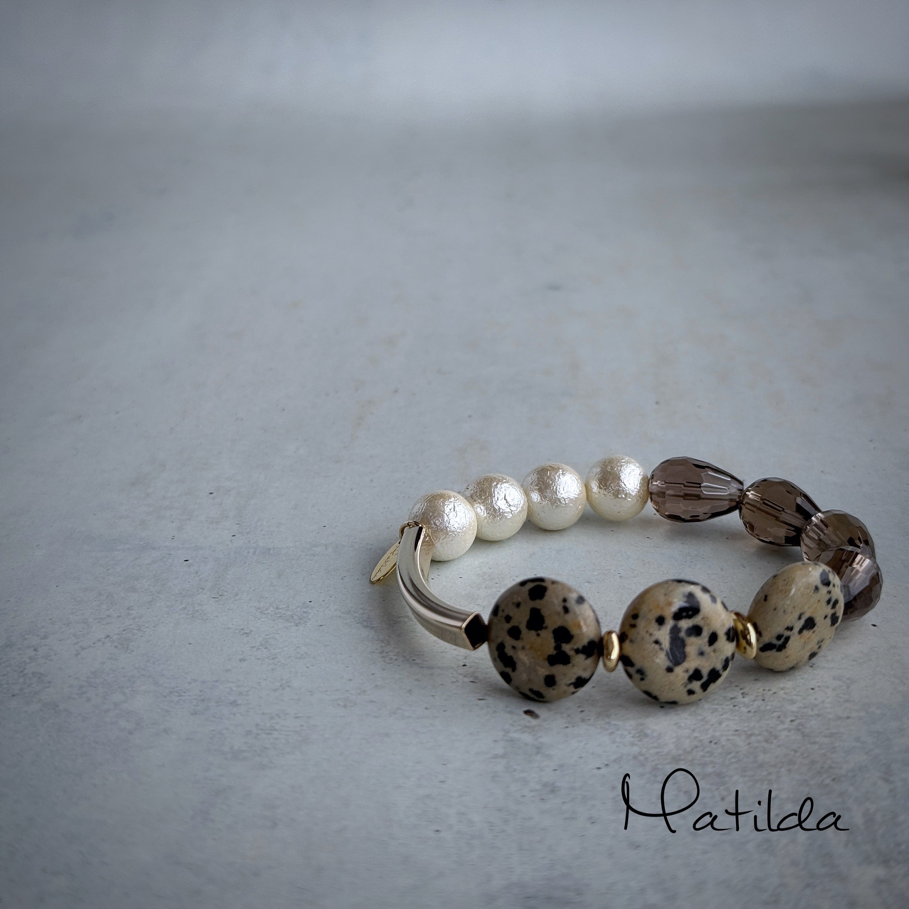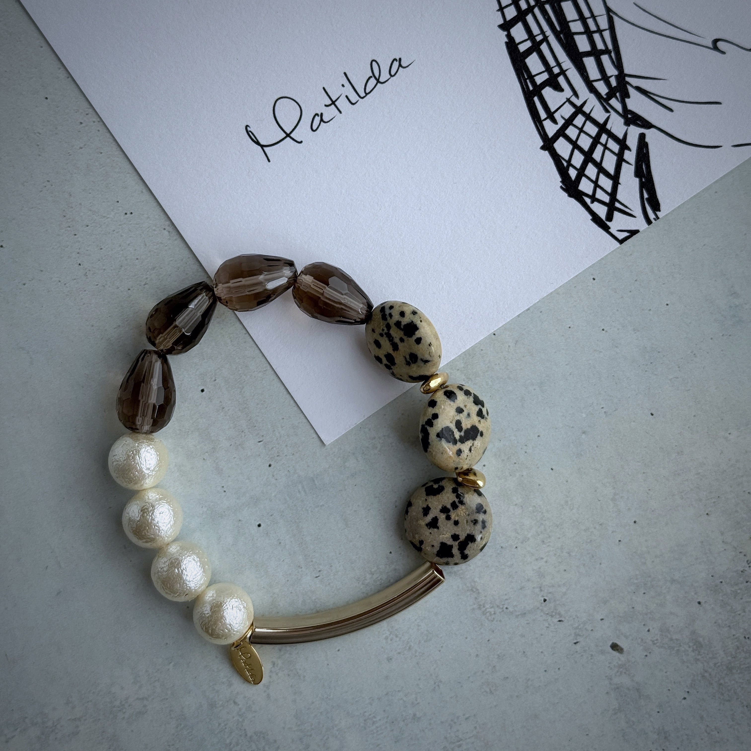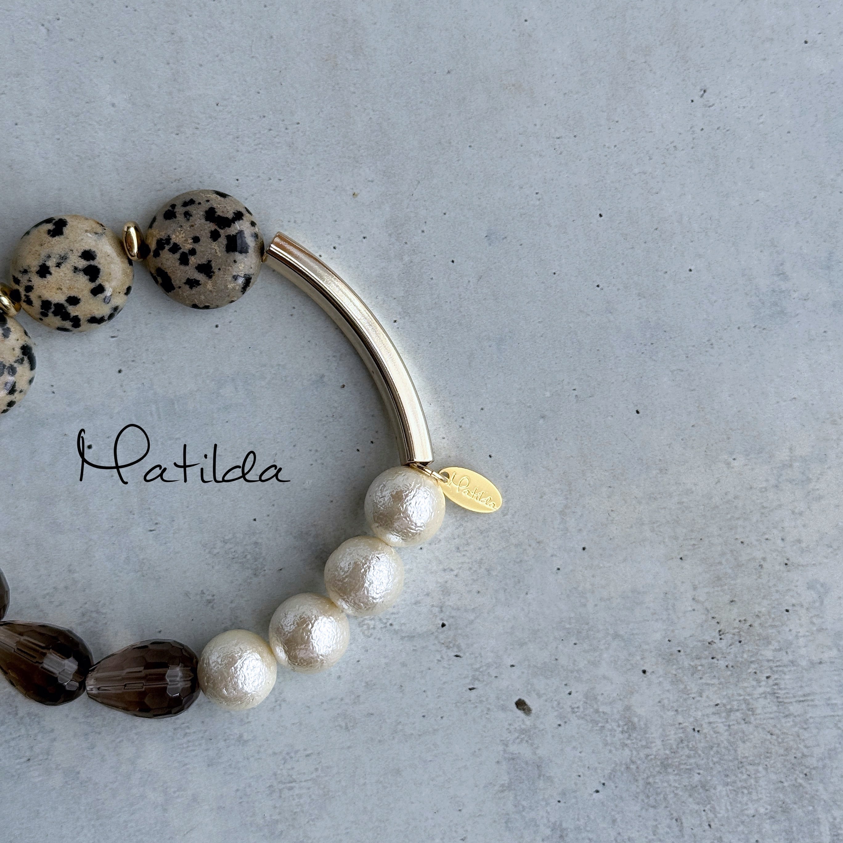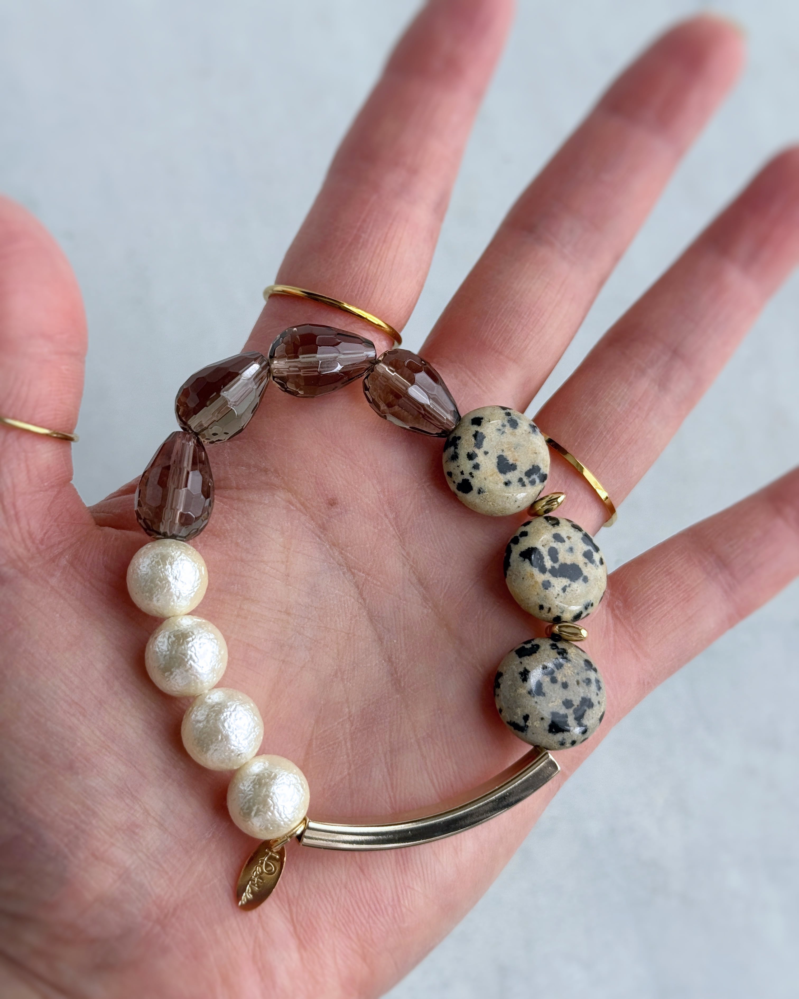 ダルメシアンジャスパーのコイン、ドロップシェイプのスモーキークォーツ、クラシカルな貝パールという異なるマテリアルを、ゴールドカラーのメタルチューブでモダンにまとめ上げて。
