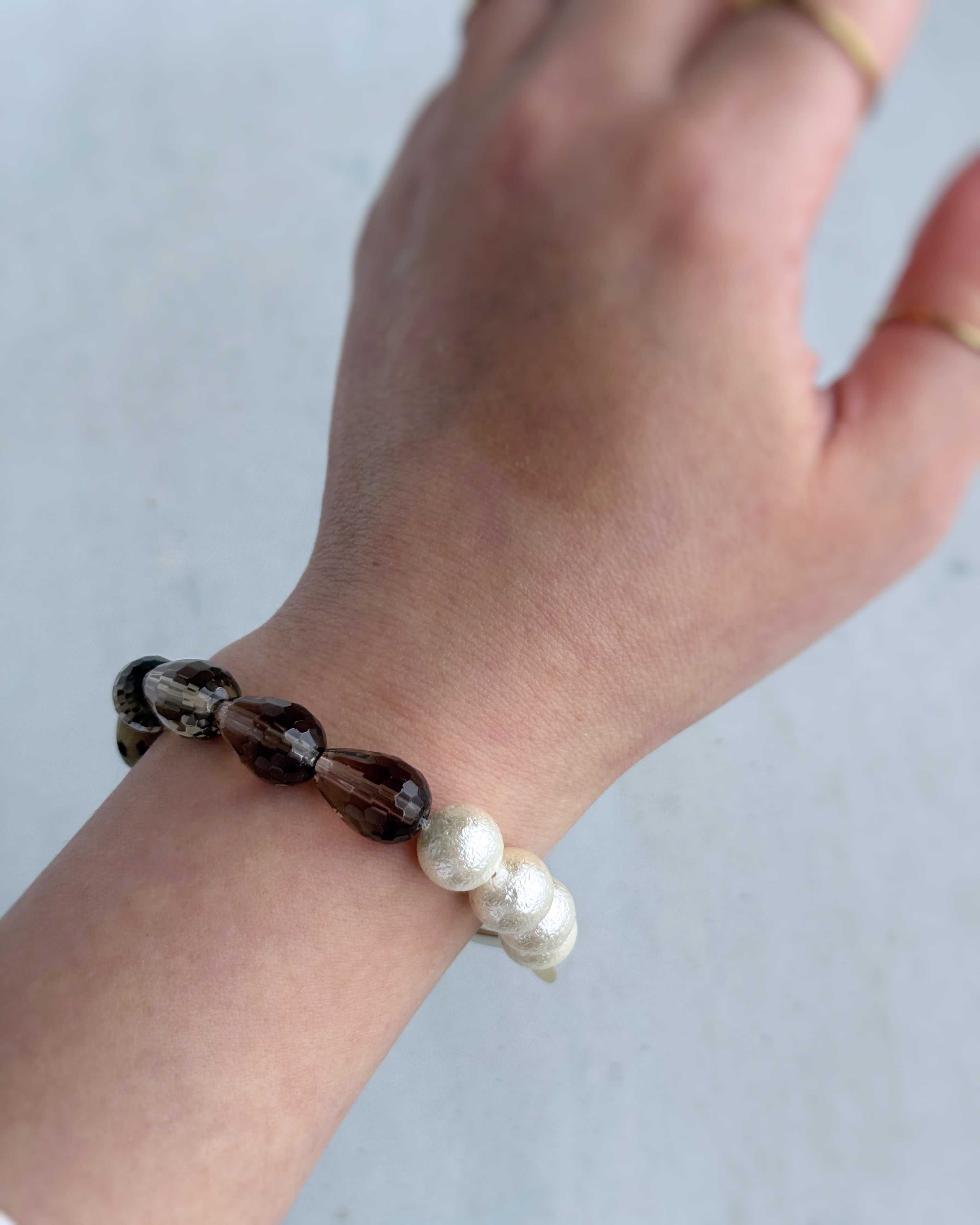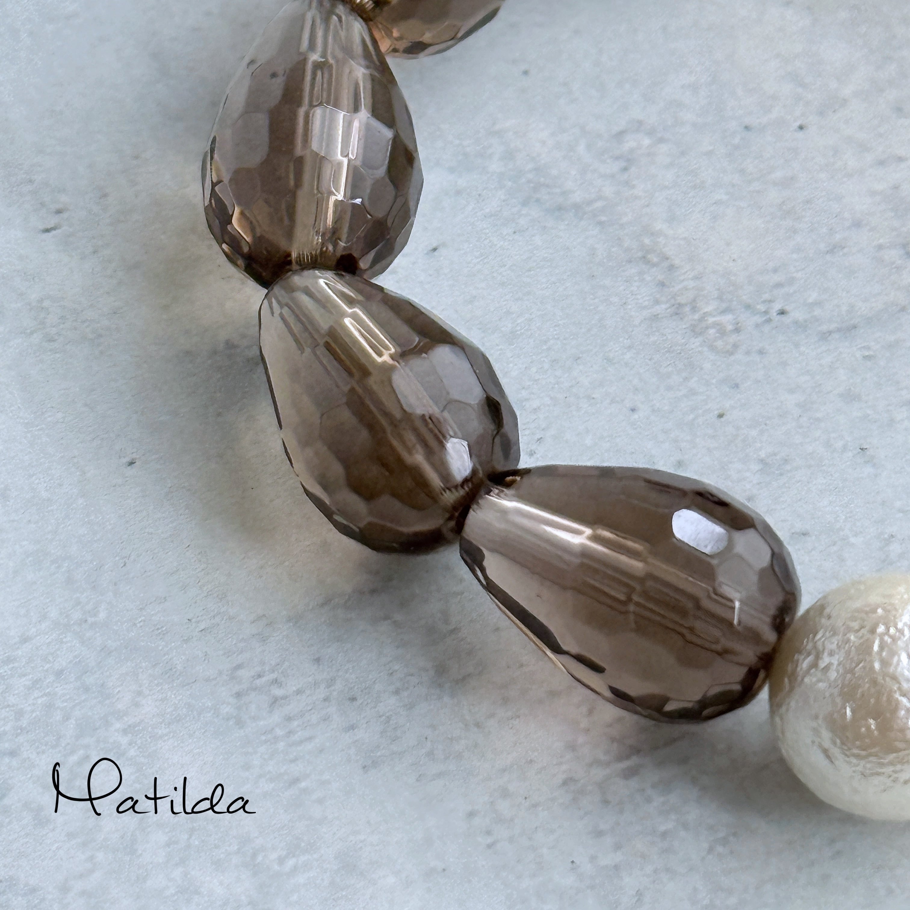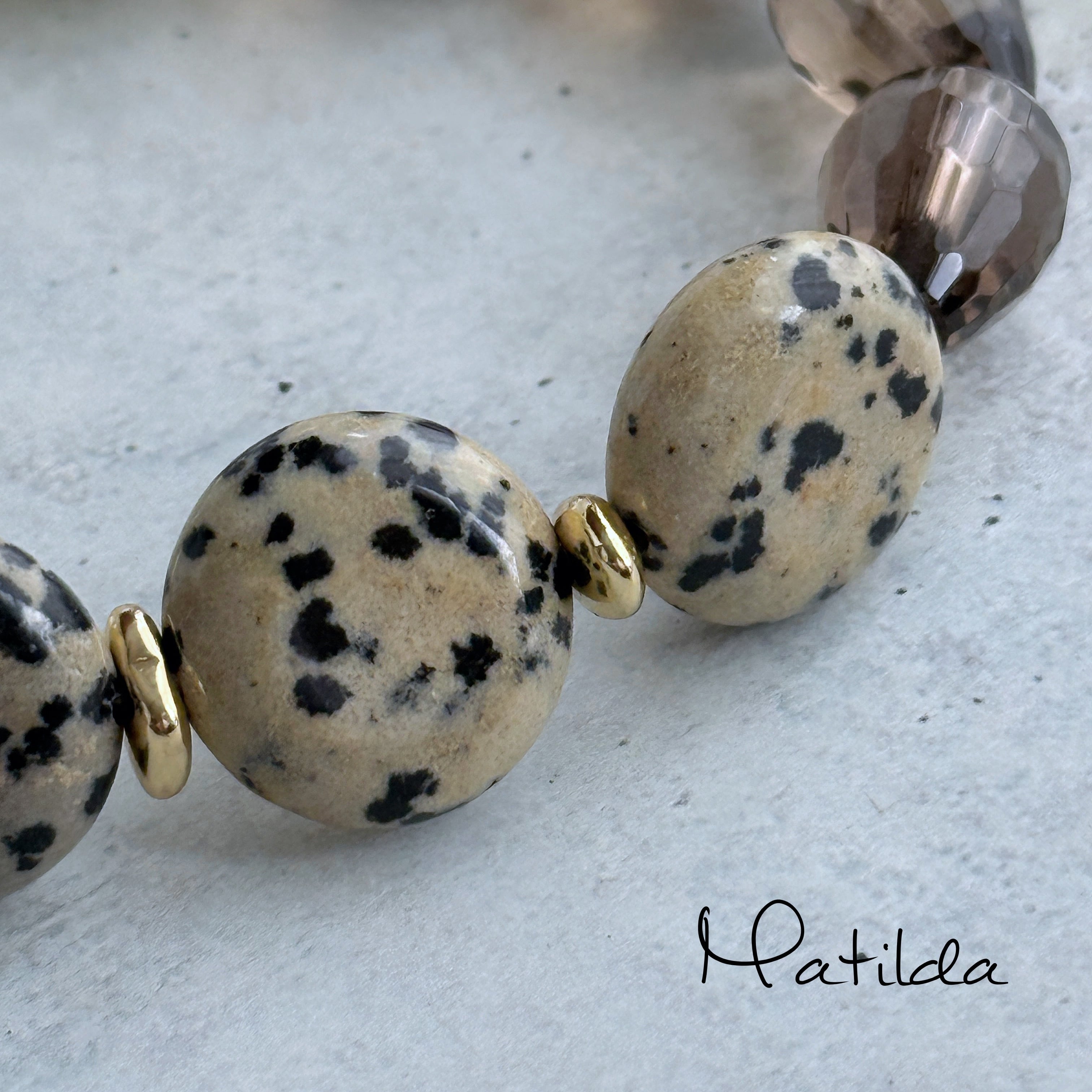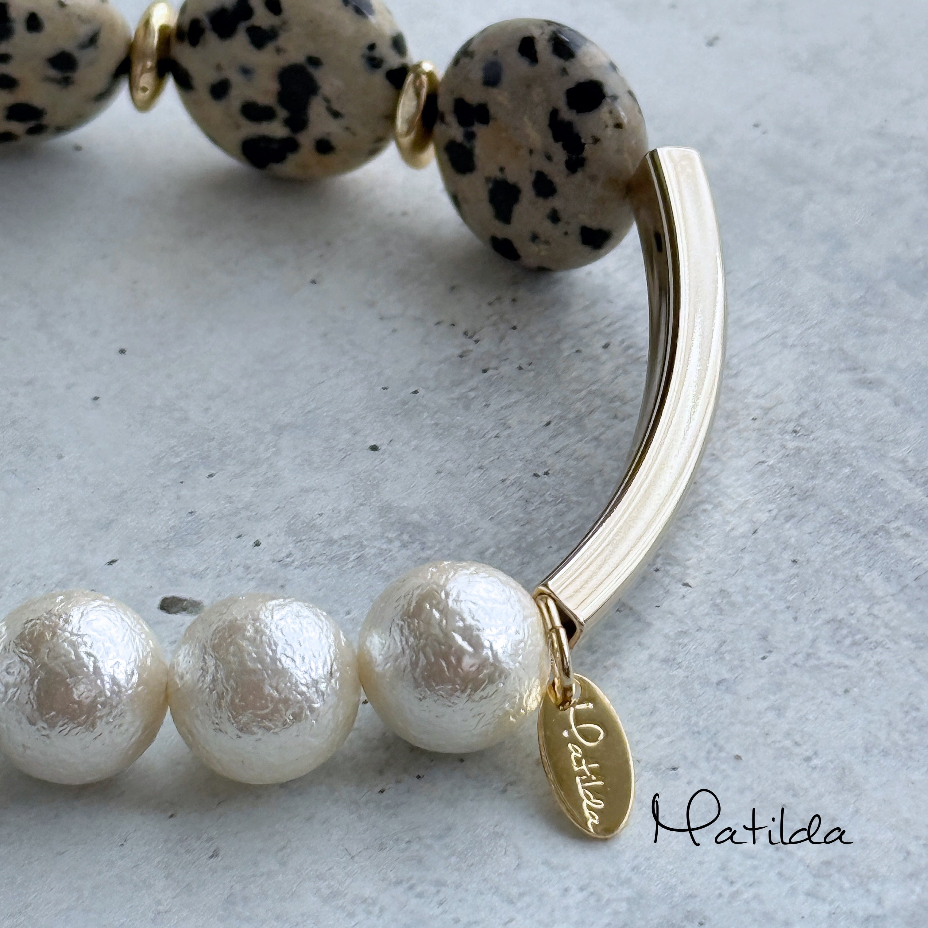ダルメシアンジャスパーのコイン、ドロップシェイプのスモーキークォーツ、クラシカルな貝パールという異なるマテリアルを、ゴールドカラーのメタルチューブでモダンにまとめ上げて。
