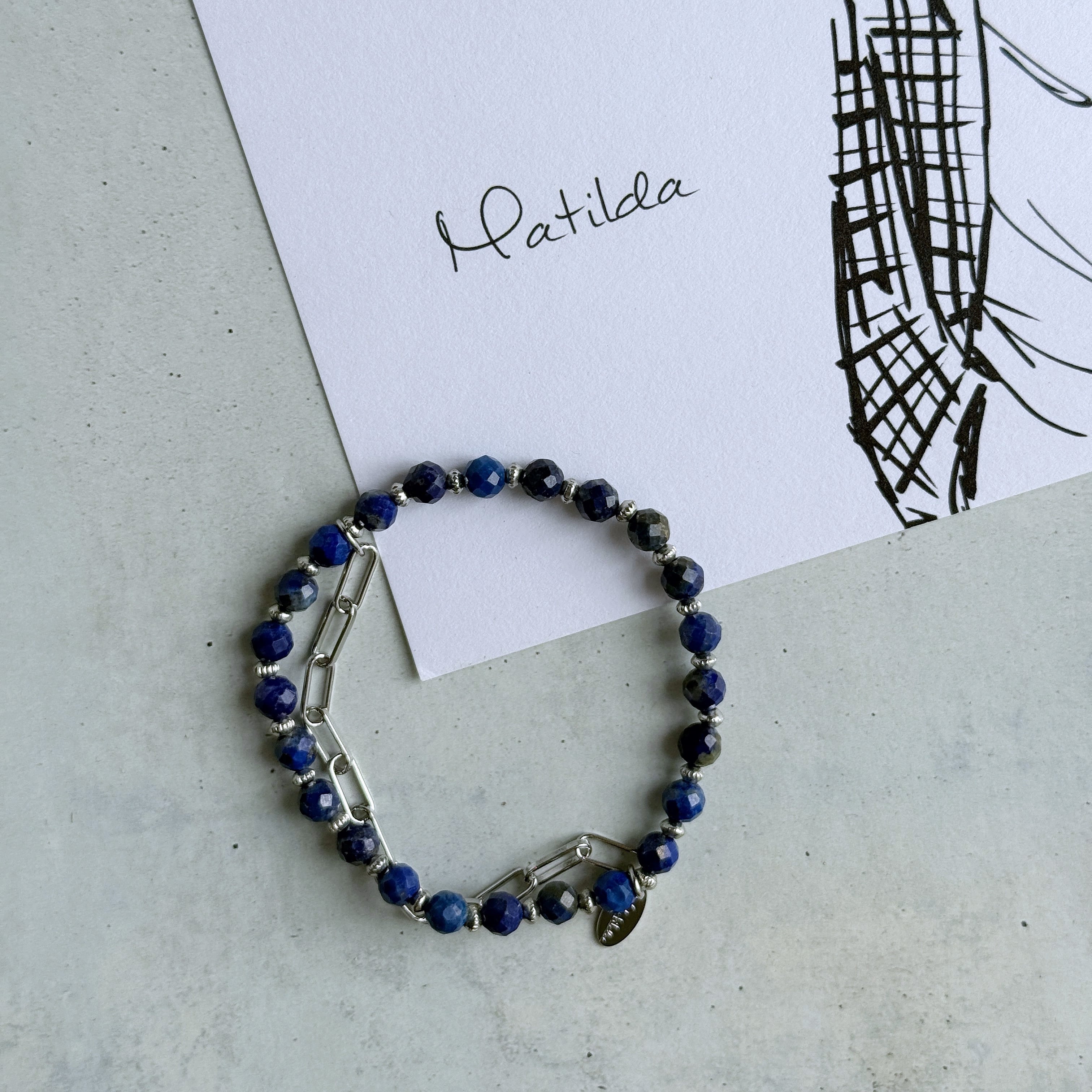 鮮やかに艶めくウルトラマリンブルーに、硬質なカッティングを施したラピスラズリを、シルバーカラーのメタルチェーンと合わせて。