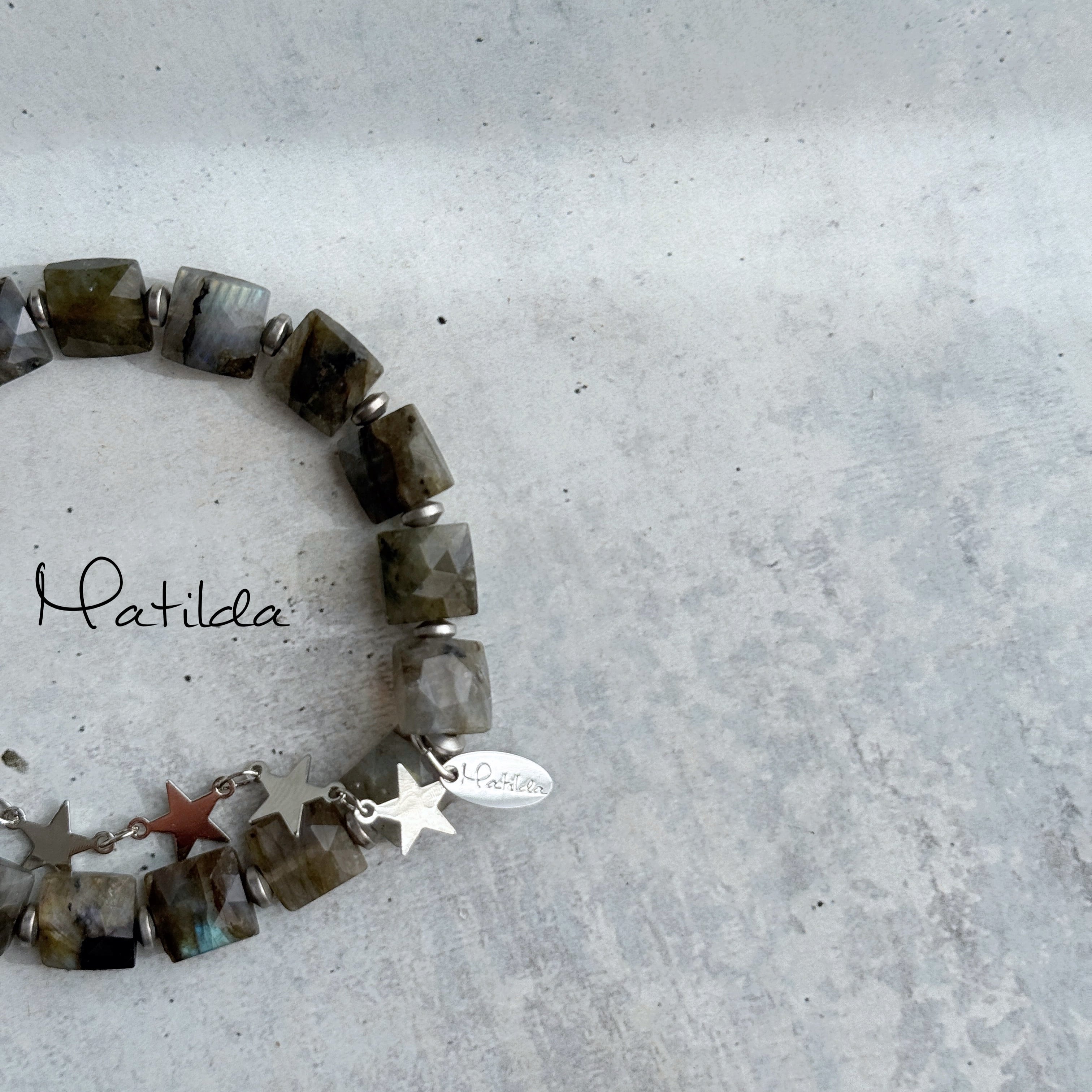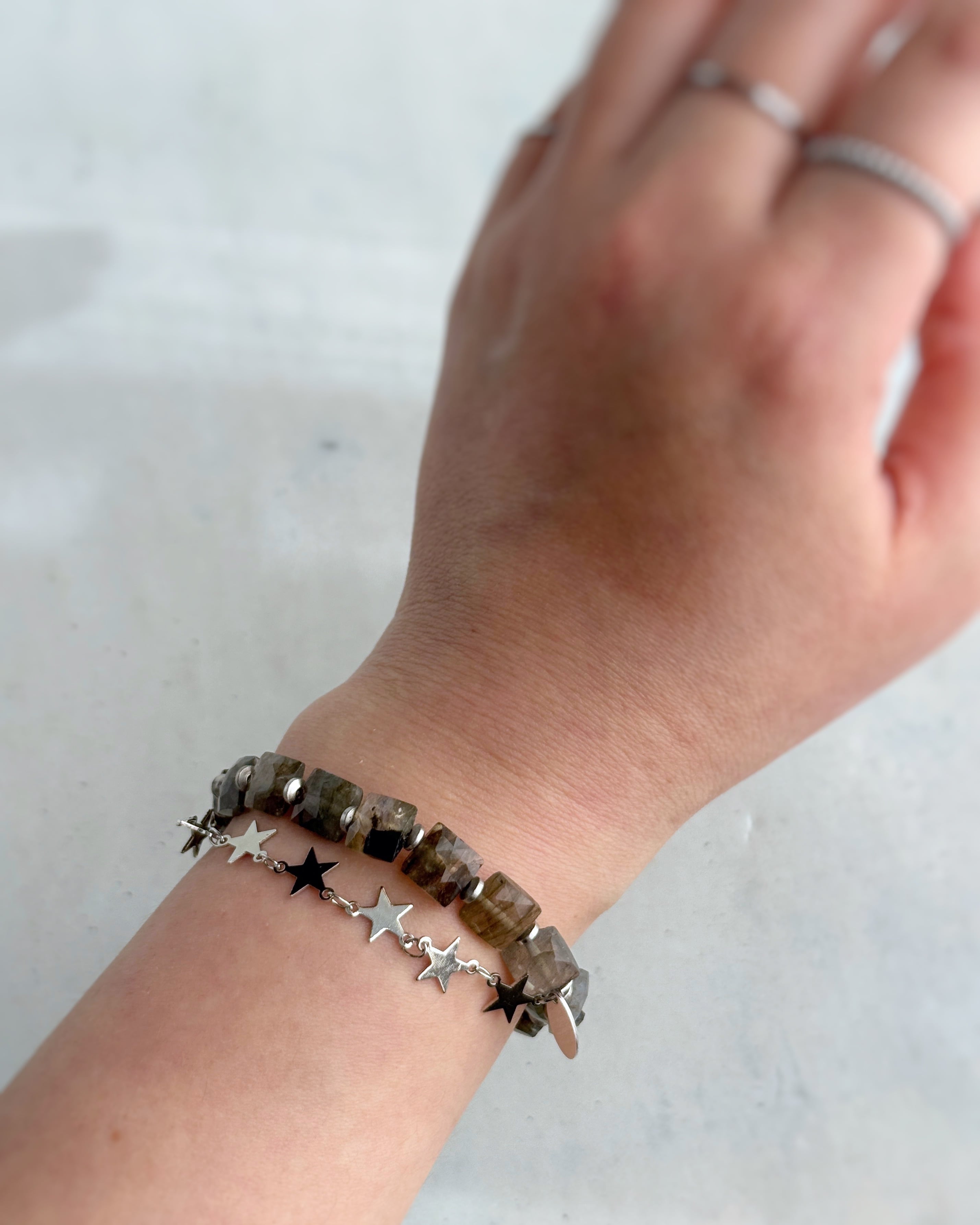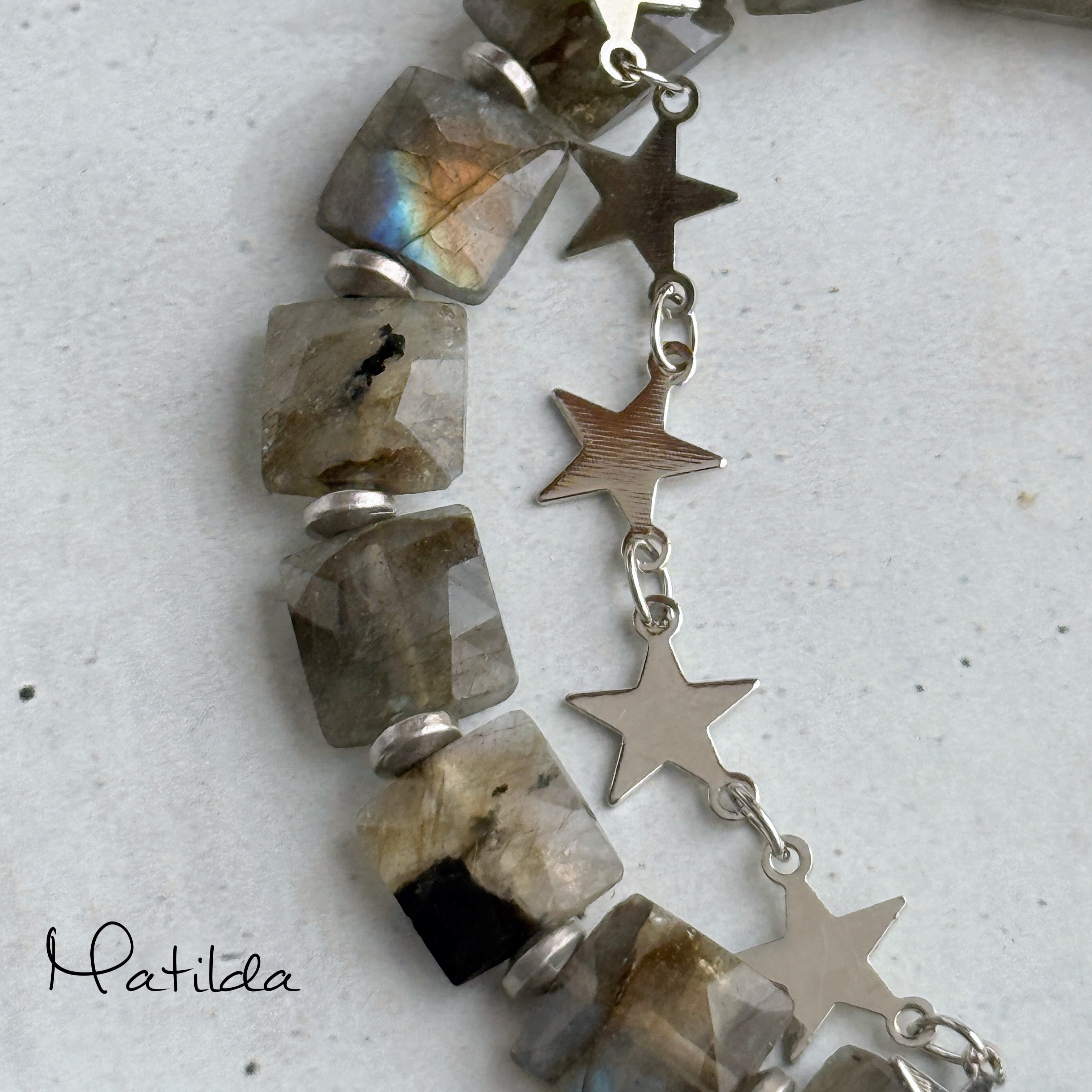 繊細なカッティングと、揺らぐシラーがアンニュイなラブラドライトに、スターがきらめくメタルチェーンを合わせて。