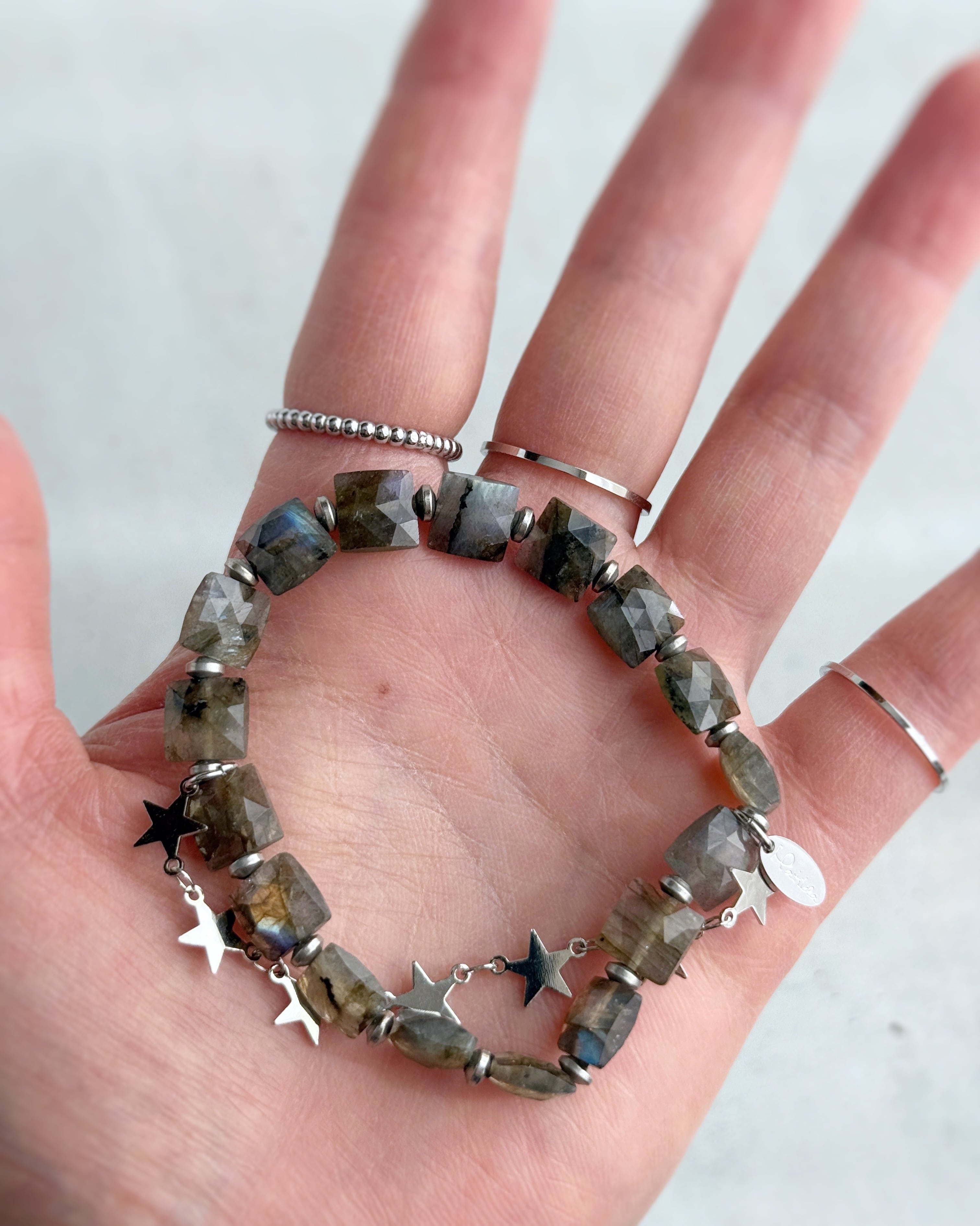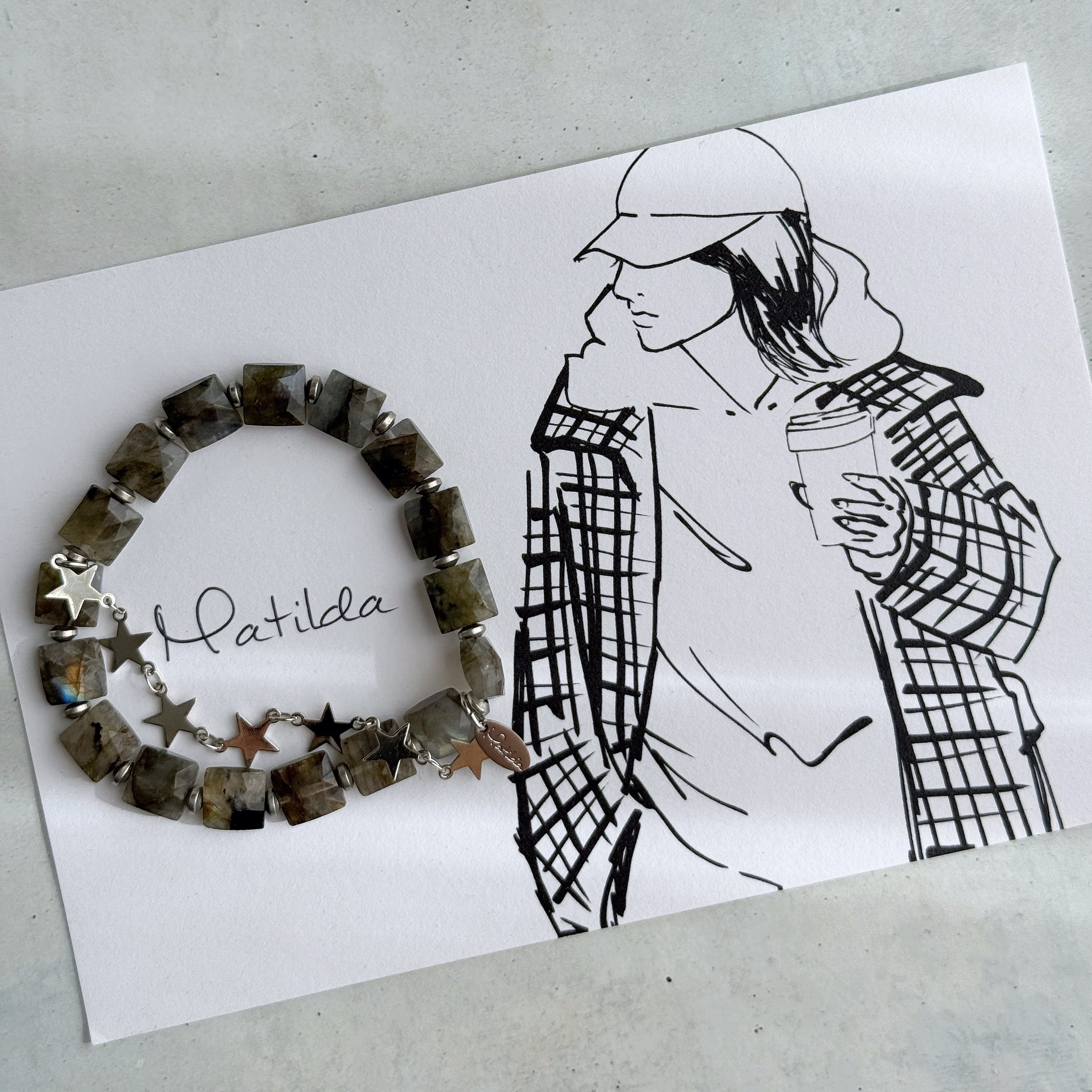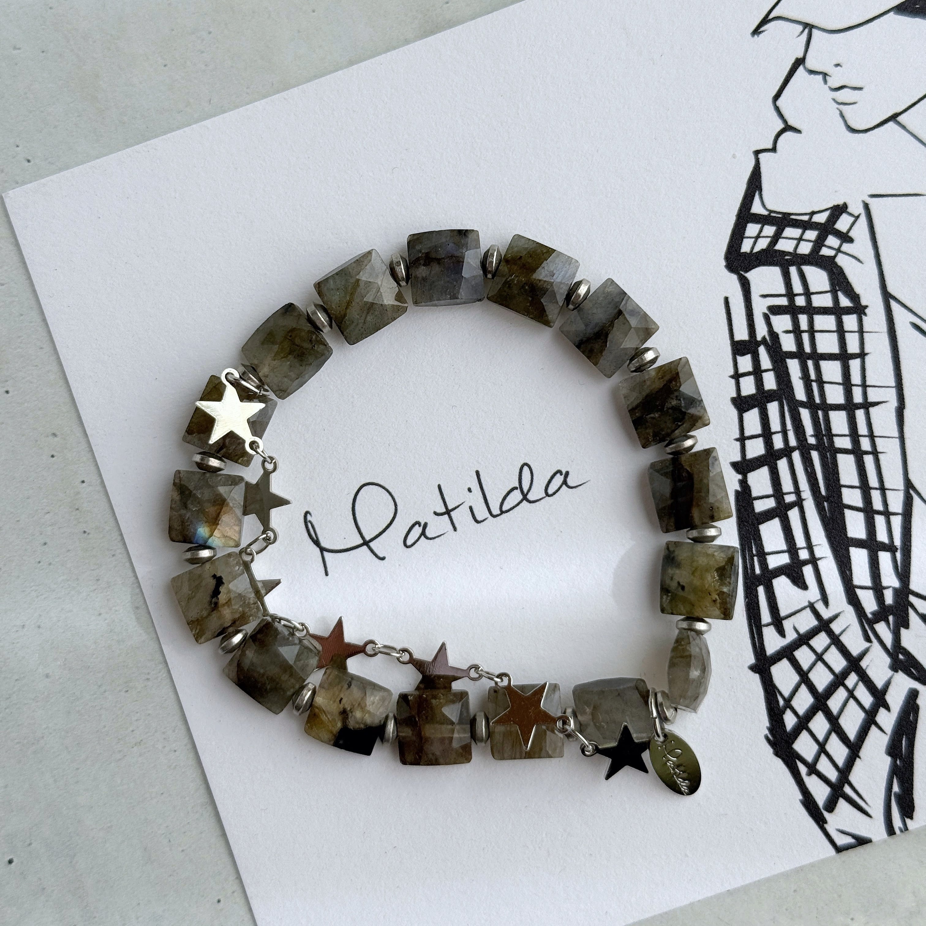 繊細なカッティングと、揺らぐシラーがアンニュイなラブラドライトに、スターがきらめくメタルチェーンを合わせて。