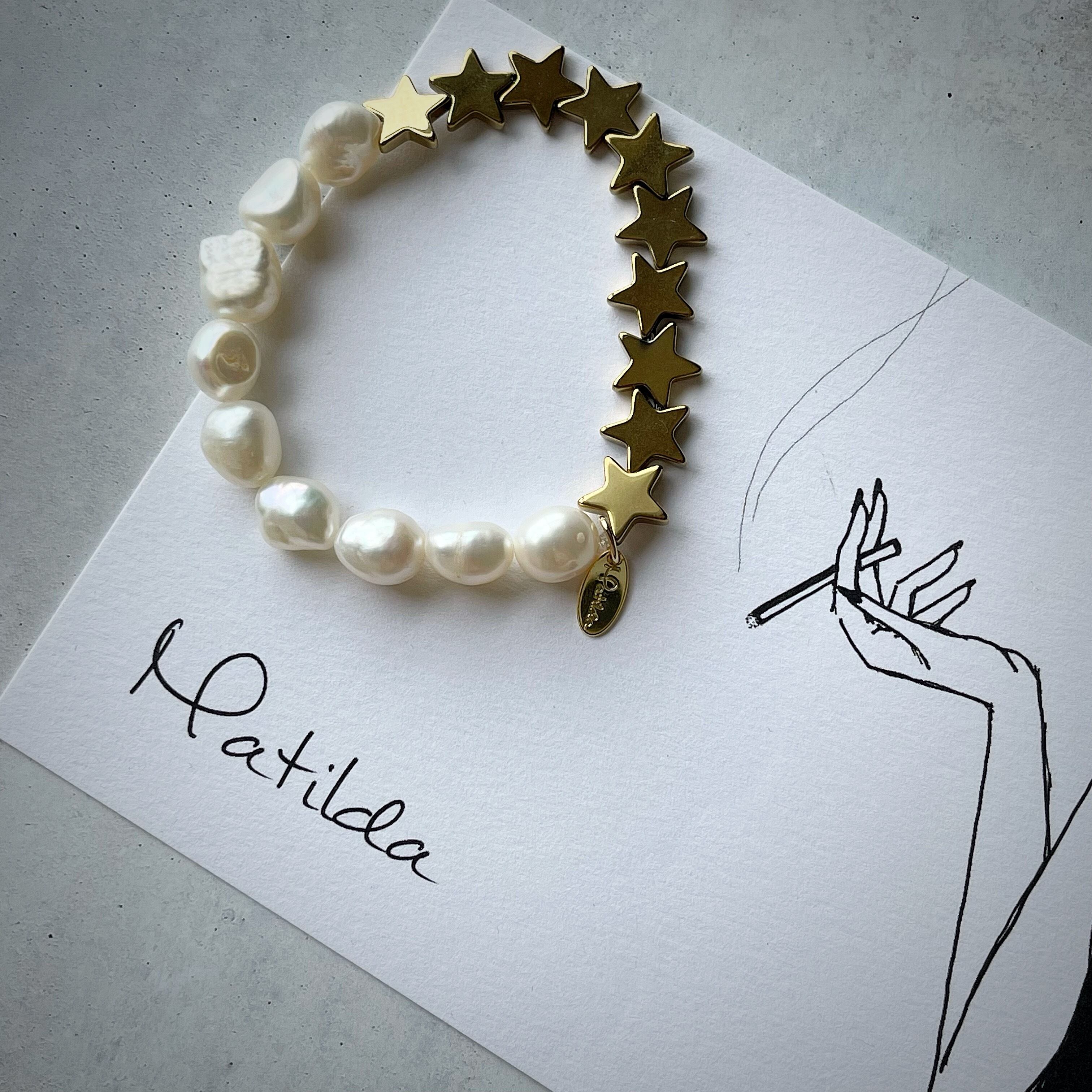 歪な形が見る角度で様々な表情を見せてくれる、淡水パールと、メタリックなスターのブレスレット。