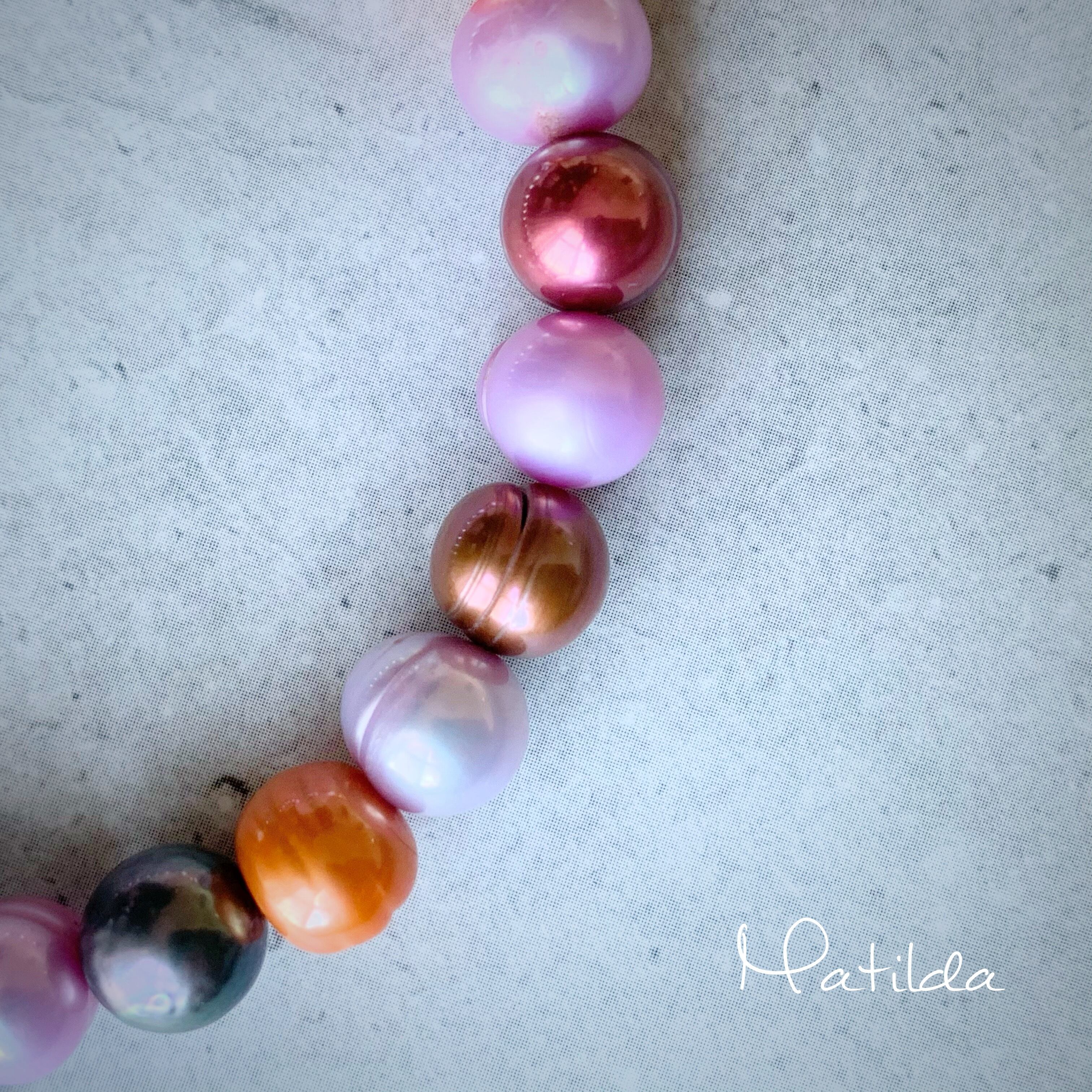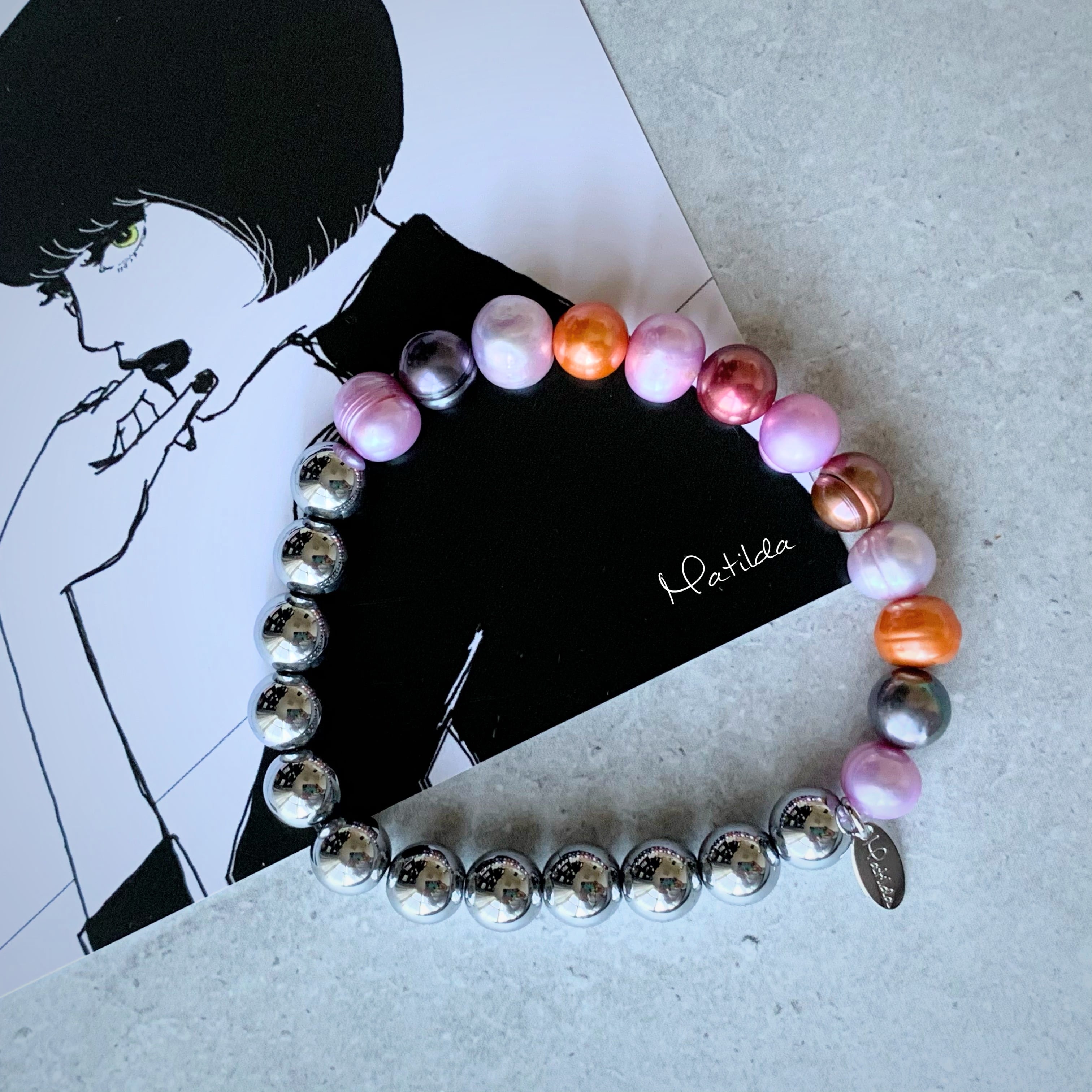 ピンクベースのパールにシルバーをプラスすることで、甘すぎない印象のブレスレットに。