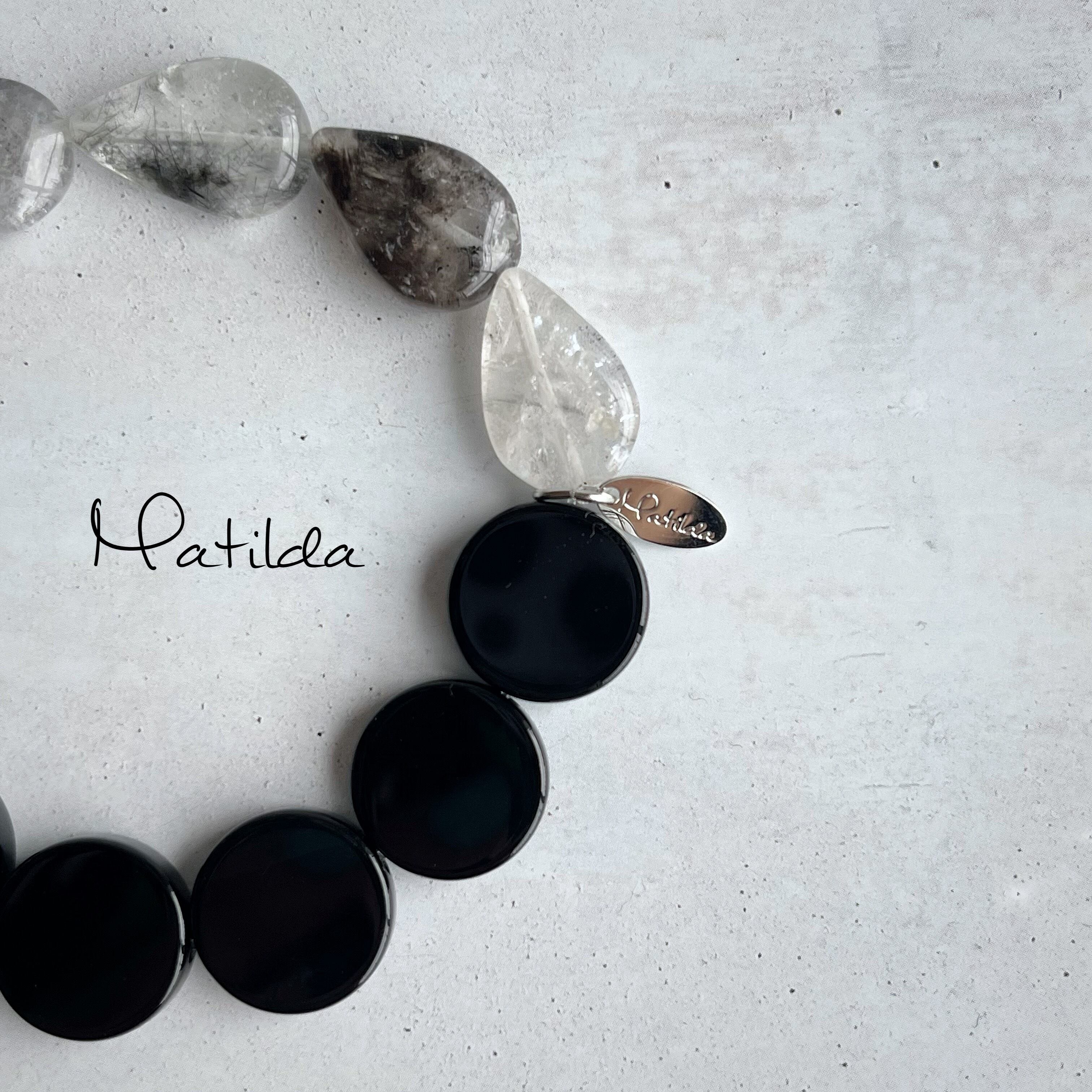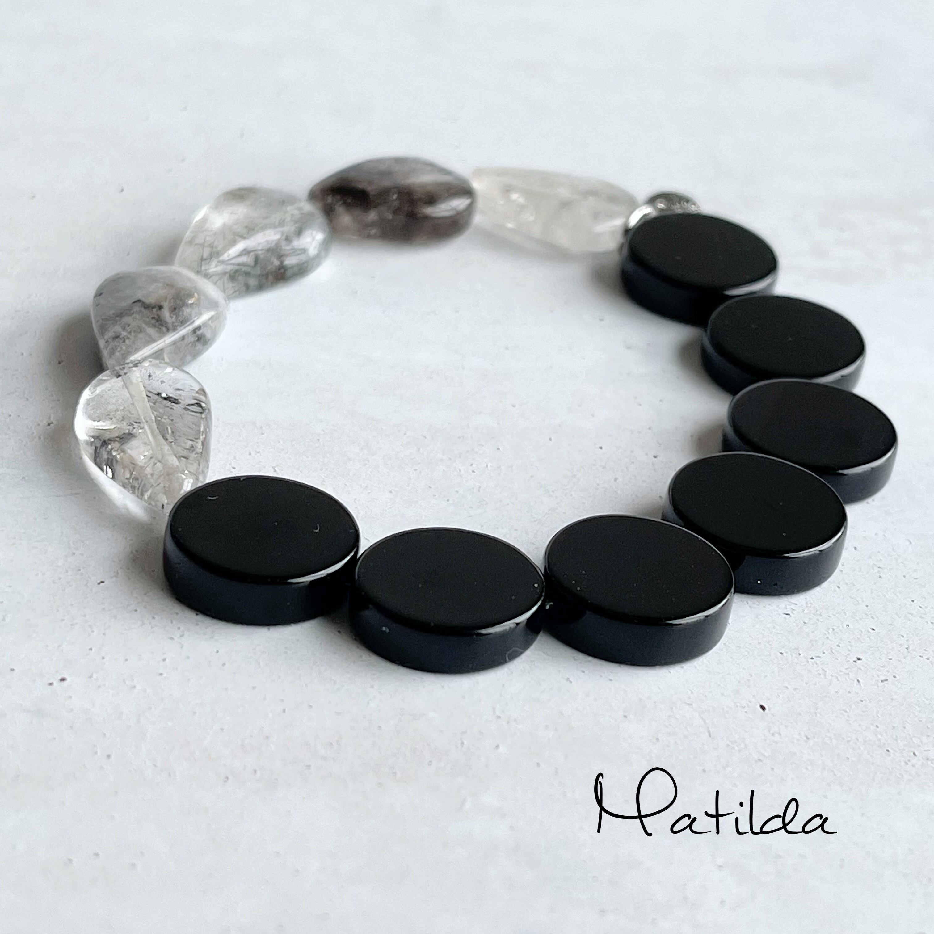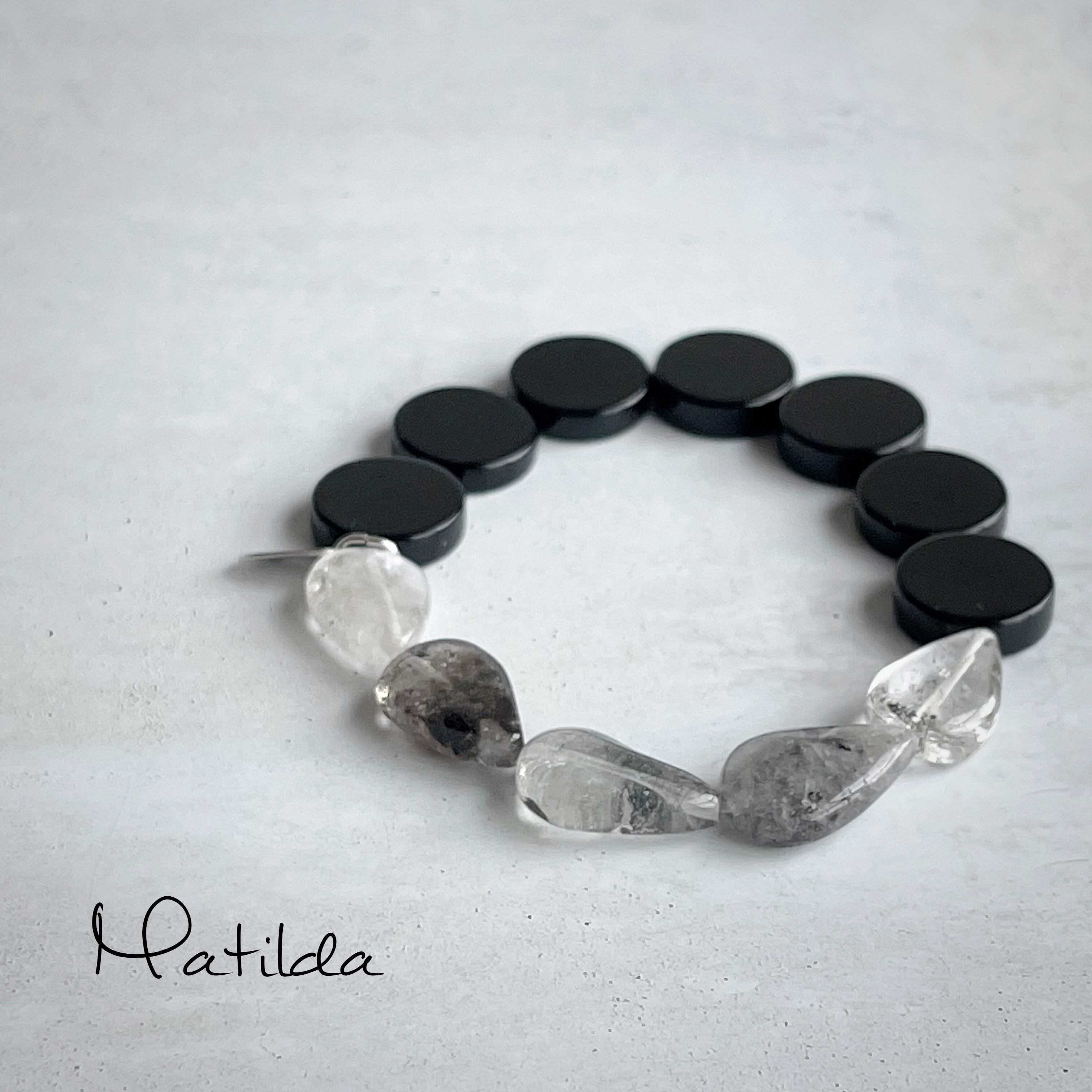 コイン状のオニキスと、水晶の中にグラファイトを内包した石、グラファイトインクォーツのブレスレット。