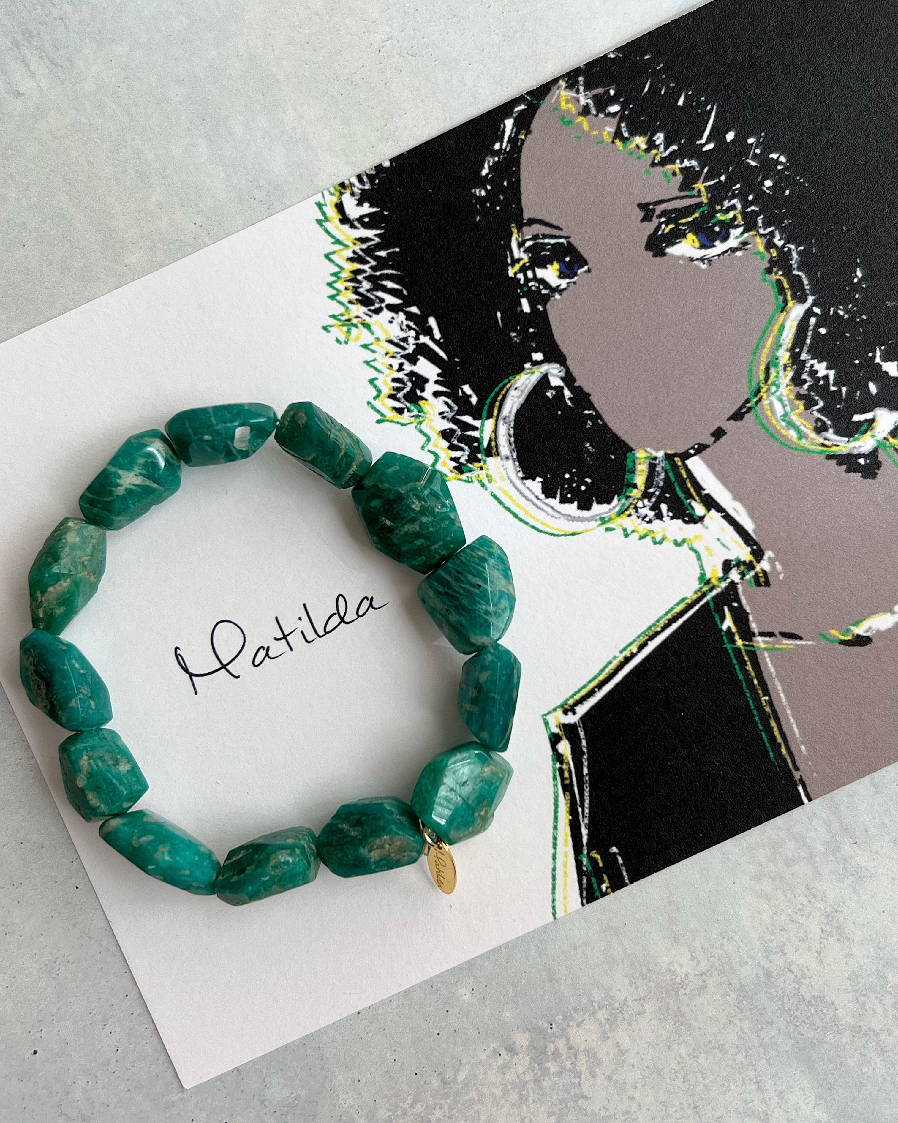 鮮やかなエメラルドグリーンとホワイトのマーブル模様が華やかなロシアンアマゾナイトのラフロックを連ねた一本。凛とした存在感と目を惹くカラーが潔いブレスレット。
