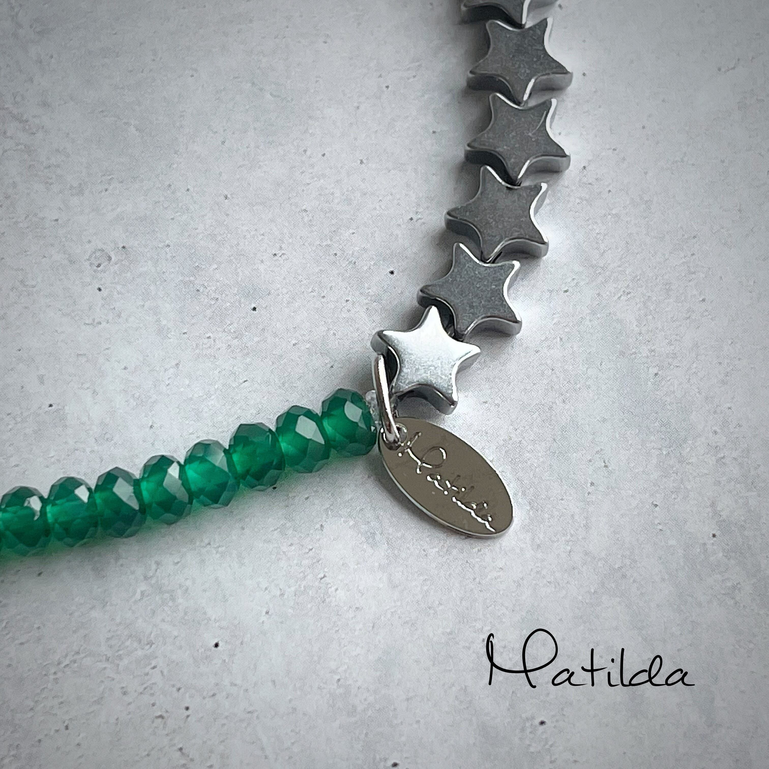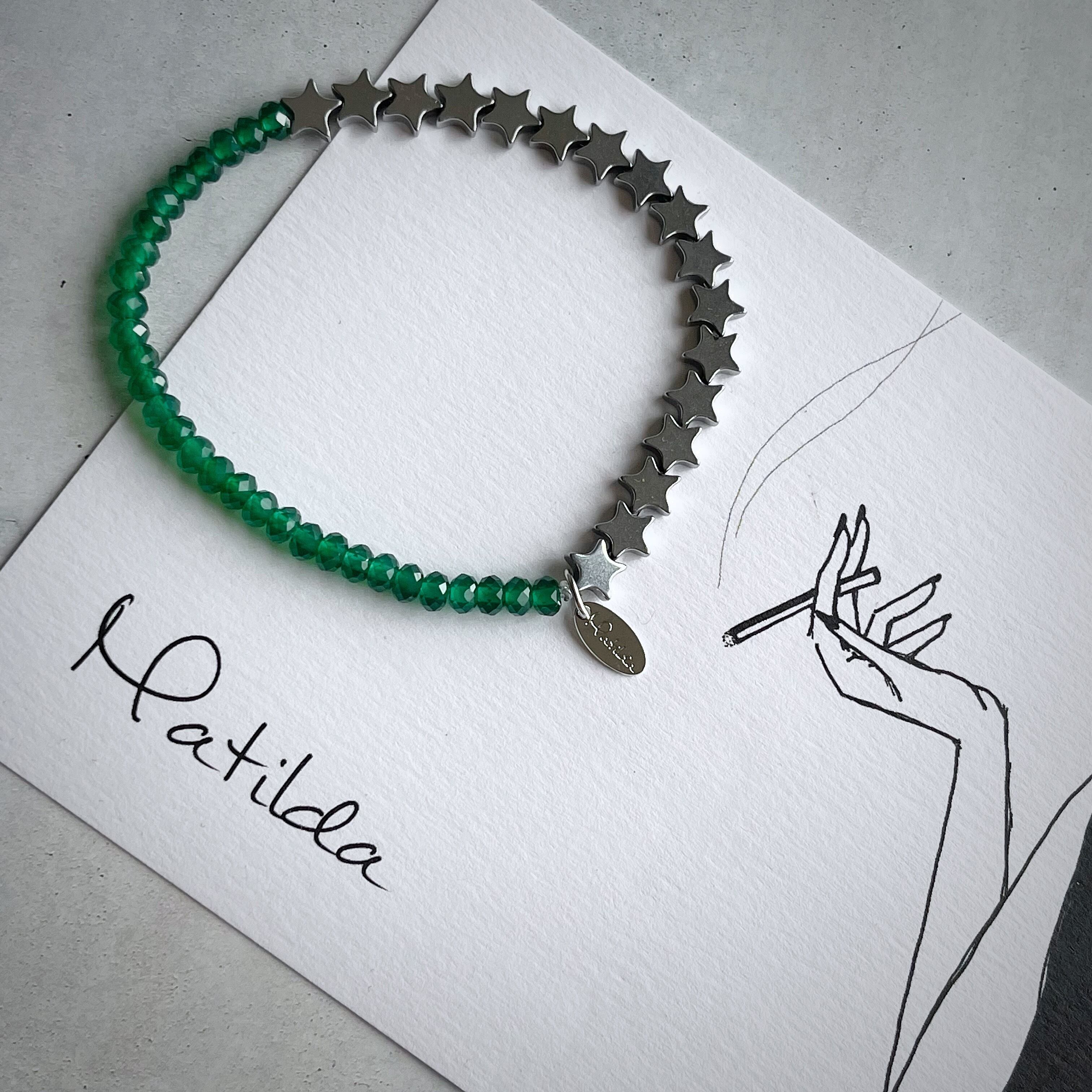 精緻なカッティングのきらめきとミニマムなサイズ感がキュートなグリーンオニキスのビーズとメタリックシルバーがクールなヘマタイトの星々を繋いで。
