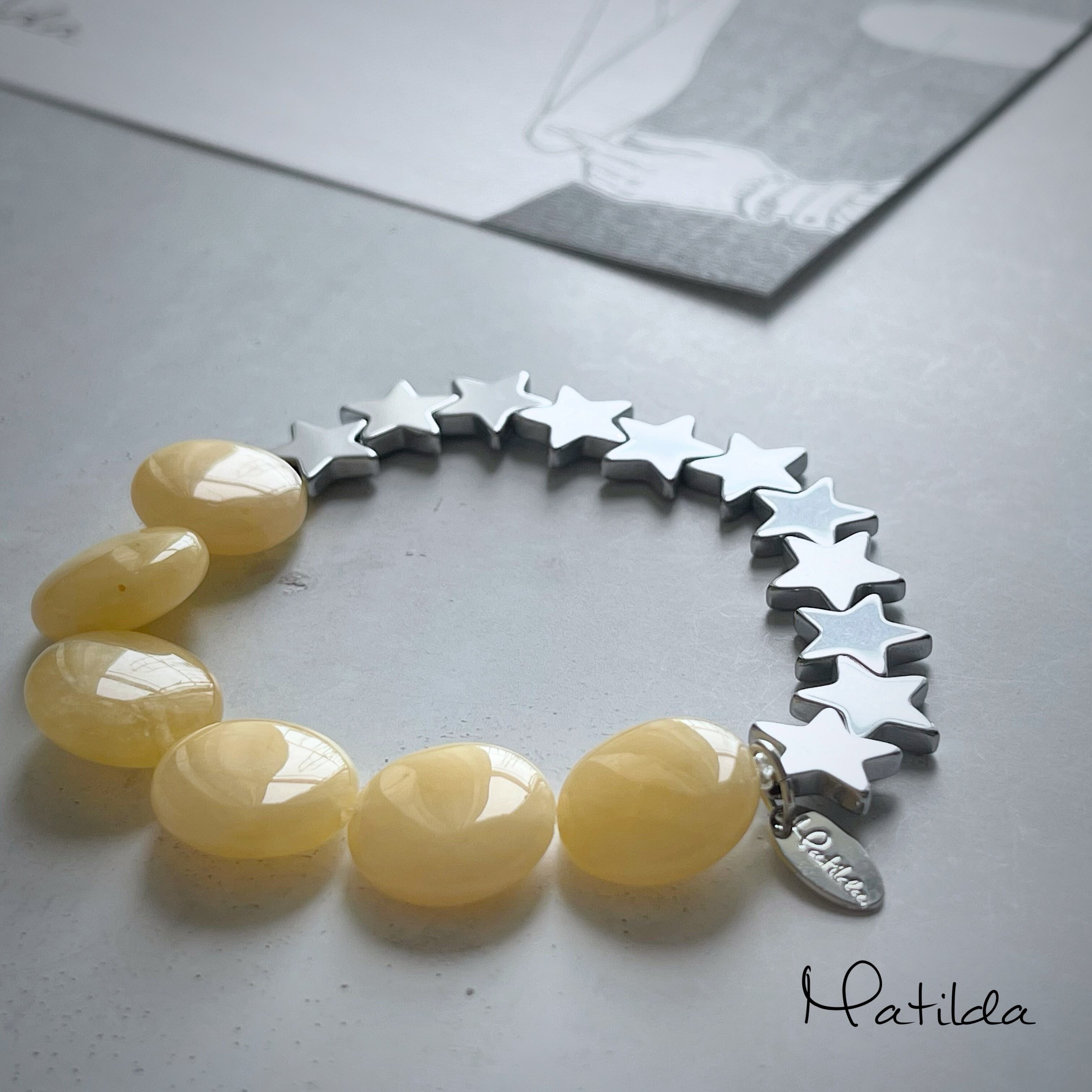 おはじきのような形状がキュートなイエロージェイドのブレスレット。