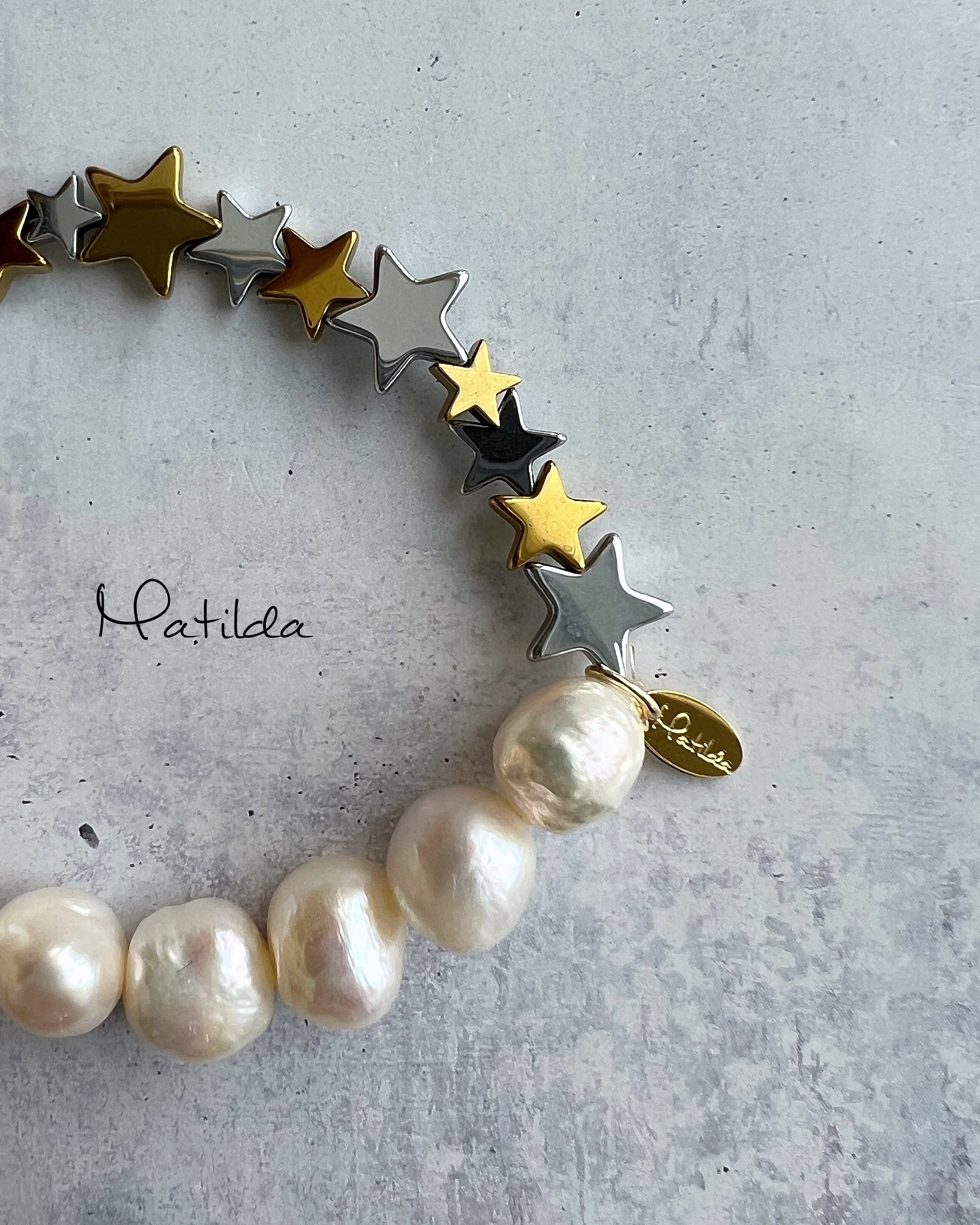 ふっくらと豊かな曲線が艶かしい淡水パールに、ゴールドとシルバーのヘマタイトスターを大小とり混ぜてペアリングし、エレガンスの中にひと癖ある遊び心を添えて。