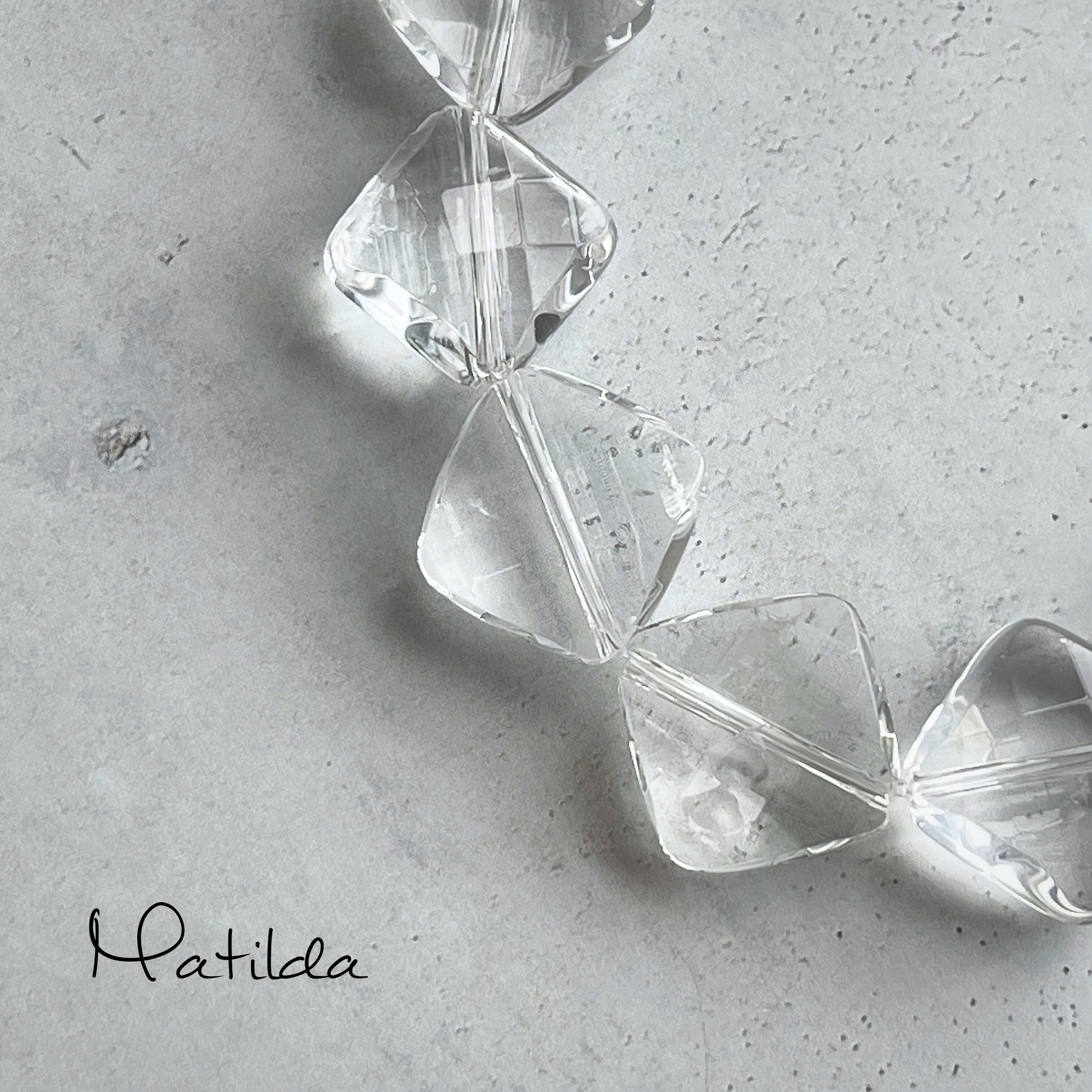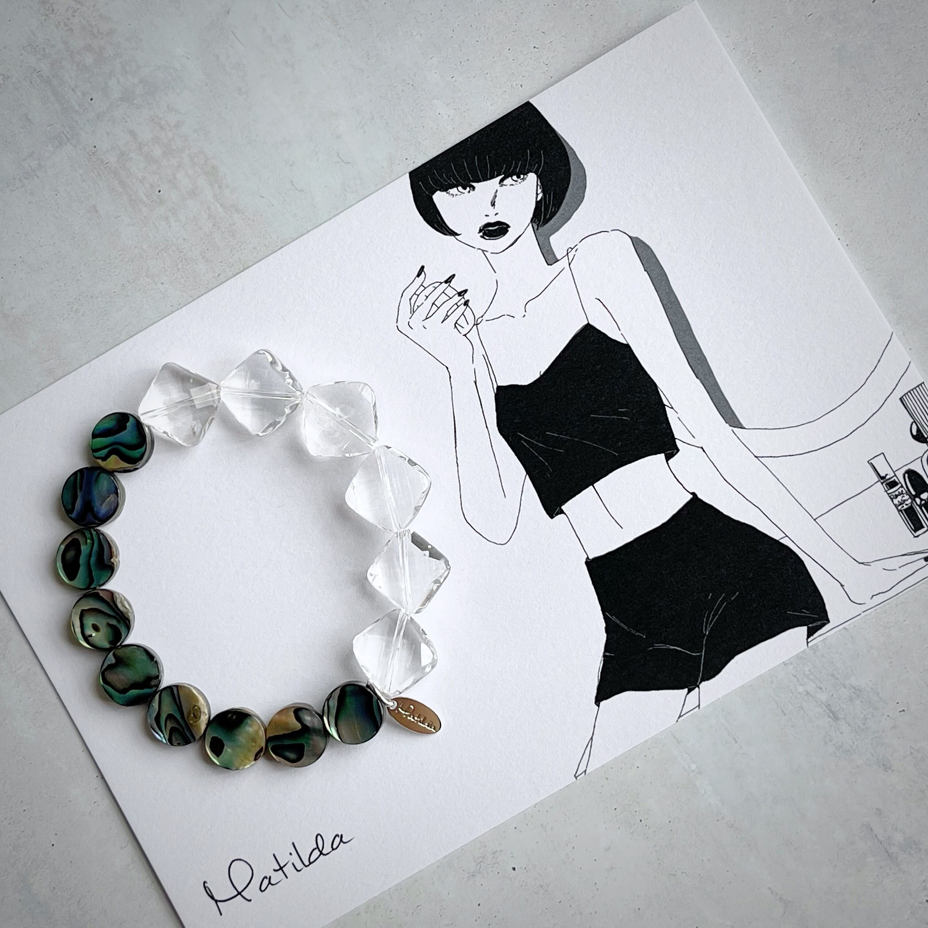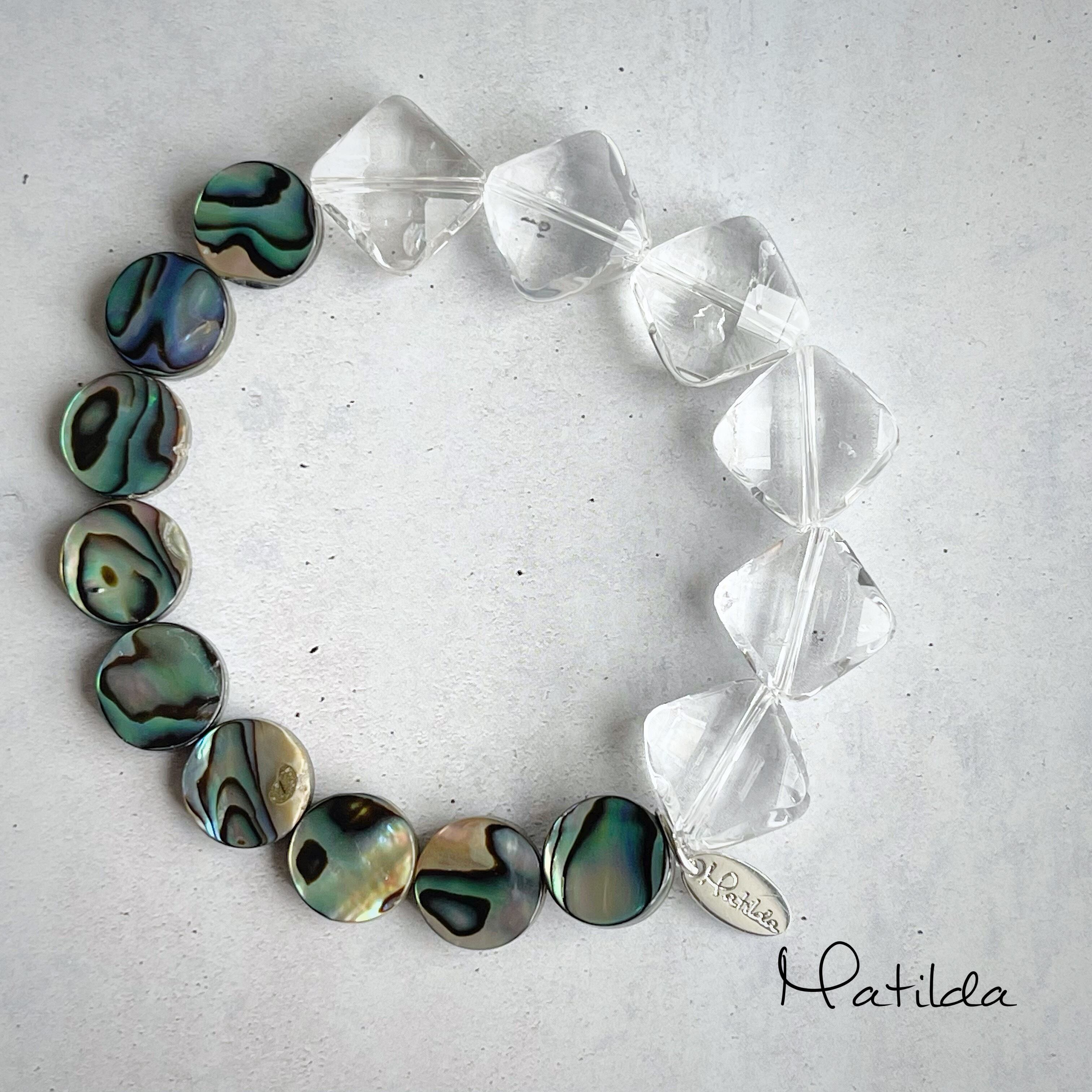 虹色を纏ったアバロンシェルと、カットが施されたスクエアのクリスタル。