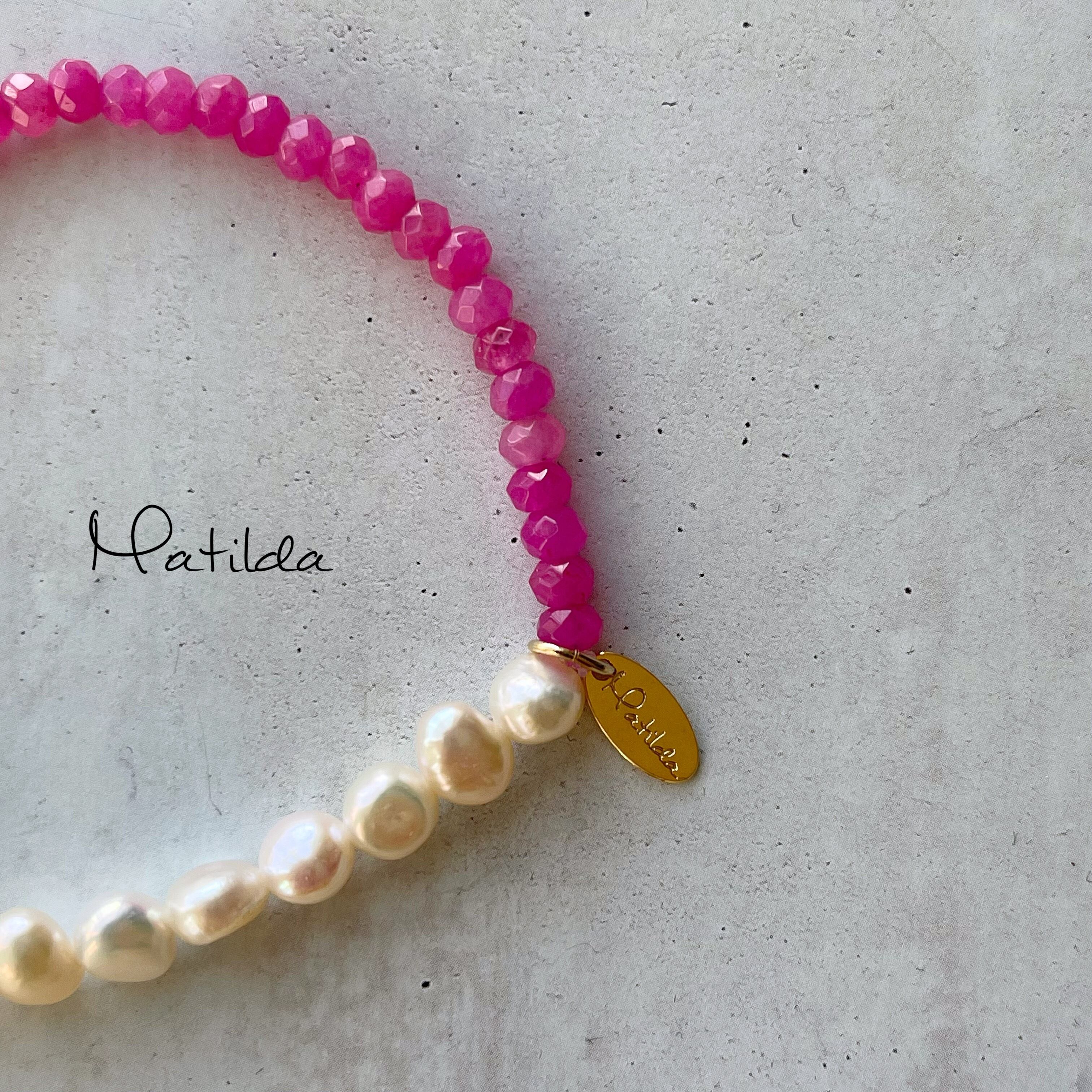 当店で人気のフューシャピンクジェイドを小粒の淡水パールと組み合わせて。