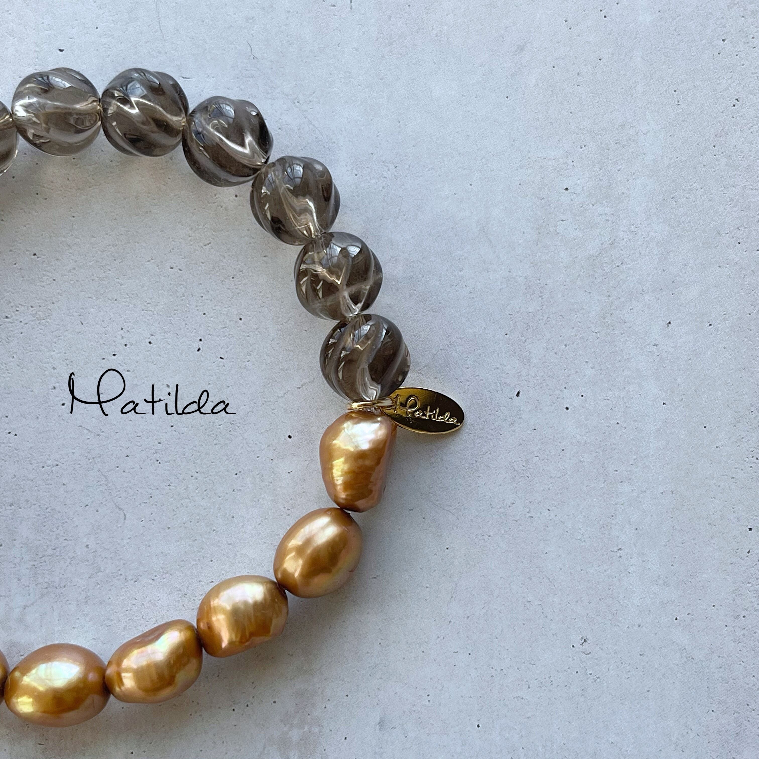 カットが美しいスモーキークォーツと、ゴールドカラーの大粒淡水パール。