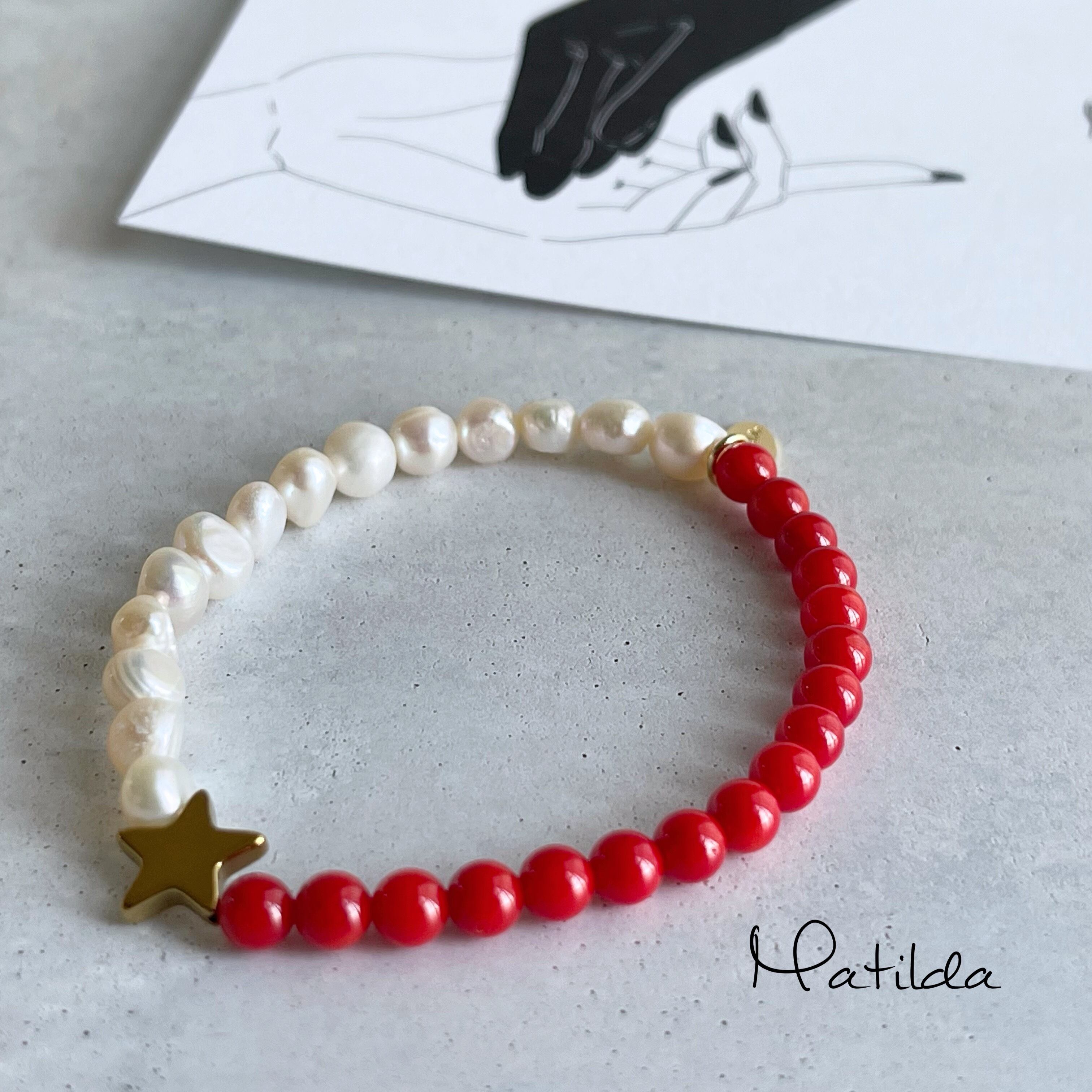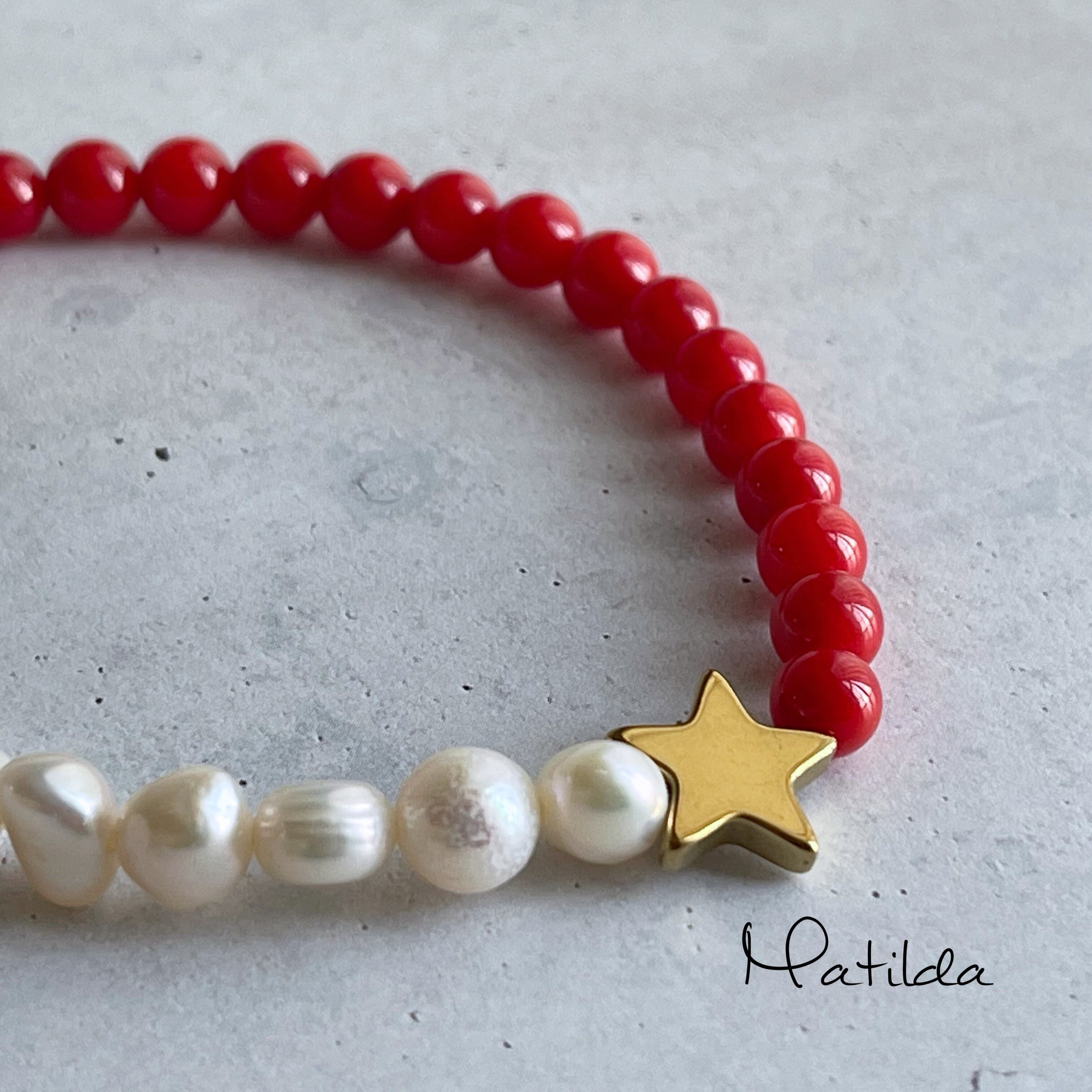淡水パールとコーラルのブレスレットに、ゴールドの星をワンポイントに。